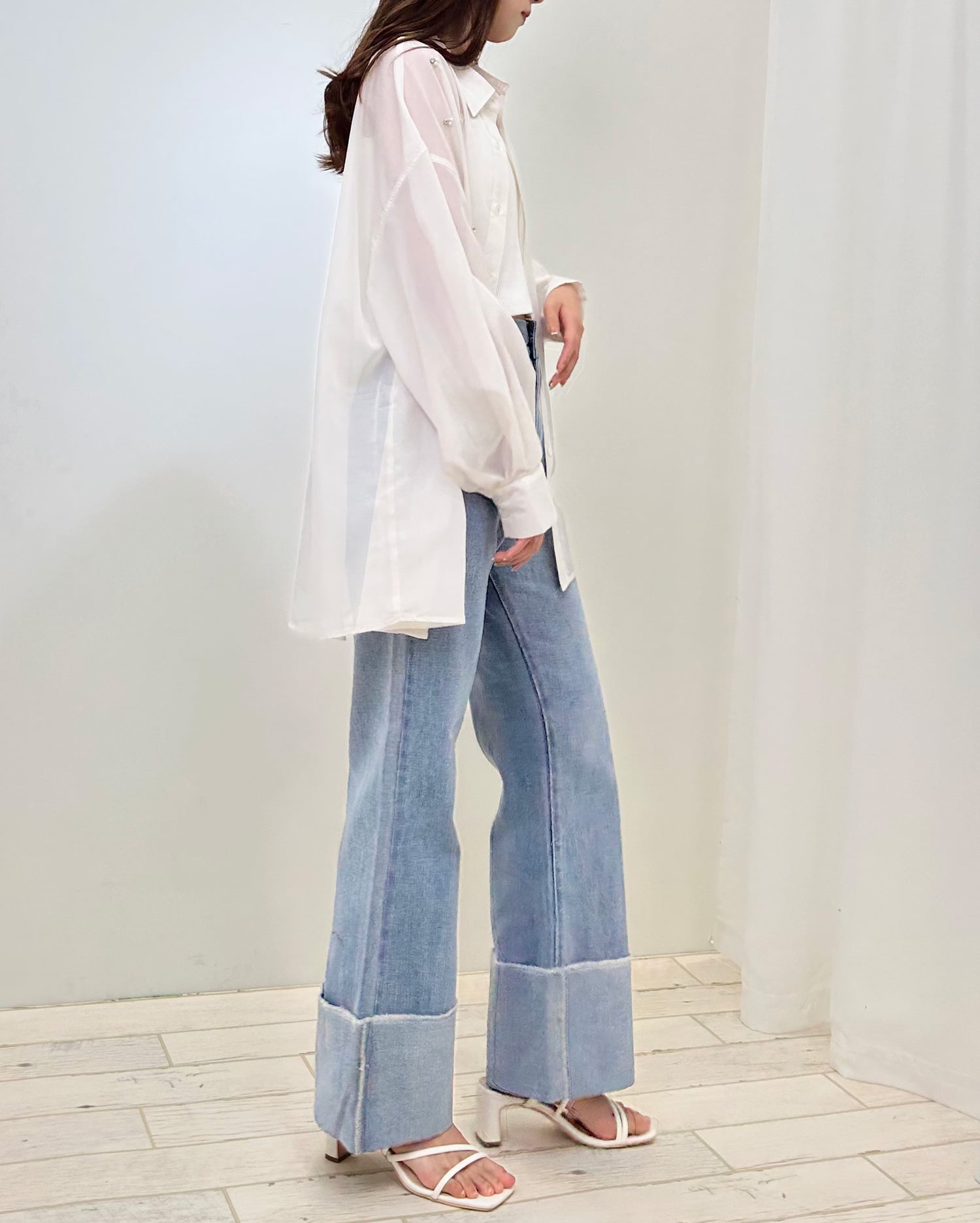 透け感のあるシアーシャツはインナーによって表情を変え、さまざまなレイヤードスタイルが楽しめます。
