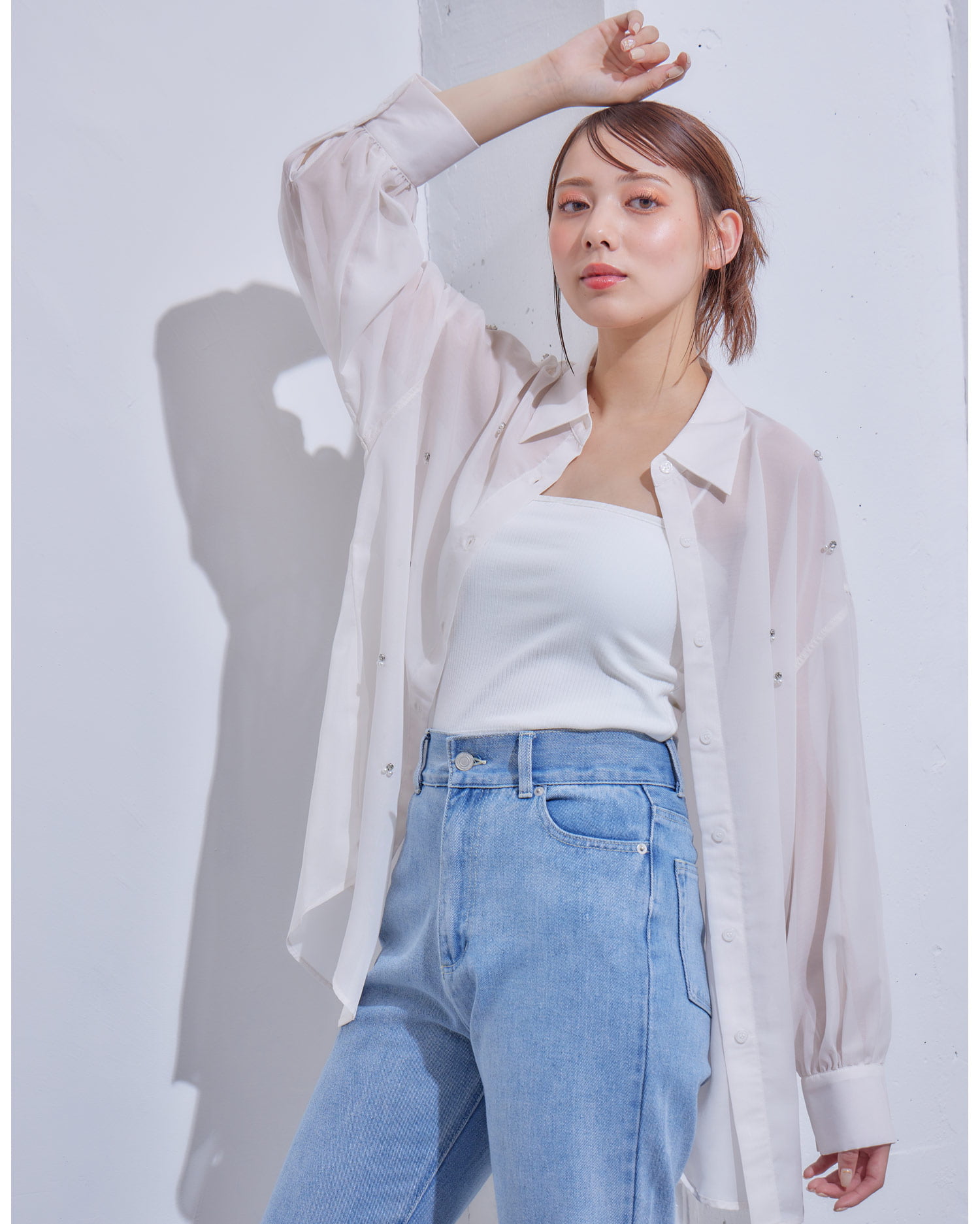 全体にビジューが散りばめられた華やかなシアーシャツ。