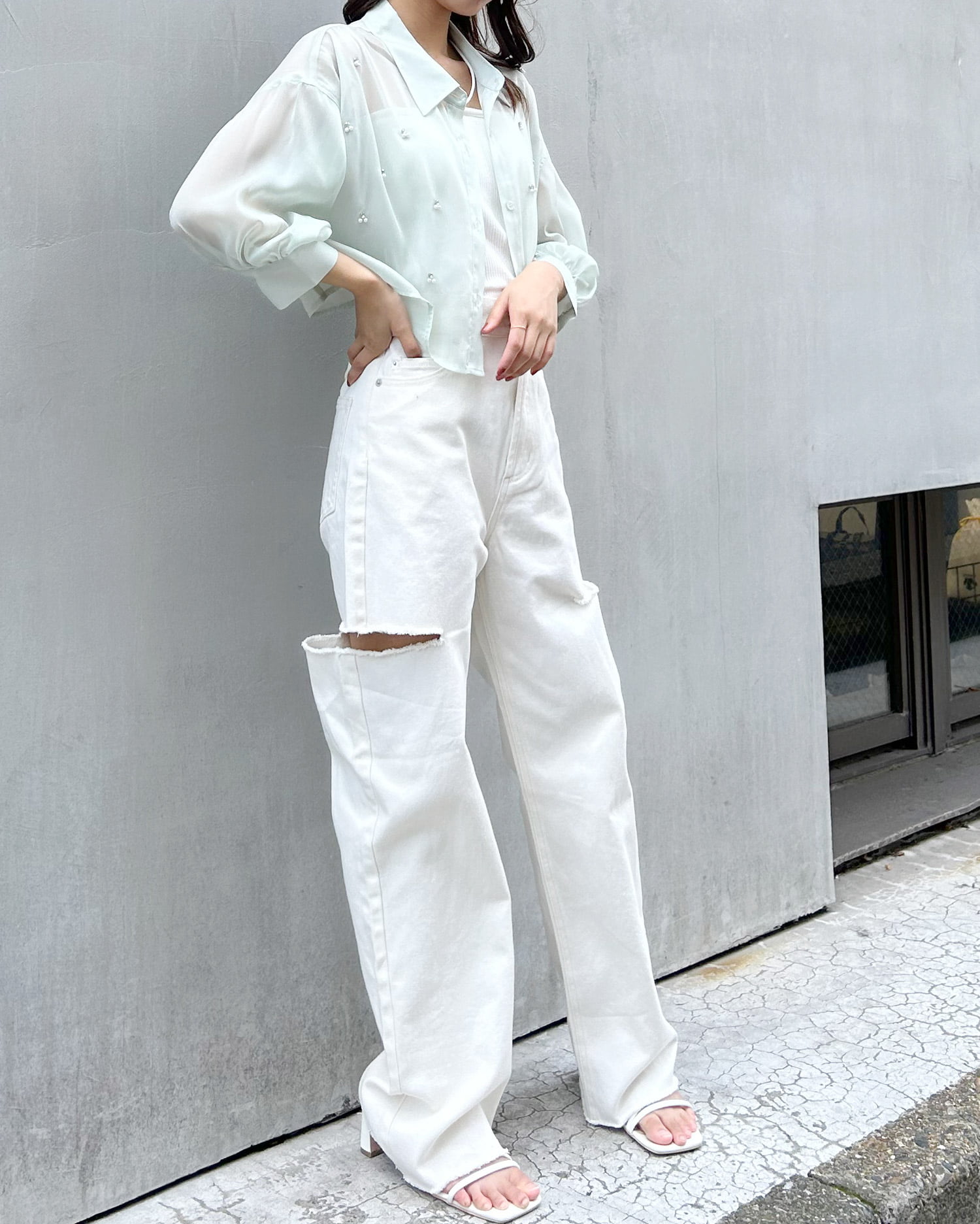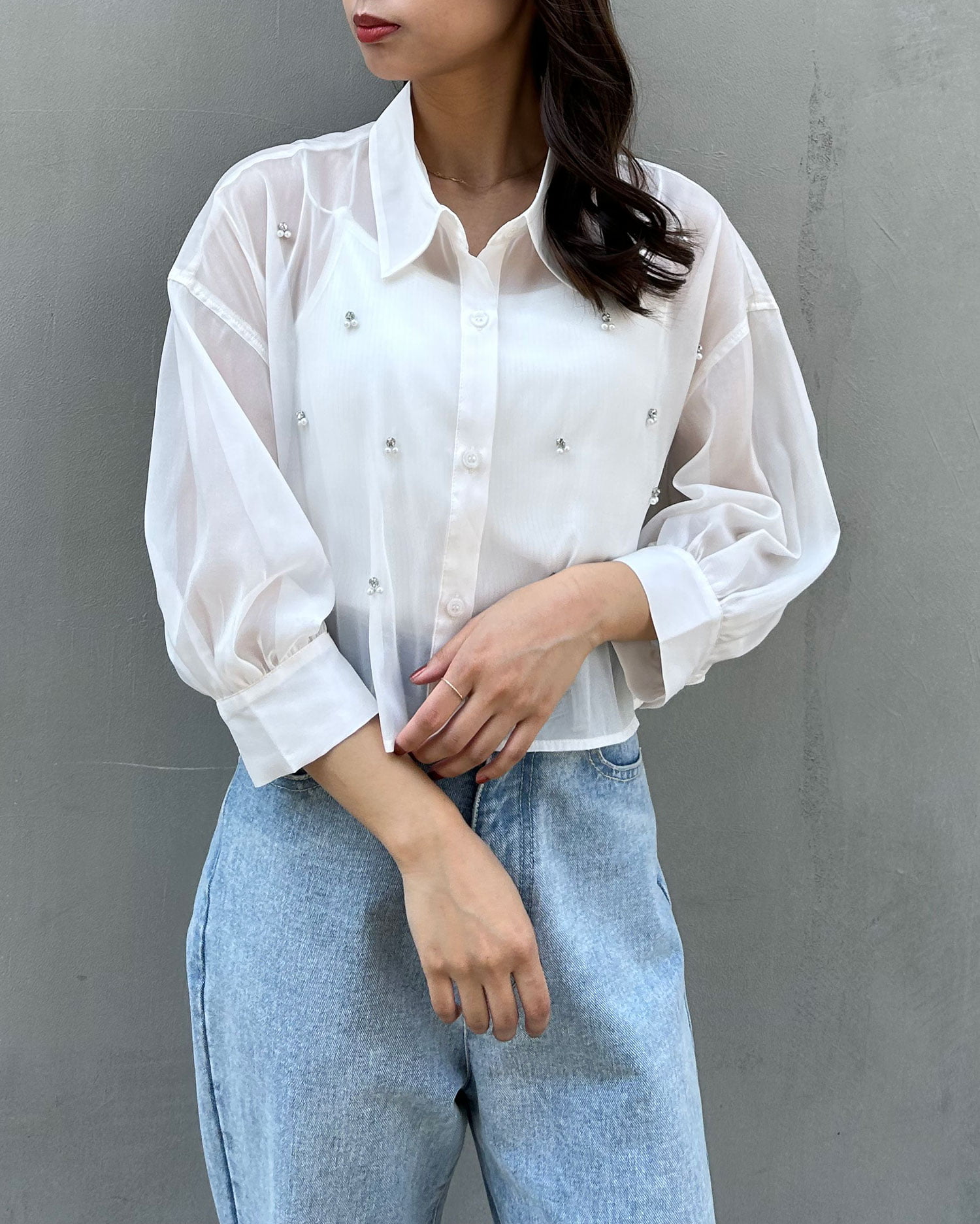 【装飾付きのシアーシャツで華やかなトレンドスタイルに】