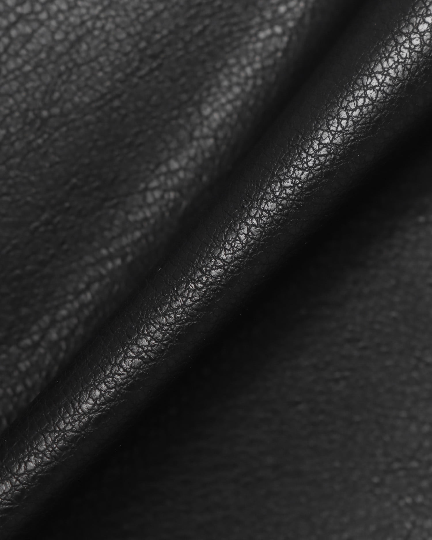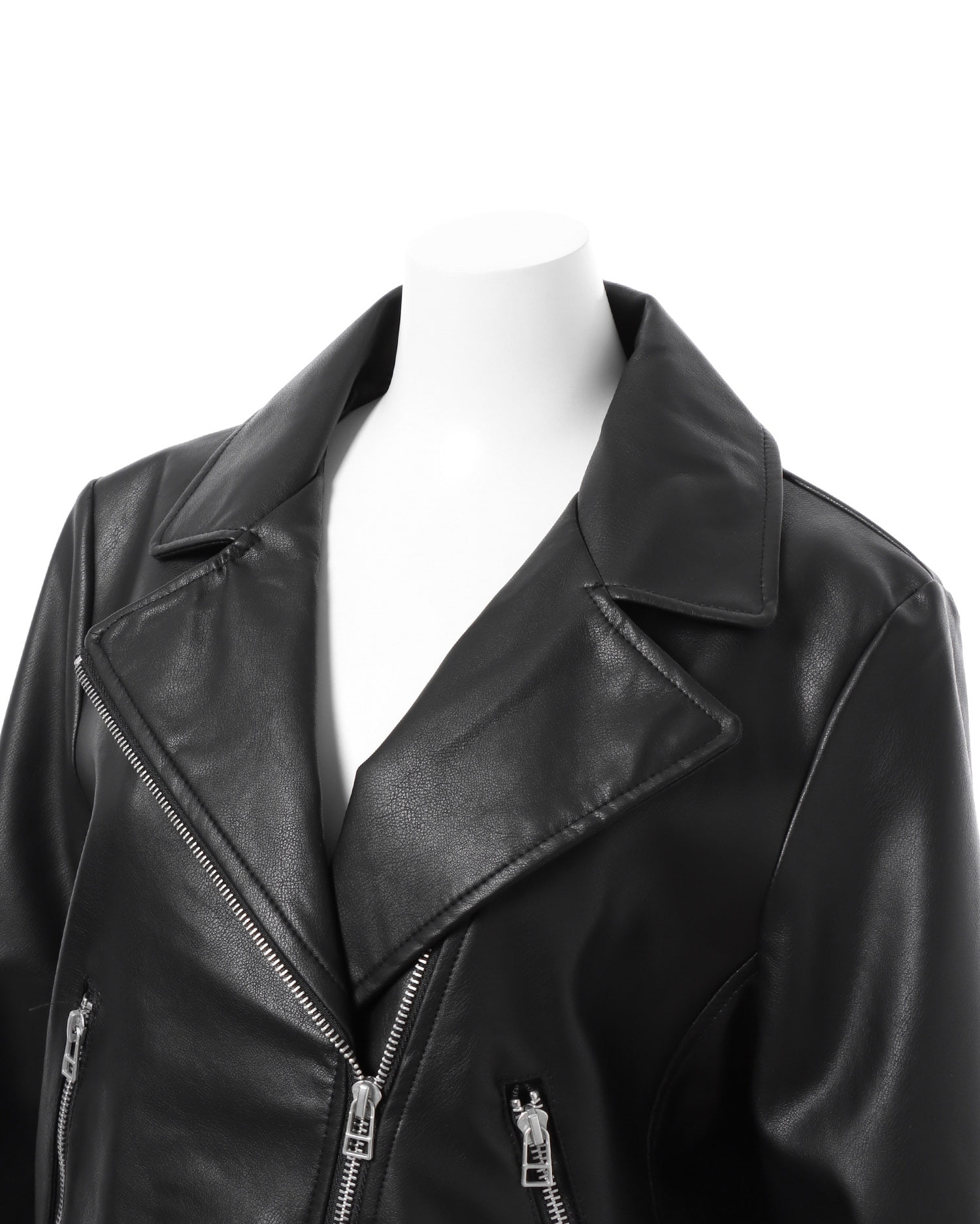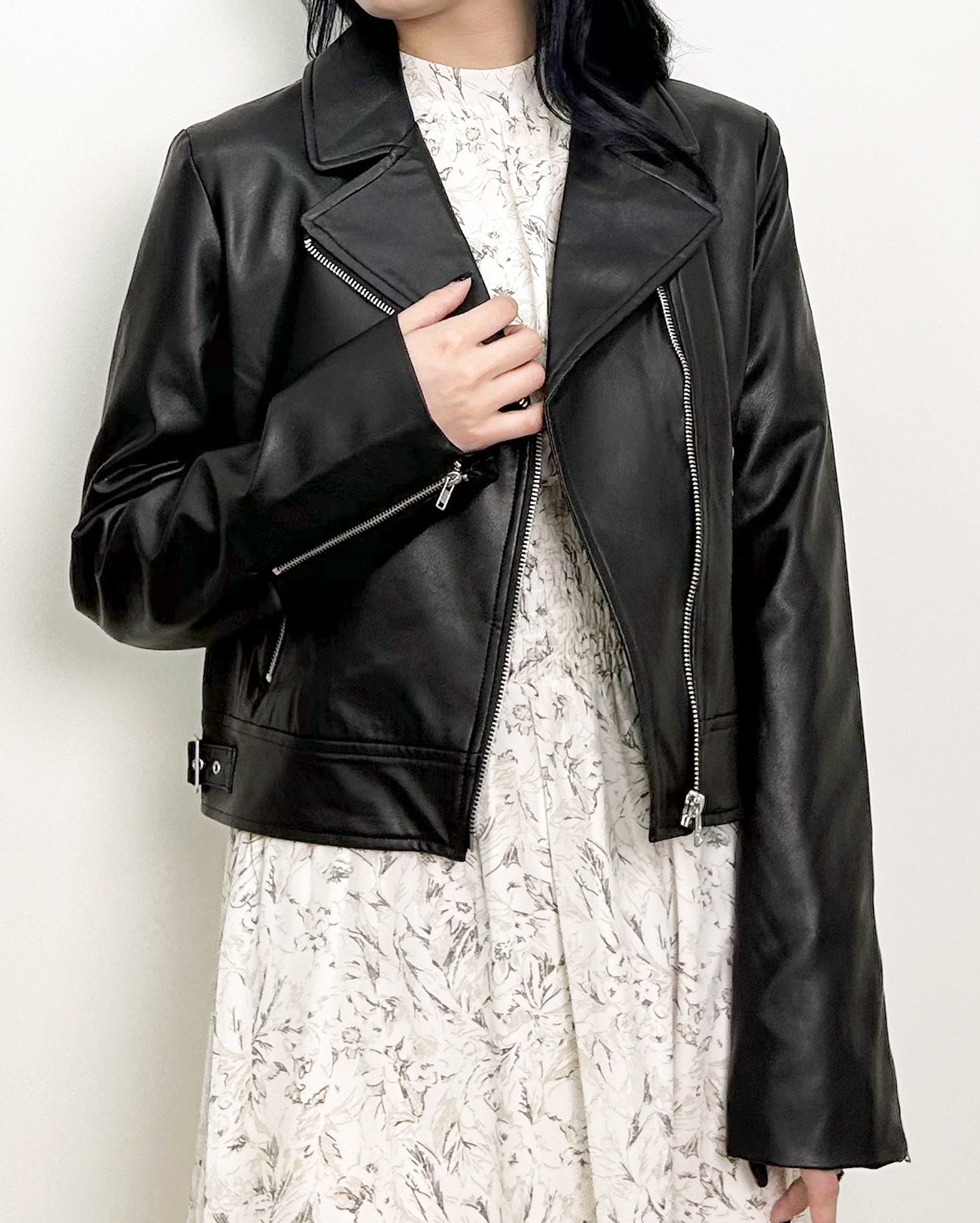 しなやかなフェイクレザーで仕立てたショート丈のライダースジャケット。