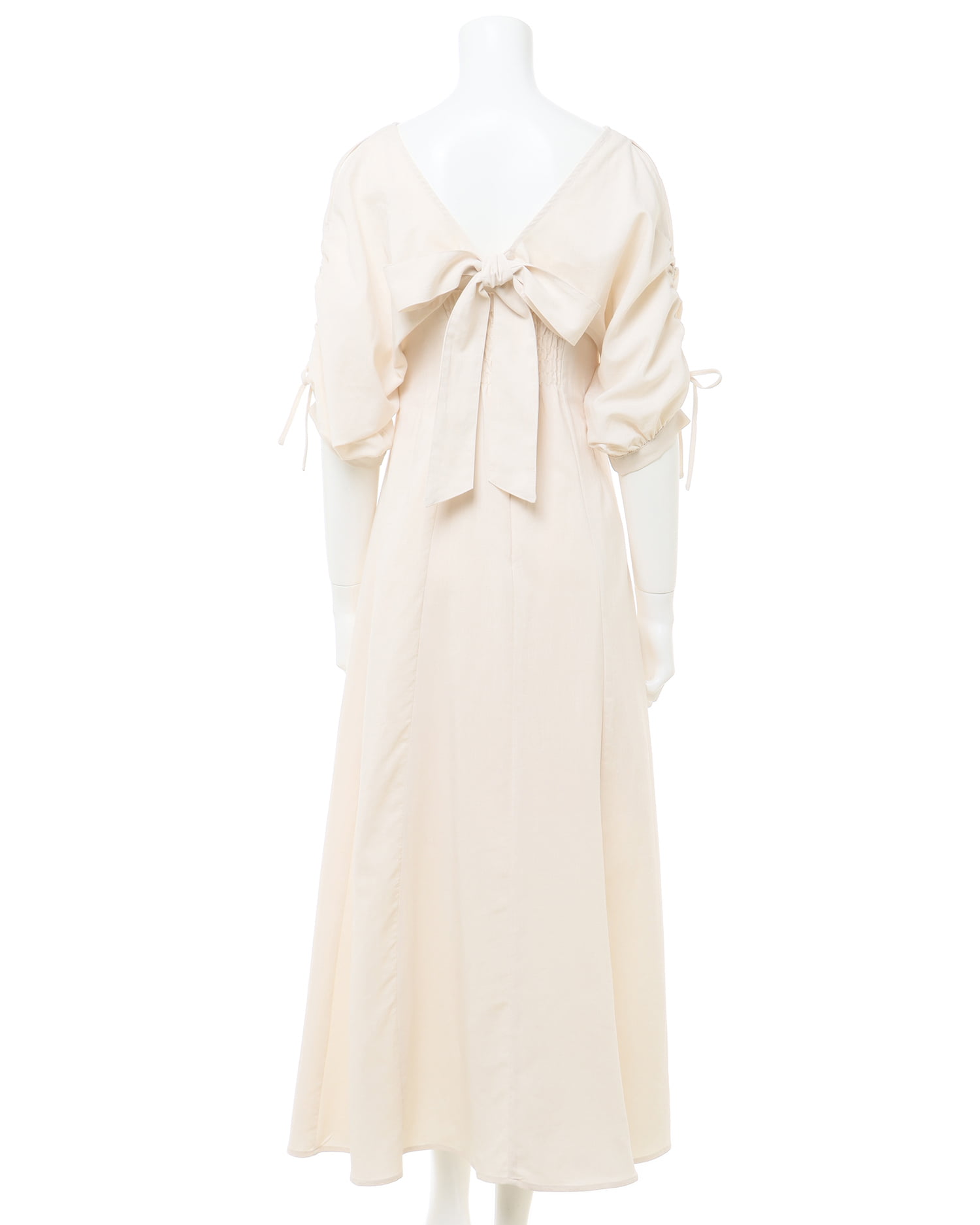 ・トップスのバックにあしらったリボンと、ヘルシーな肌見せが女性らしいデザイン。