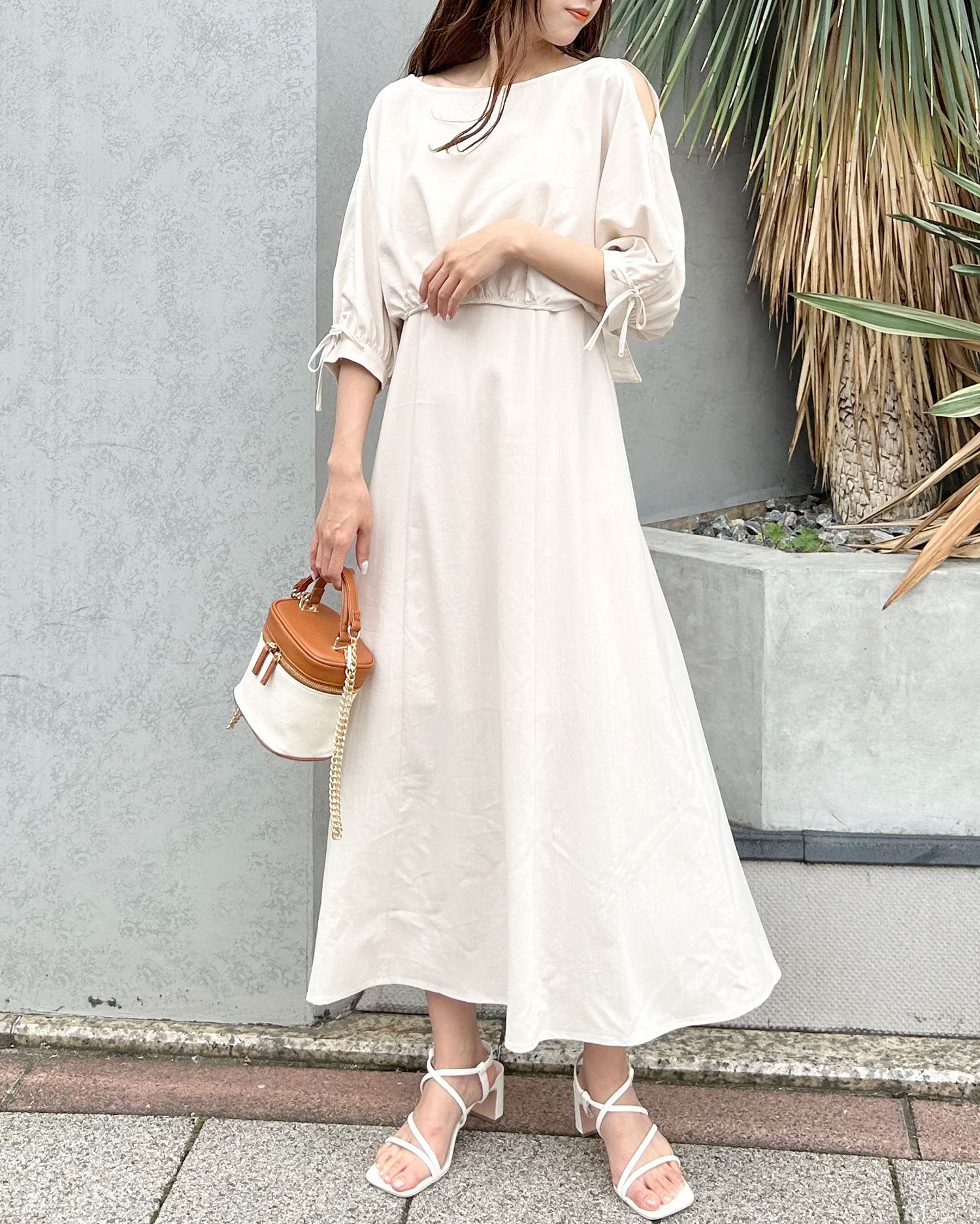 ワンピースは、高めのウエストラインから広がるフレアデザインで上品な雰囲気。