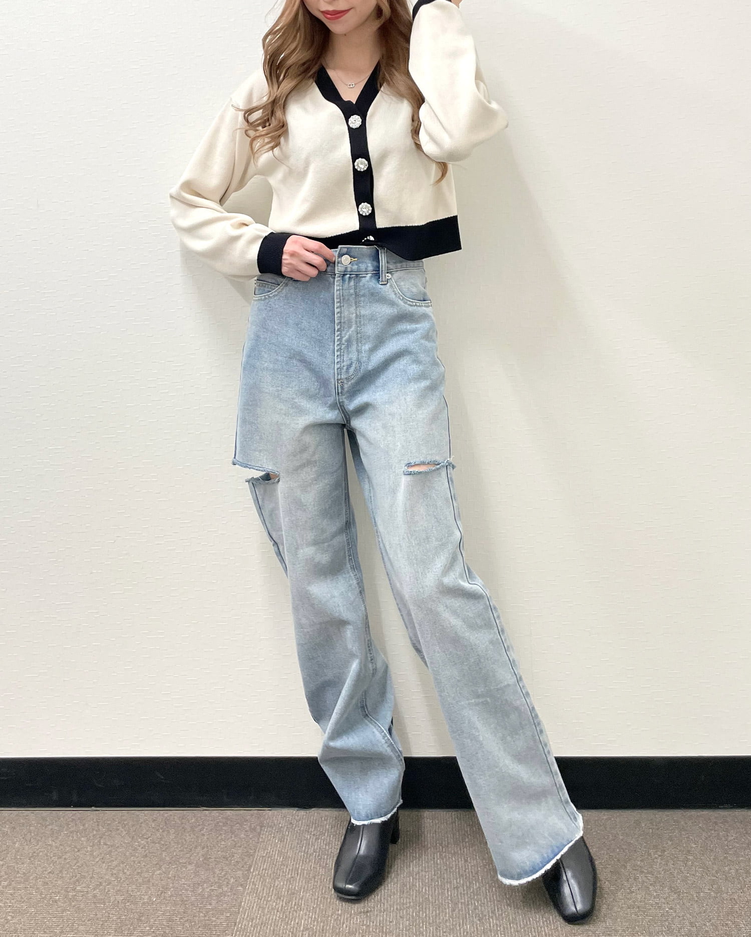1つ1つデザインの違うビジューボタンを散りばめて華やかなアクセントにしています。