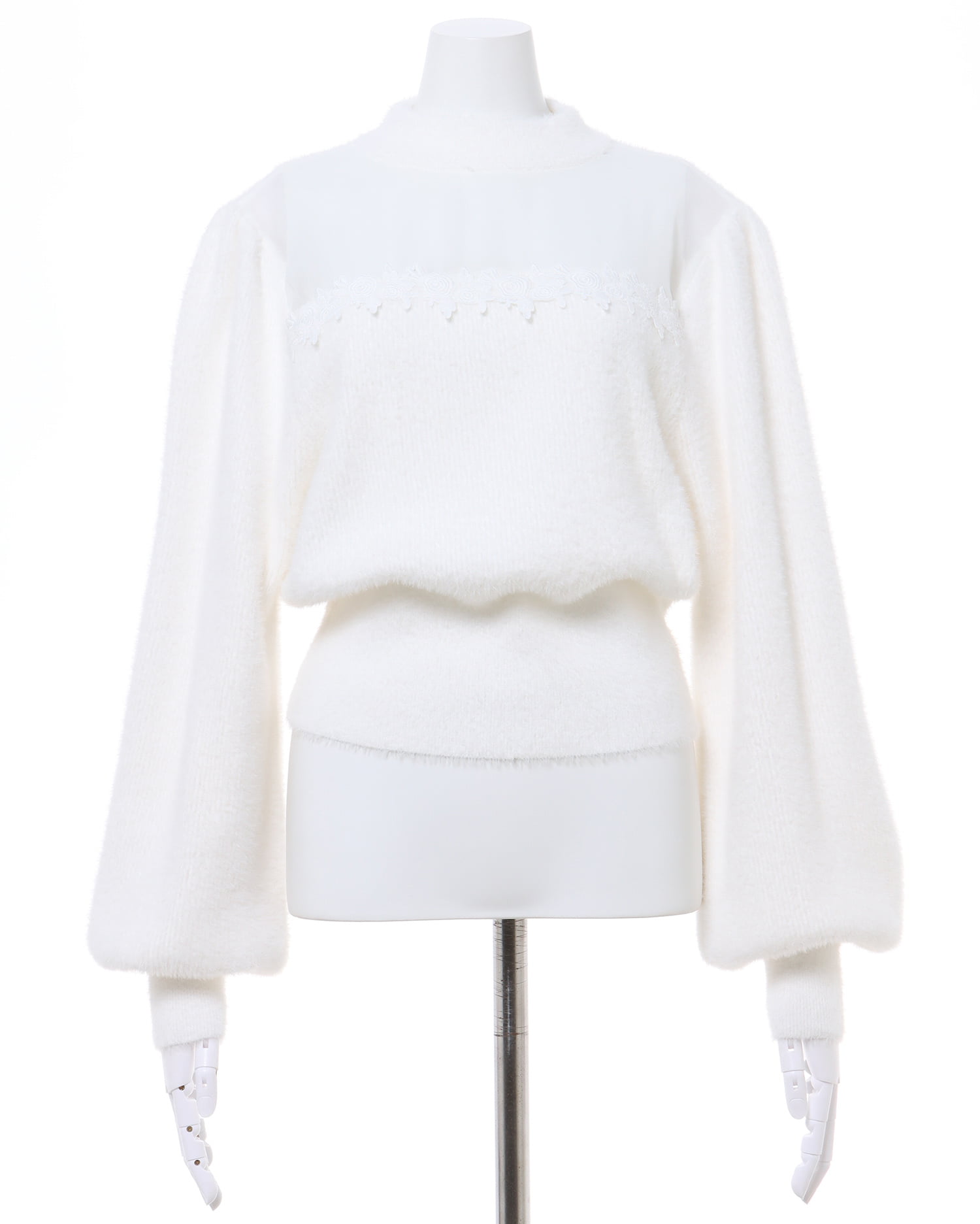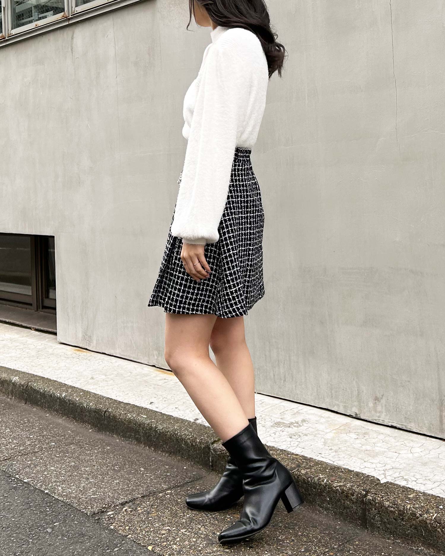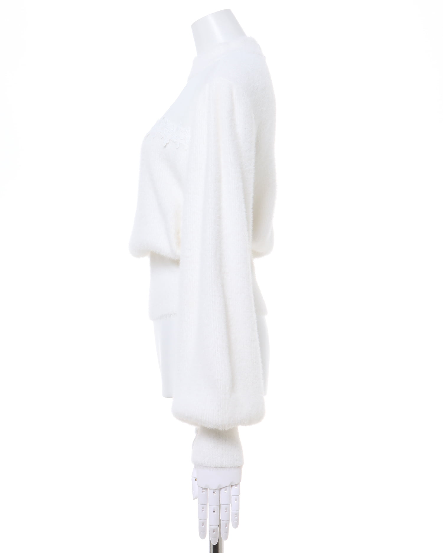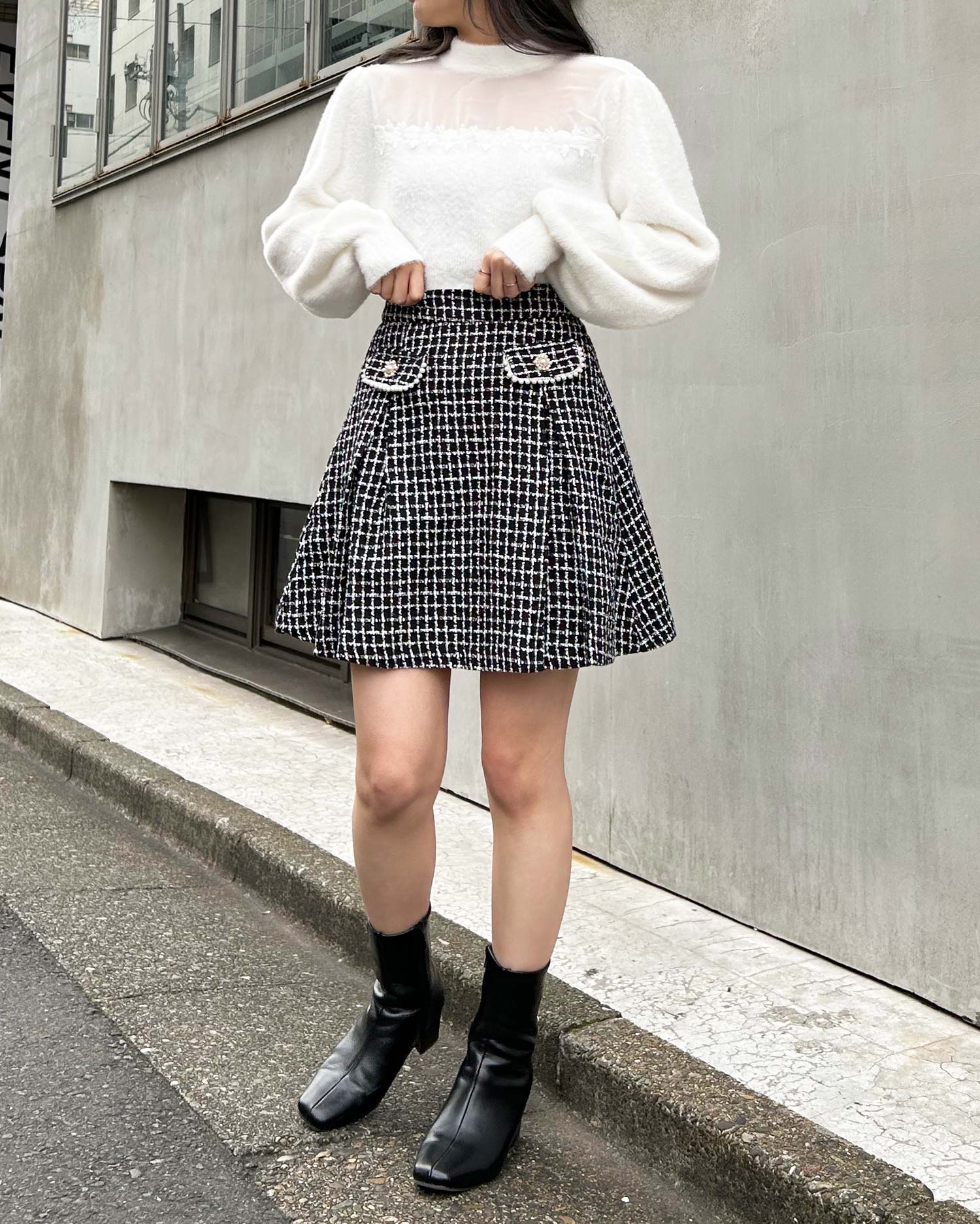 毛足の長いフェザーヤーンニットでスウィートコーデが完成。