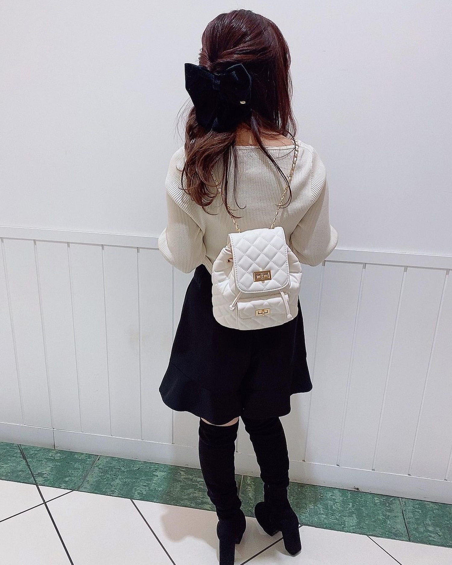 ・ミニボトムを合わせたスタイリングはロングブーツで露出量を調整するとバランスが取りやすい◎トレンドライクにも着こなせます。