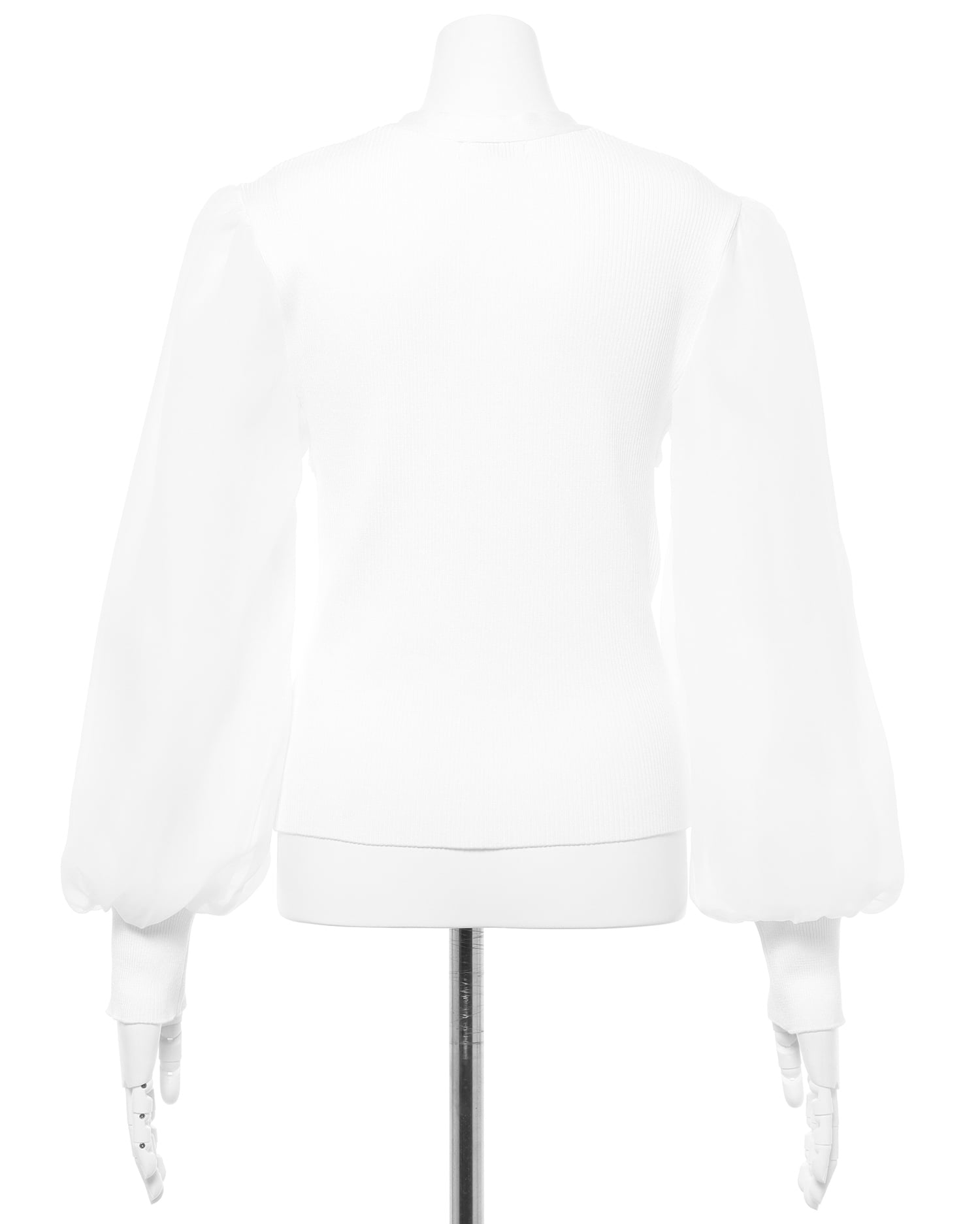 透け感のあるシアー素材で切り替えたボリュームスリーブが印象的なニット。