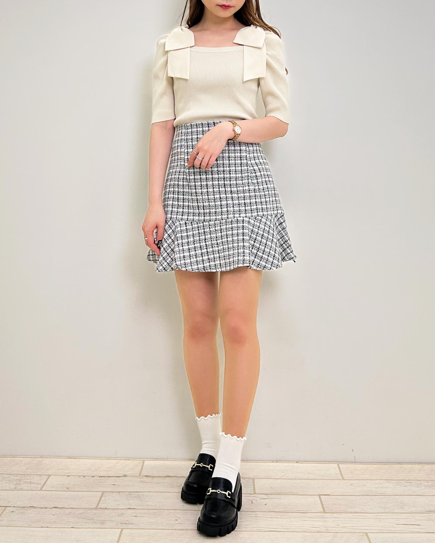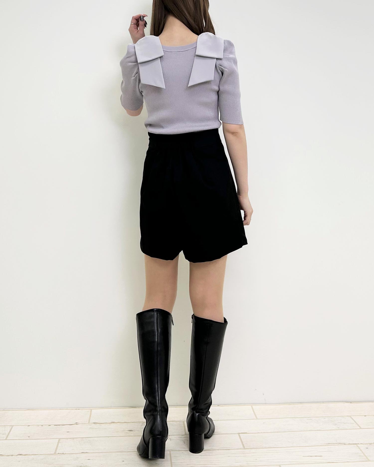 1231-900106 スクエアネック異素材肩リボン5分袖ニット