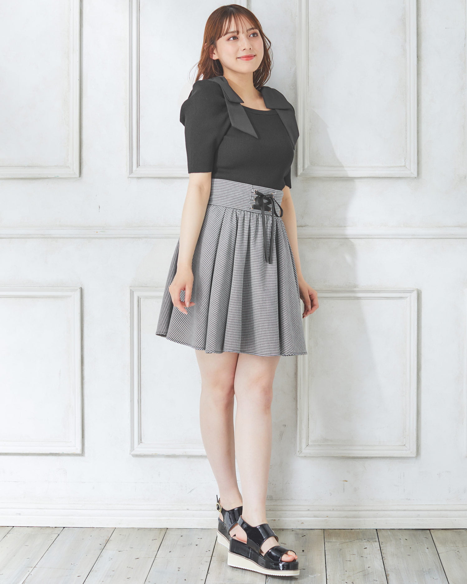 • INGNI(イング) スクエアネック異素材肩リボン5分袖ニット クロ