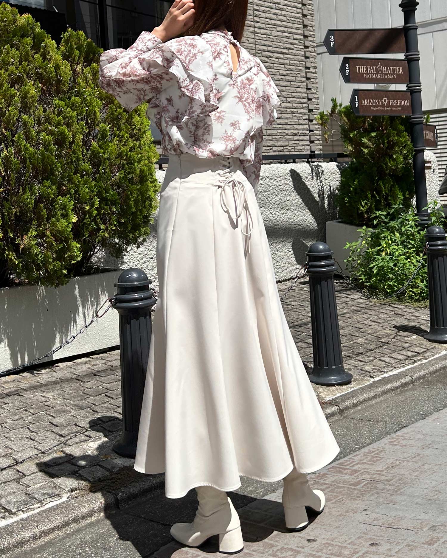 大人レディなスタイルが完成するフラワープリントのブラウス。