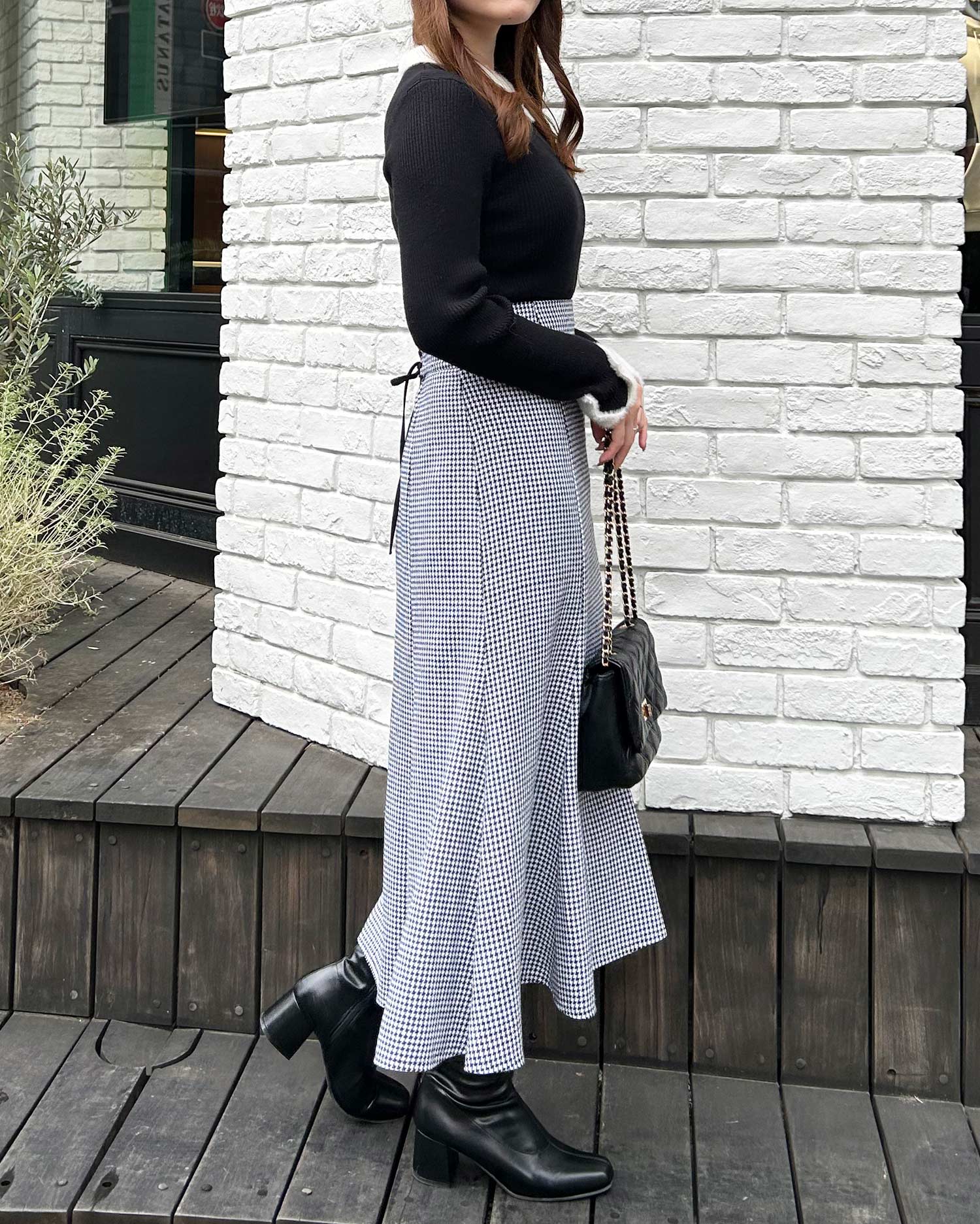 ・タイトすぎないマーメイドシルエットなので、上品にもガーリーにも着まわせます。デートやショッピング、カフェシーンにも。