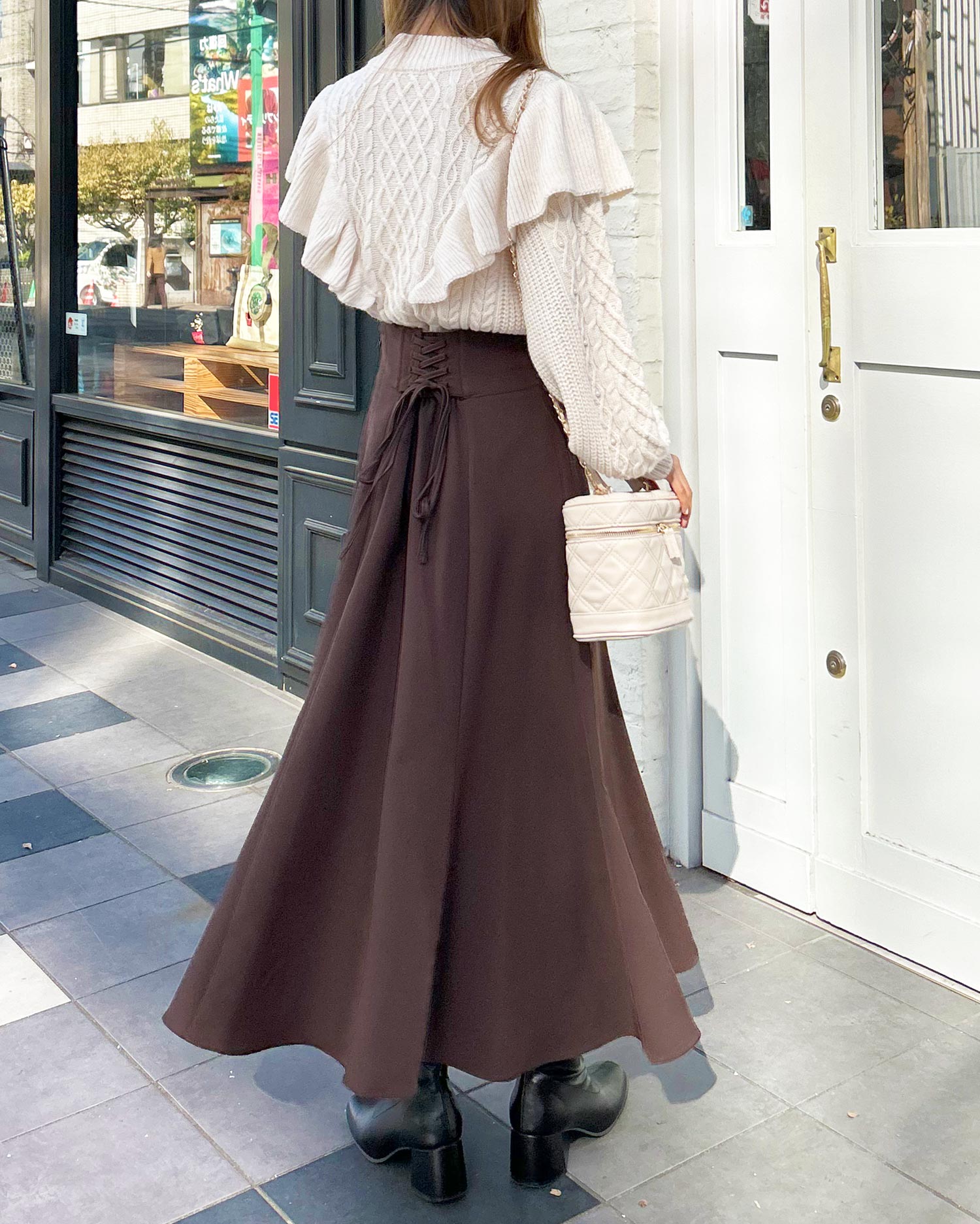 ・バックのレースアップデザインがあるので、トップスはインして着ていただくとどこから見ても可愛く魅せられます。