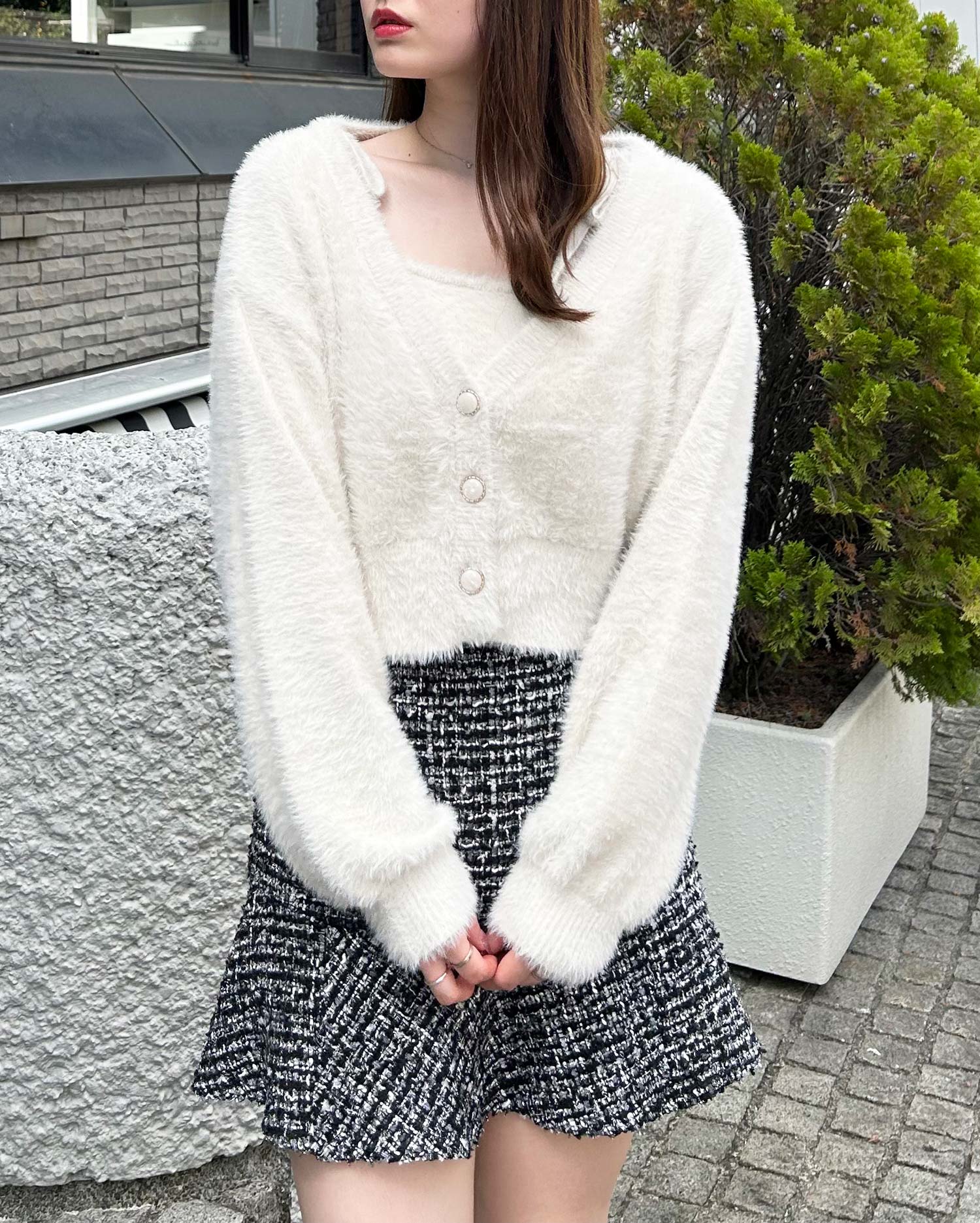 ・ふわふわしたフェザーニットが可愛いカーディガンとキャミのセットアイテム。