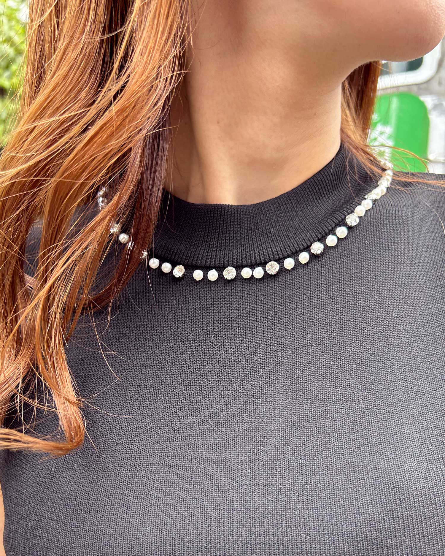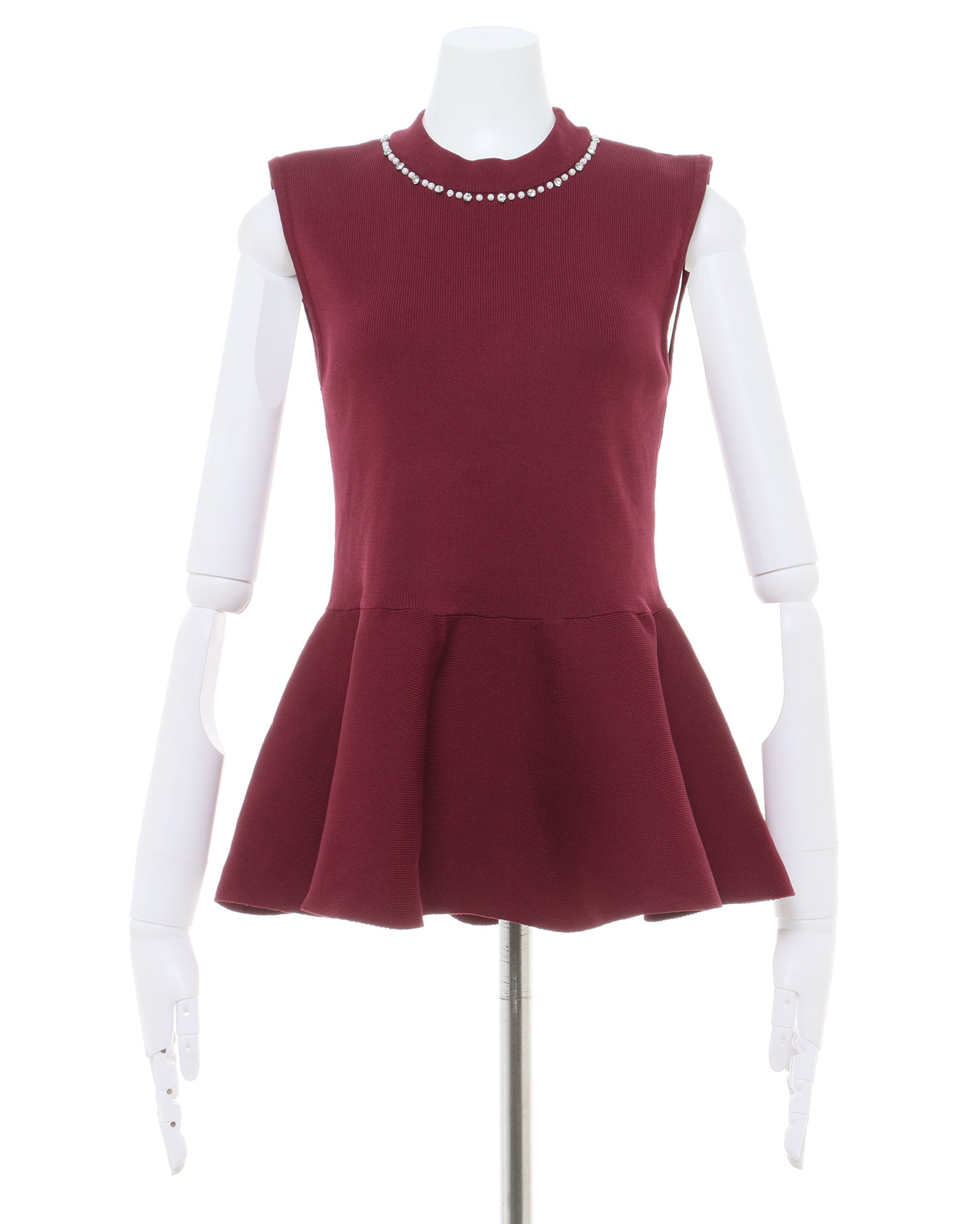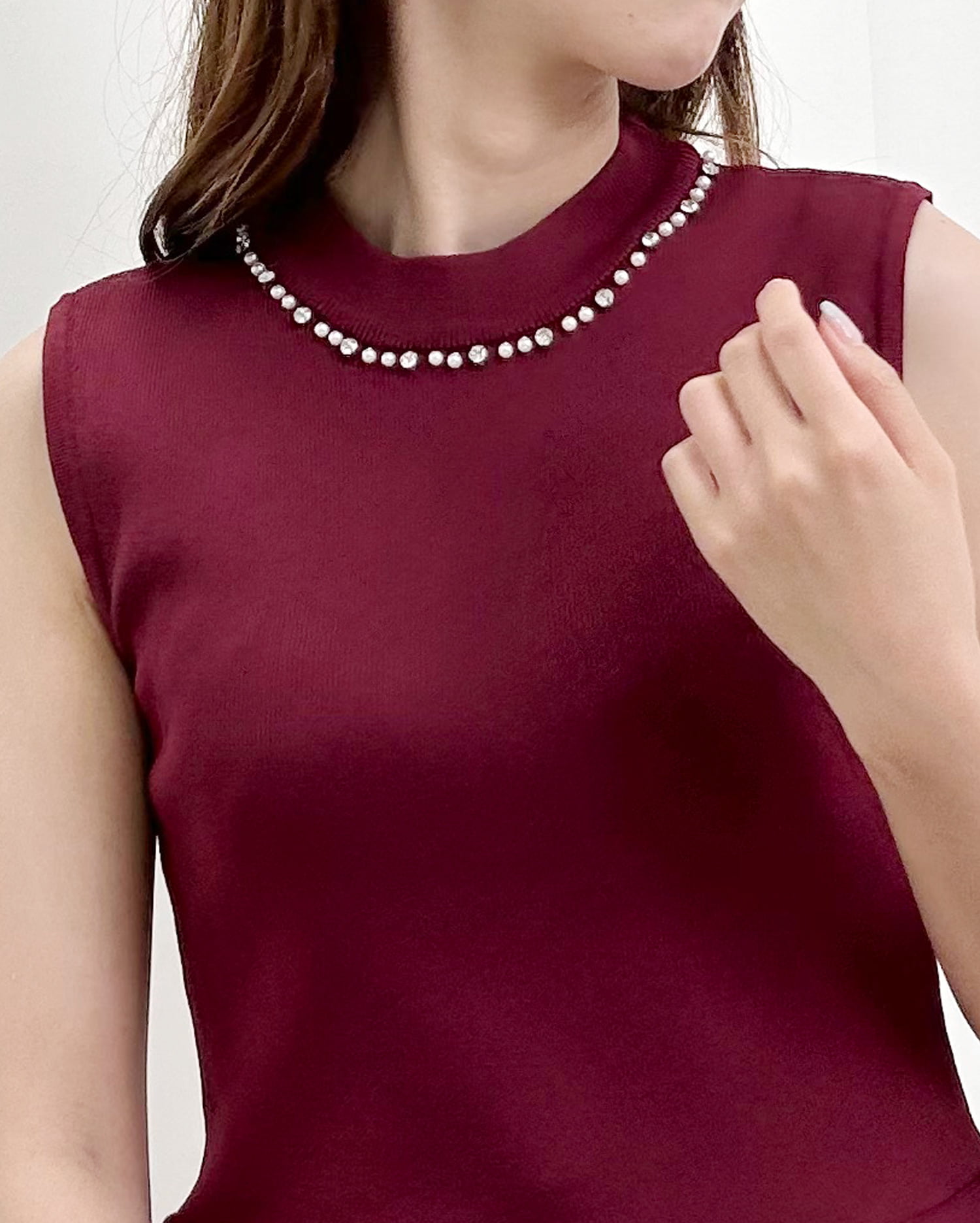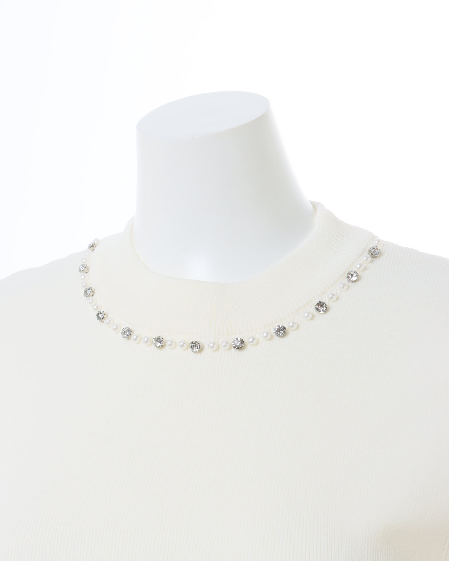 高めのネックラインにビジューをあしらって華やかな雰囲気に仕上げています。