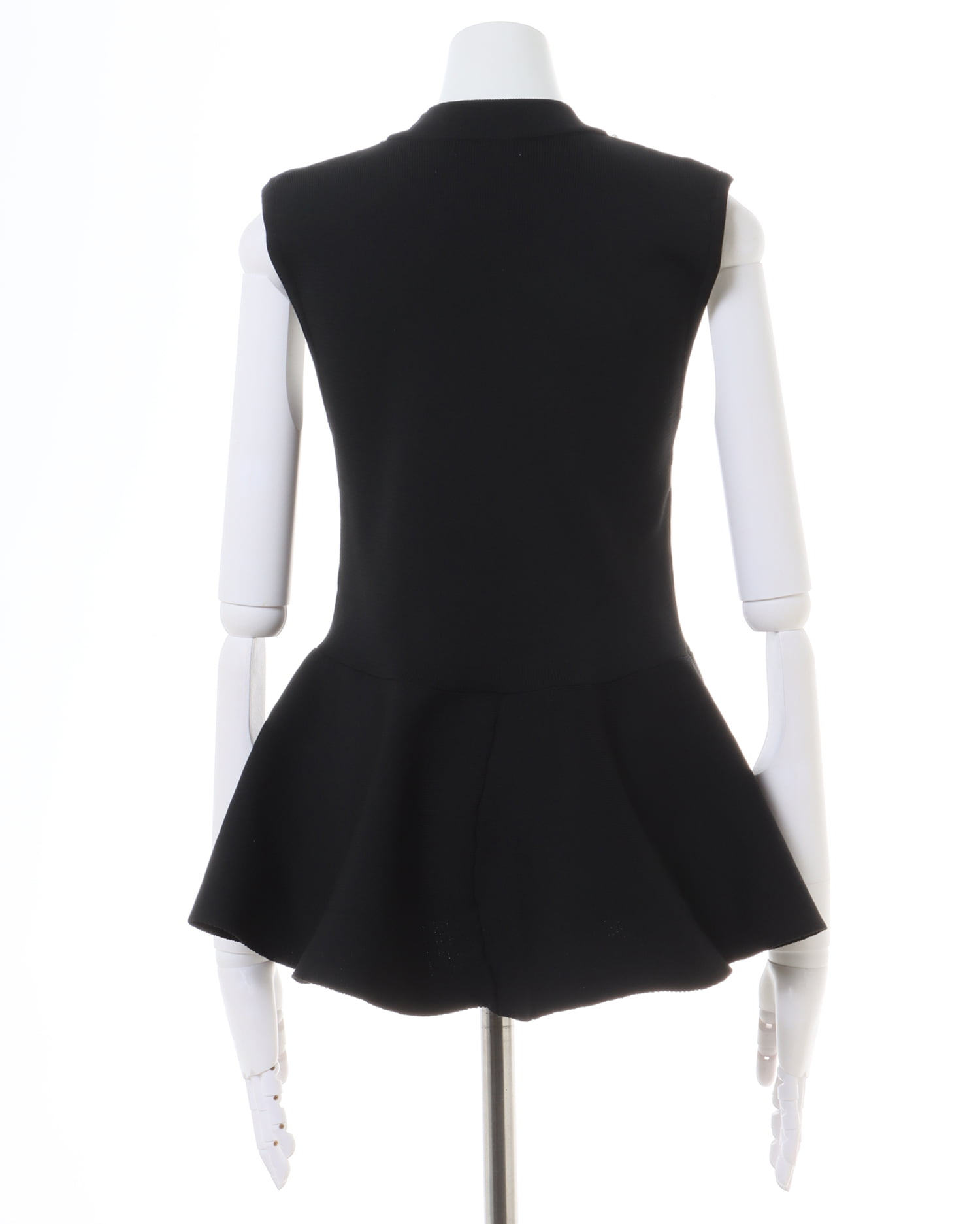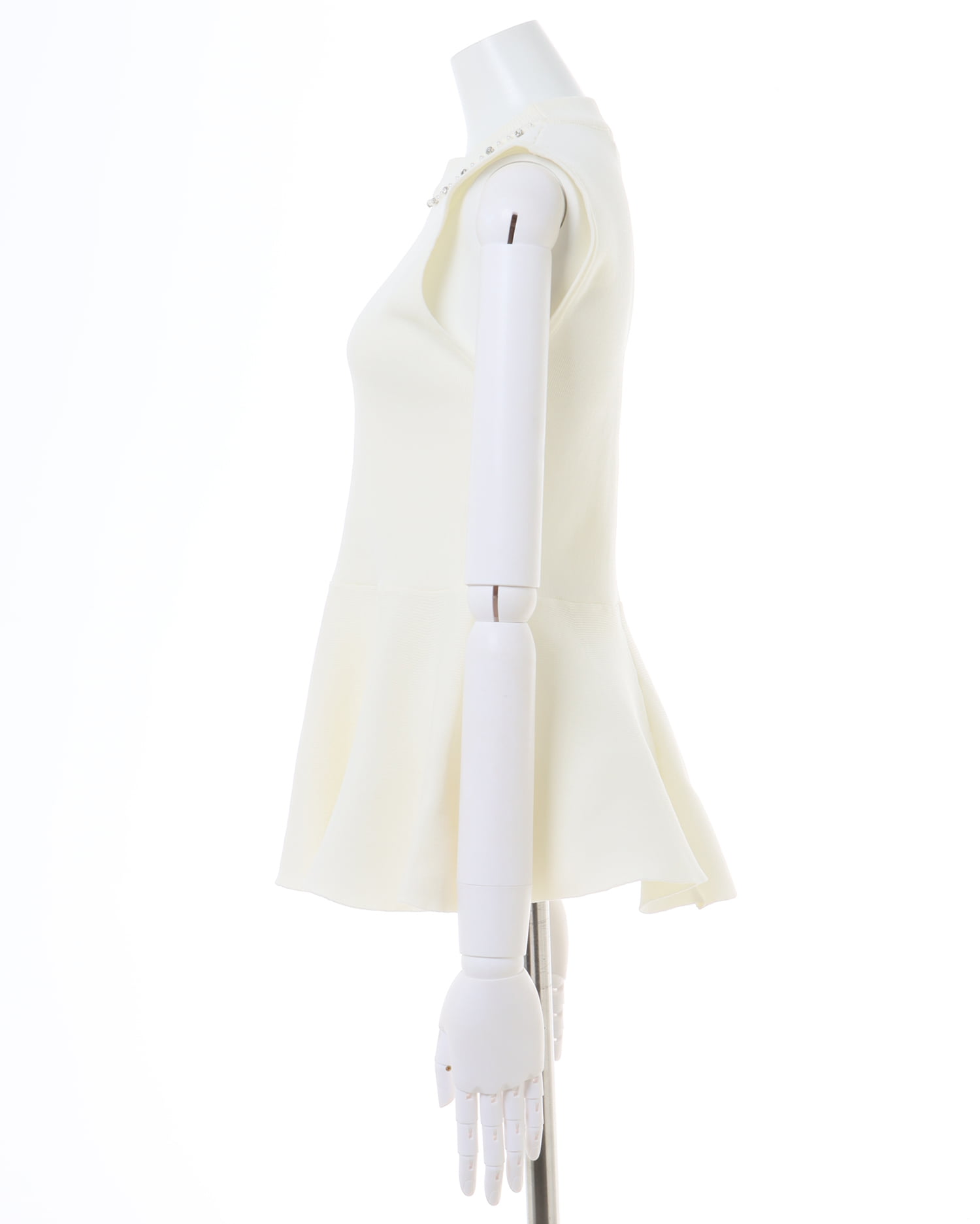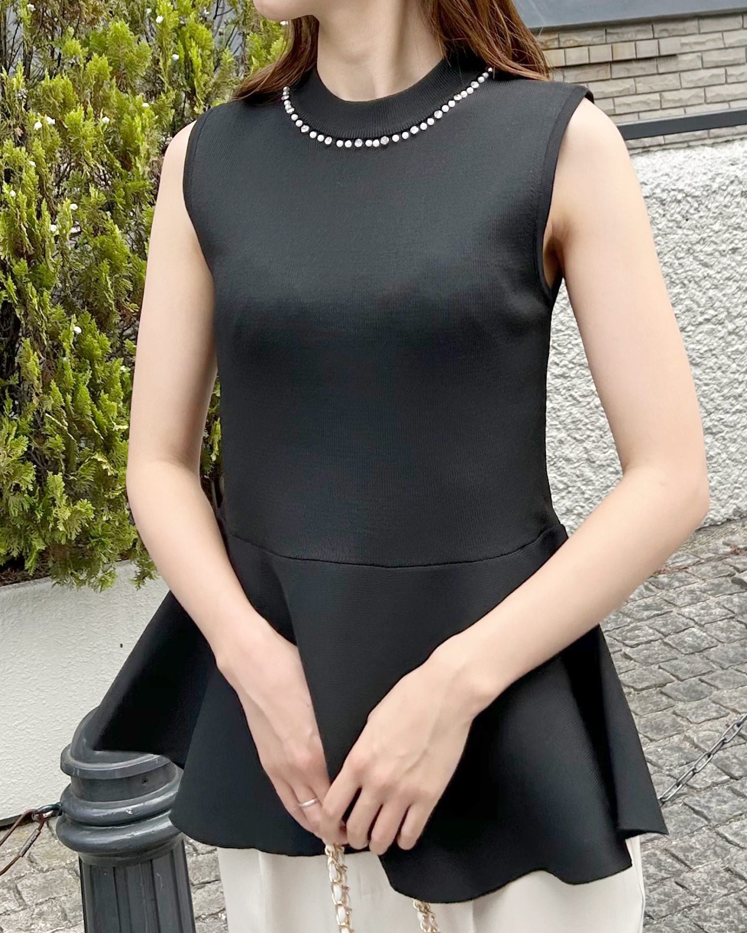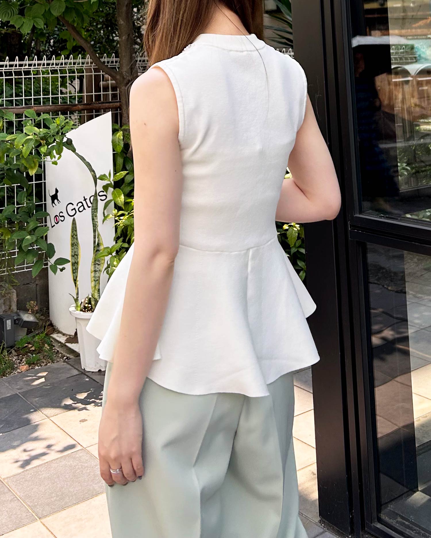 すっきりとしたノースリーブとバスト下で切り替えたペプラムの組み合わせが◎。