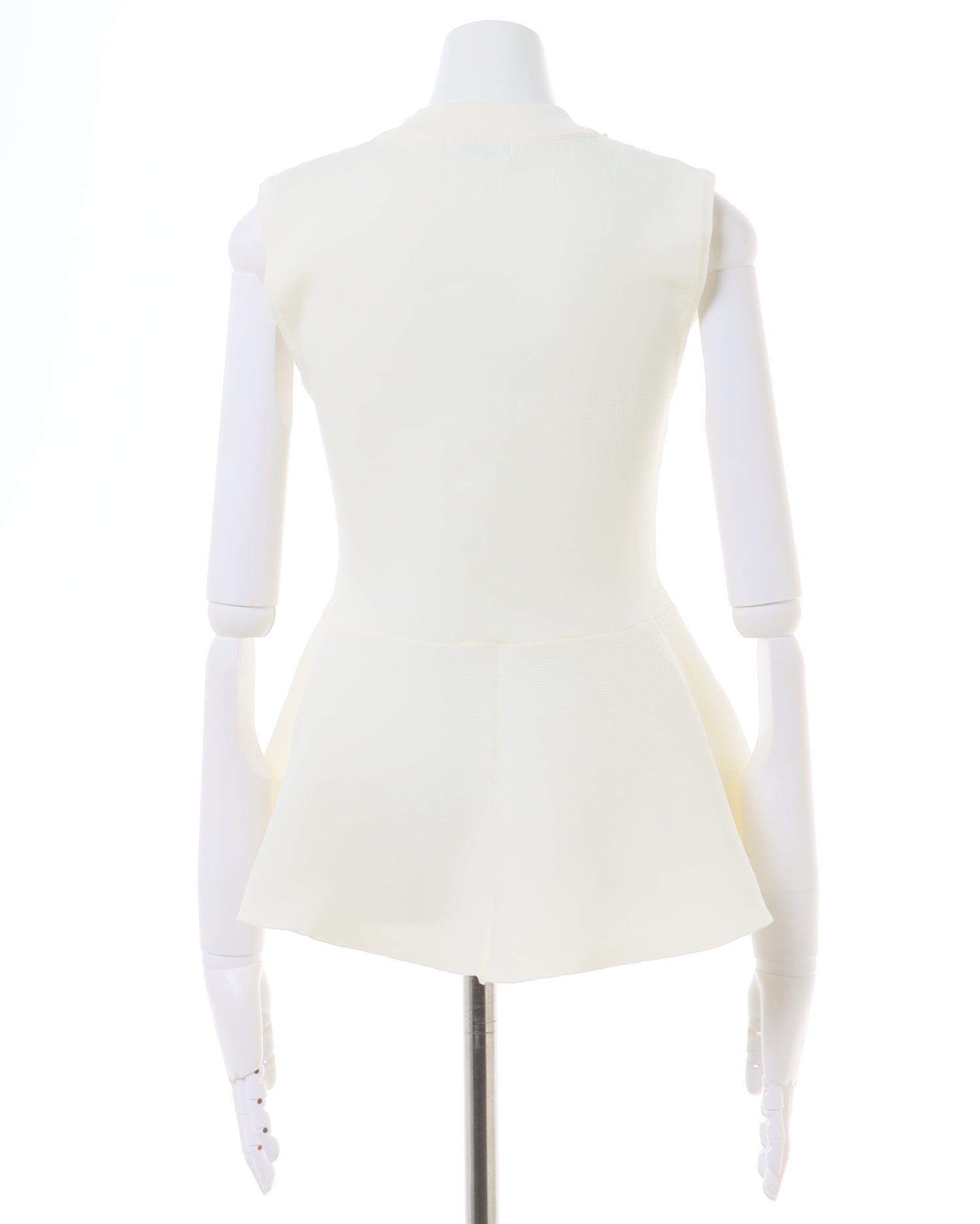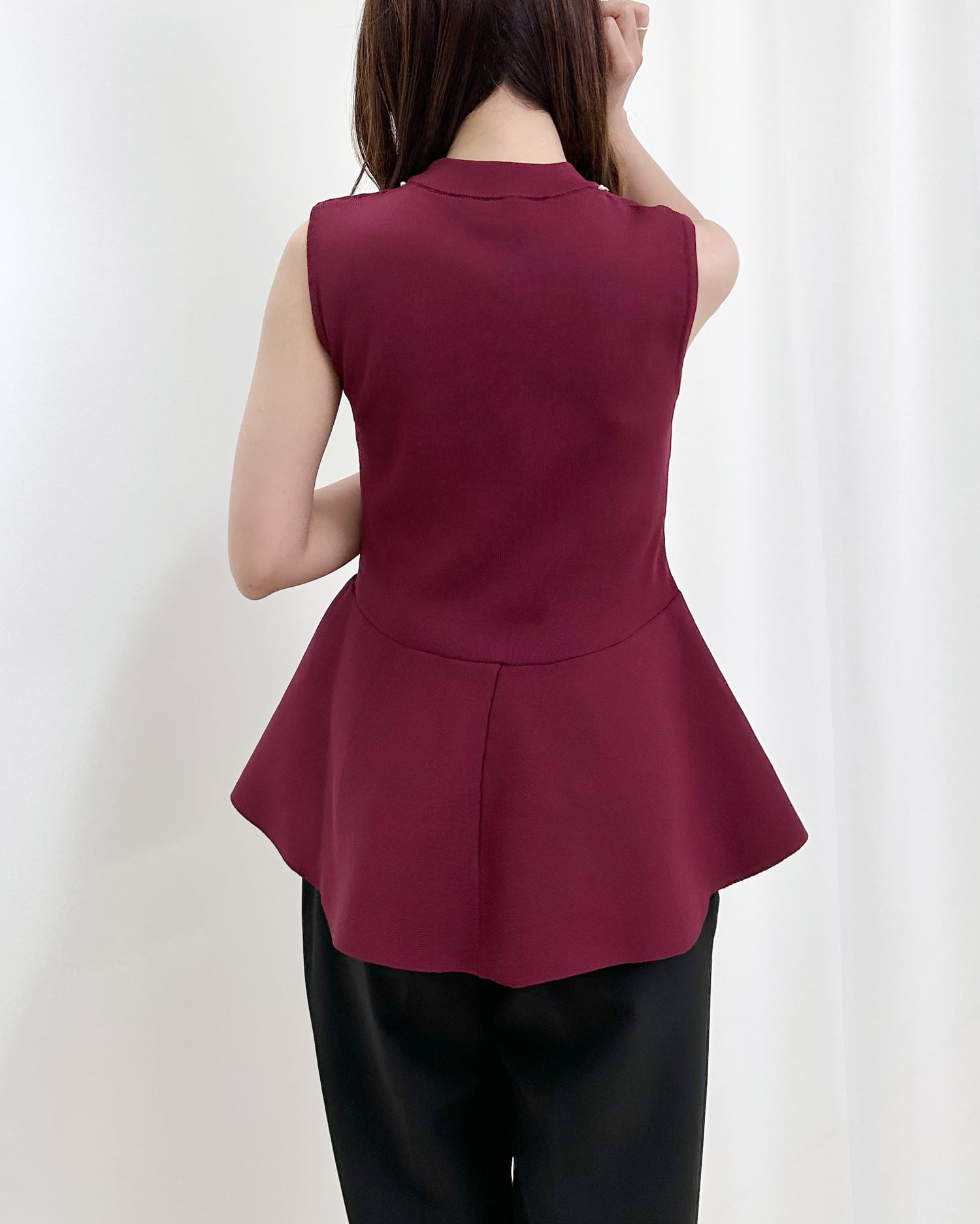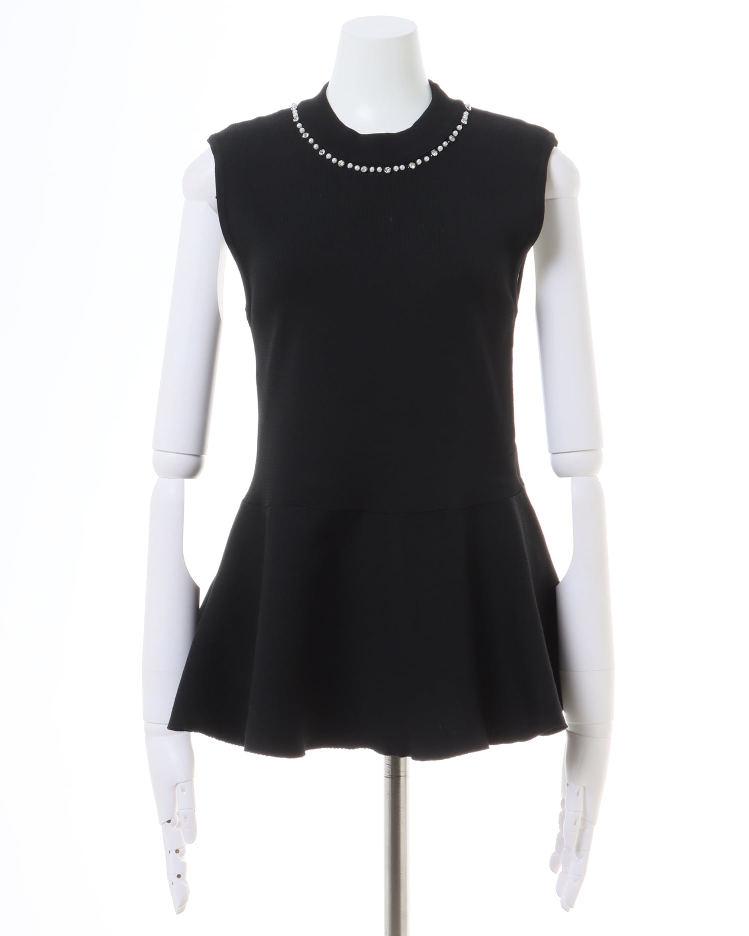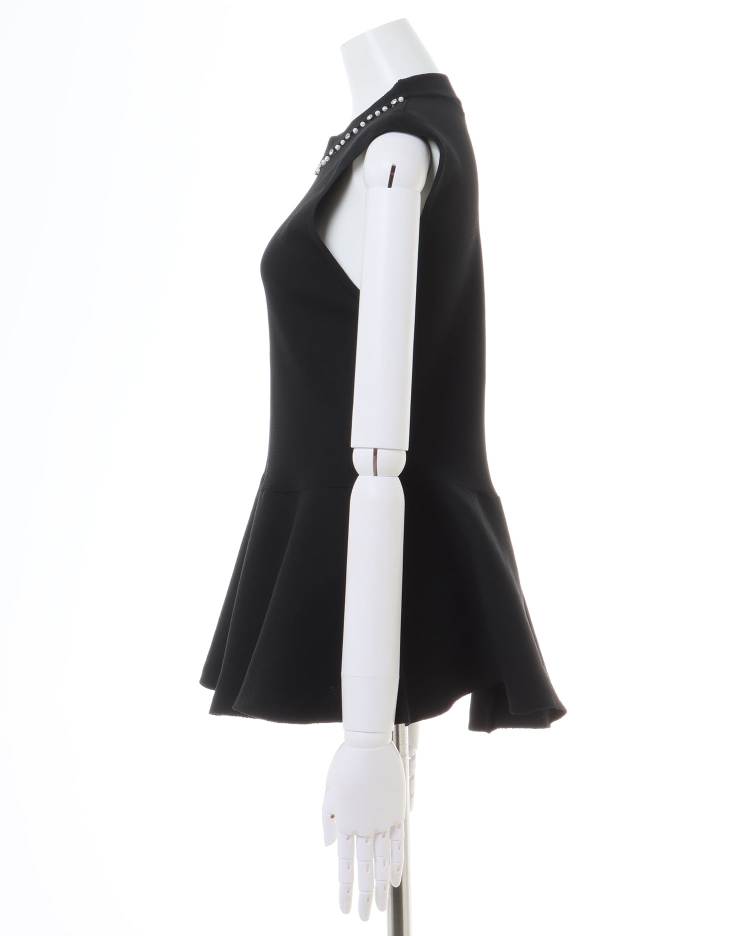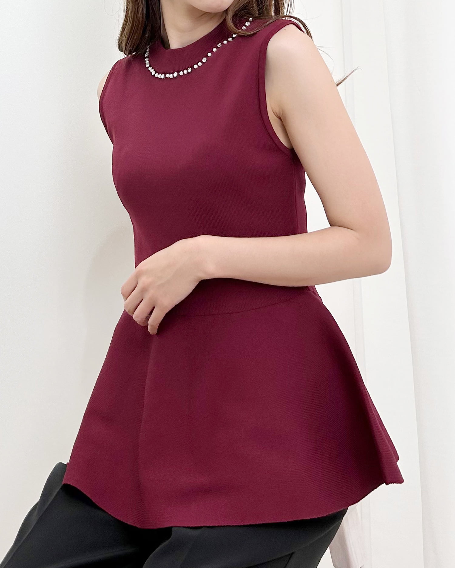 すっきりとしたノースリーブとバスト下で切り替えたペプラムの組み合わせが◎。