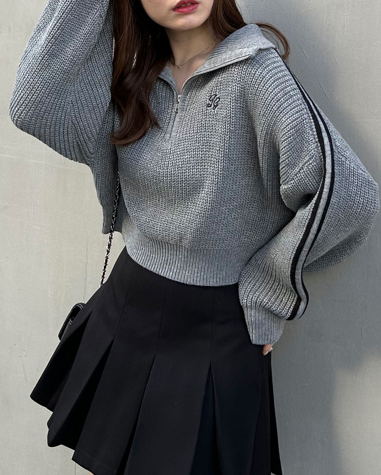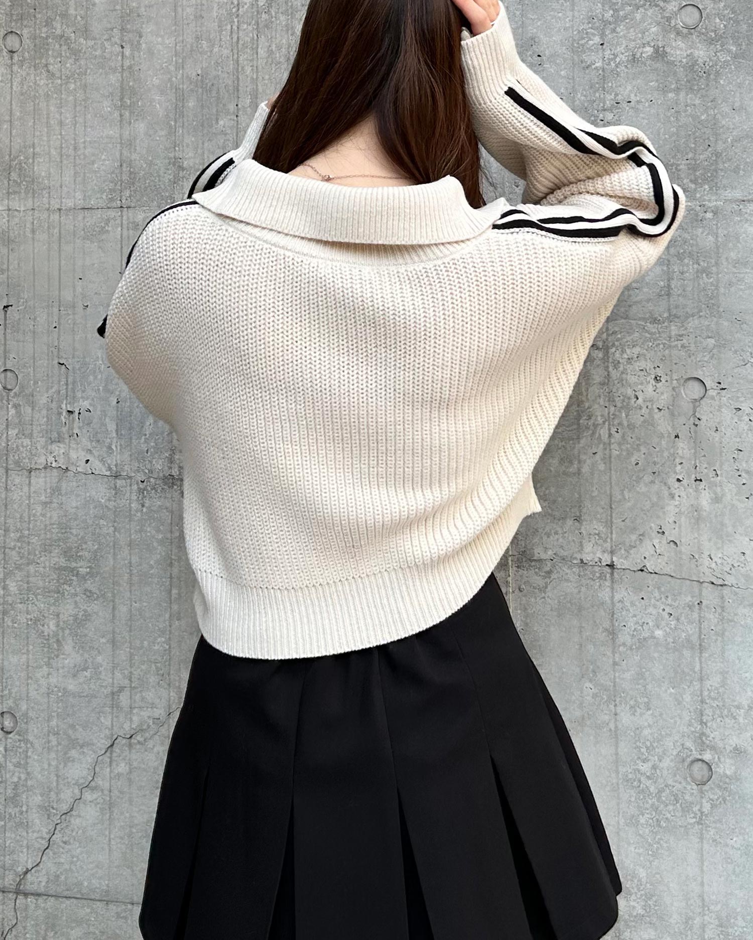 ビッグカラーと袖ラインが目を惹くハーフジップニット