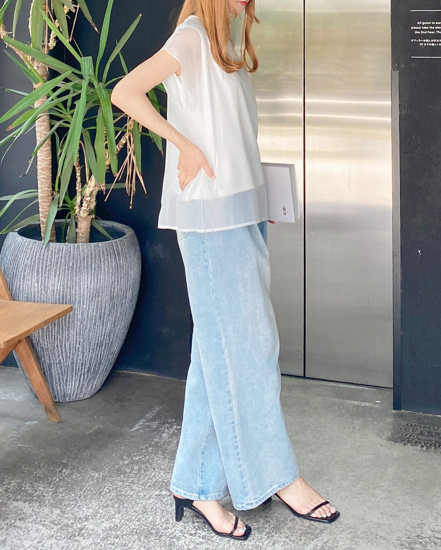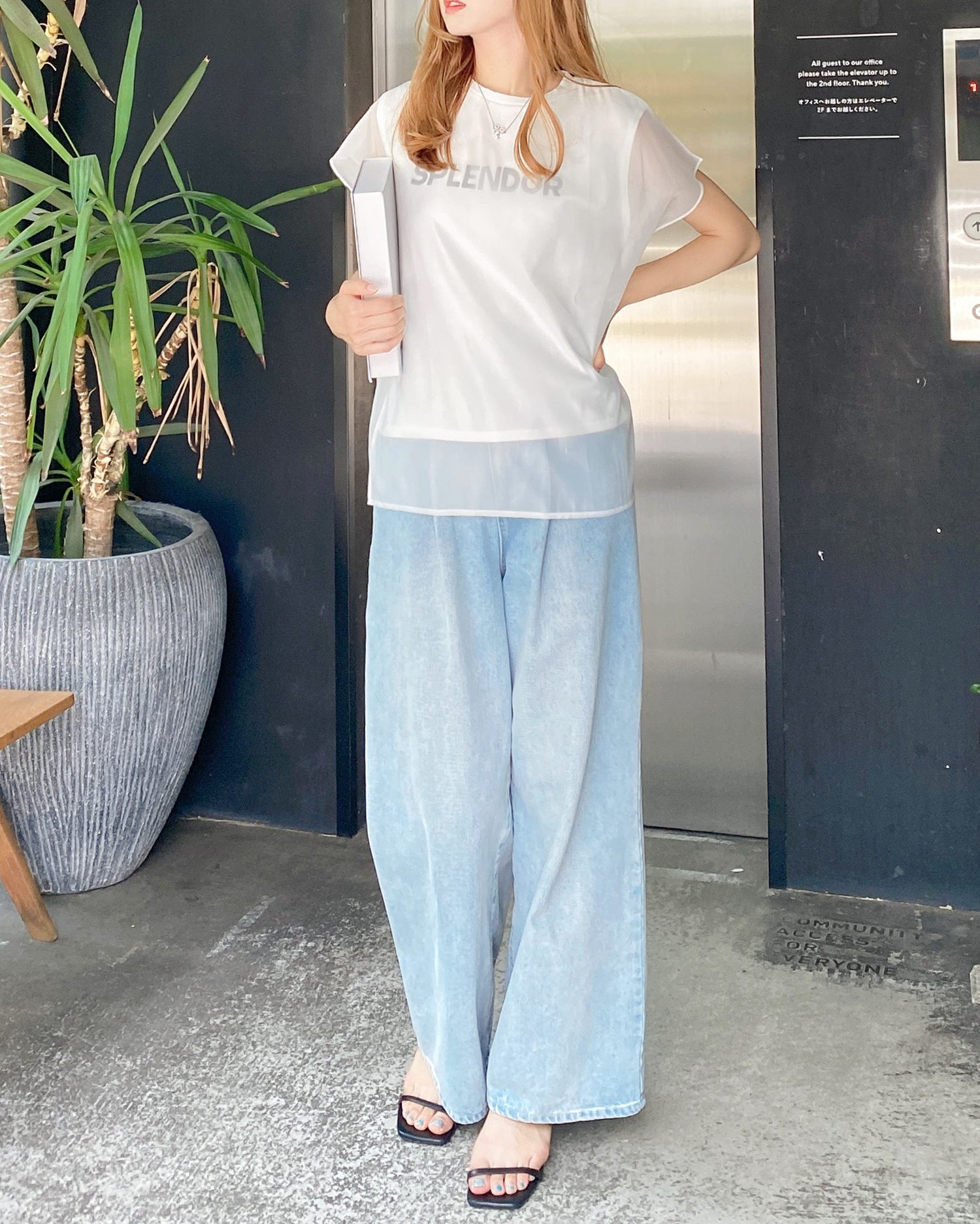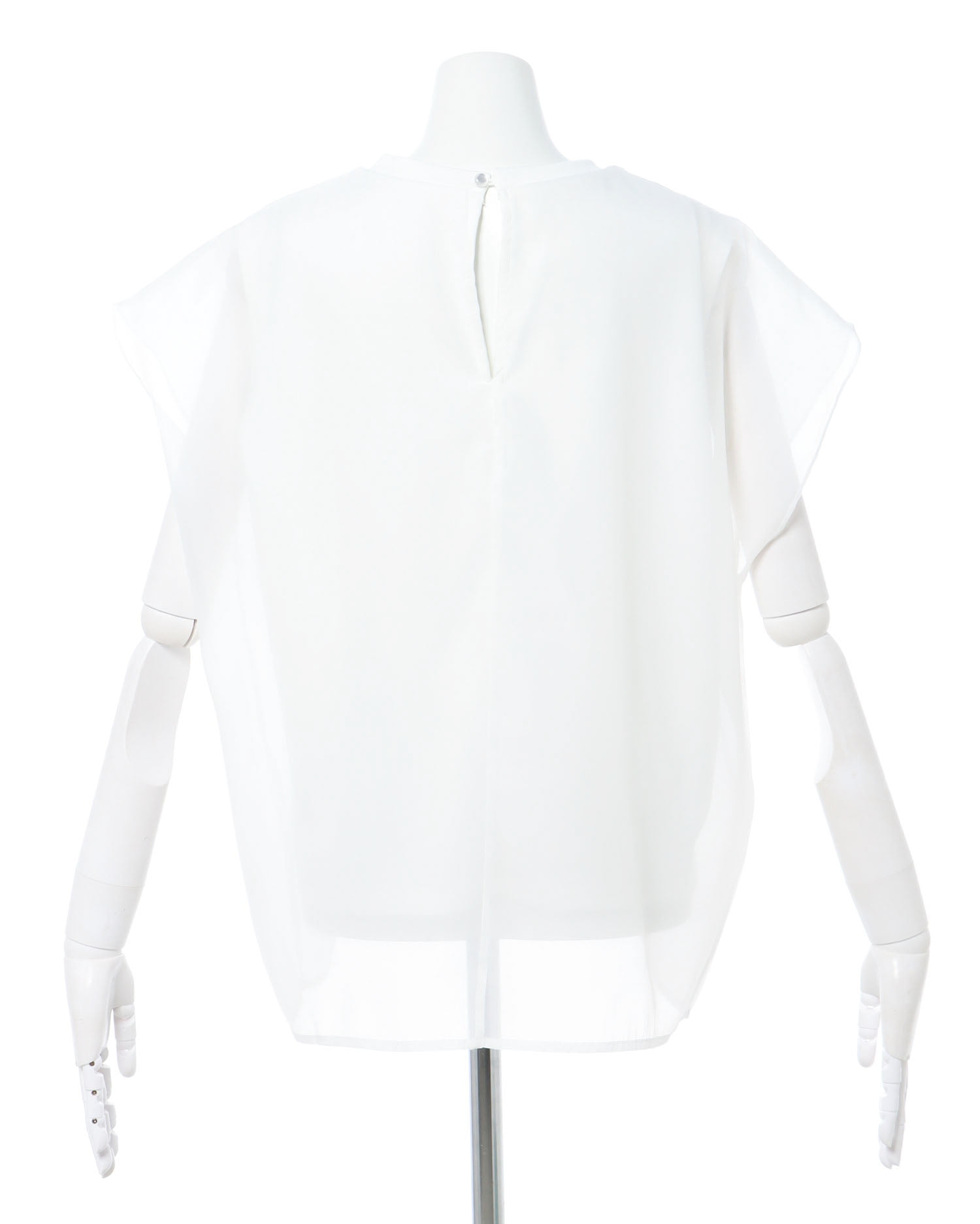 カットソーとやや透け感のあるオーガンジー素材をレイヤードしたトップスは