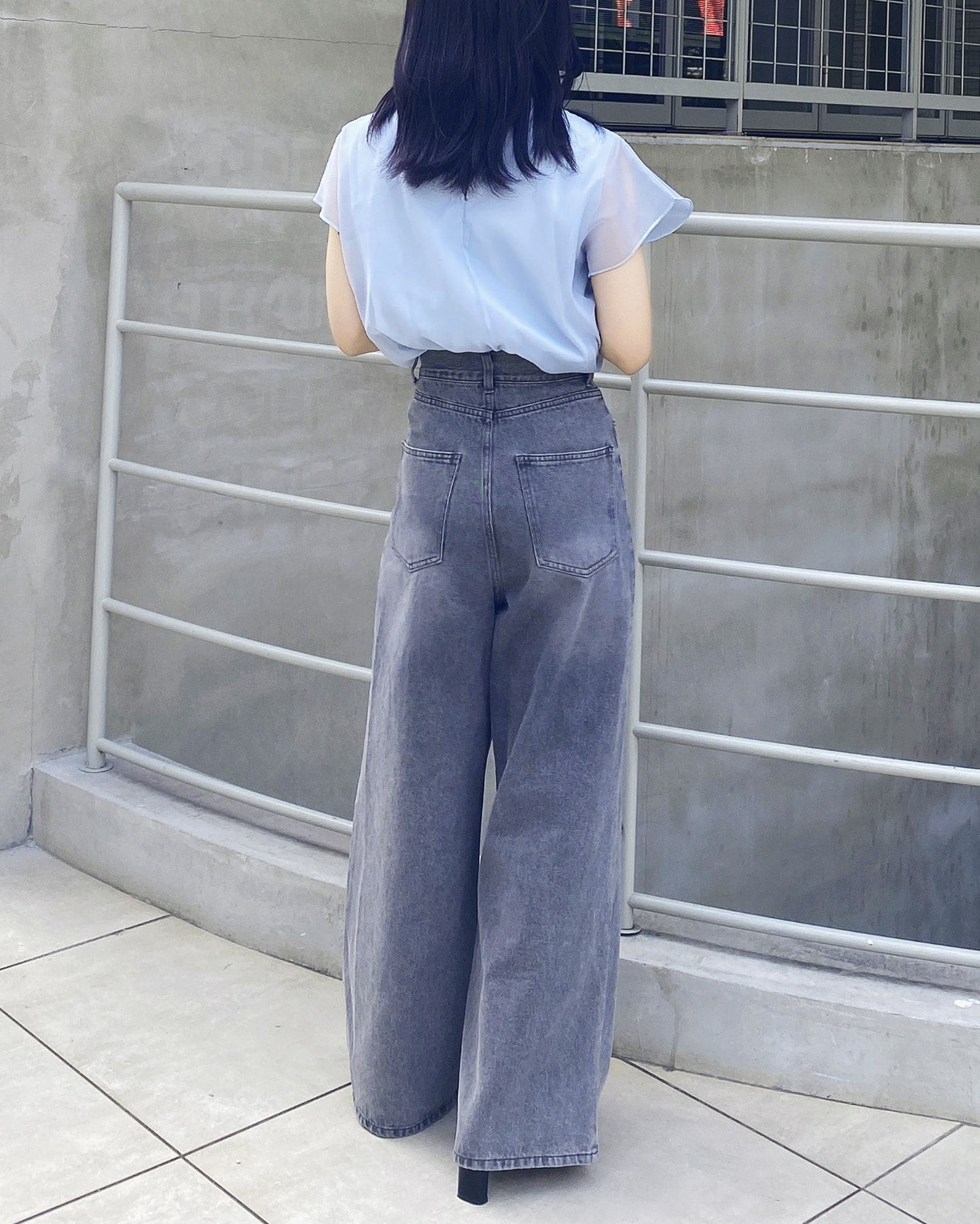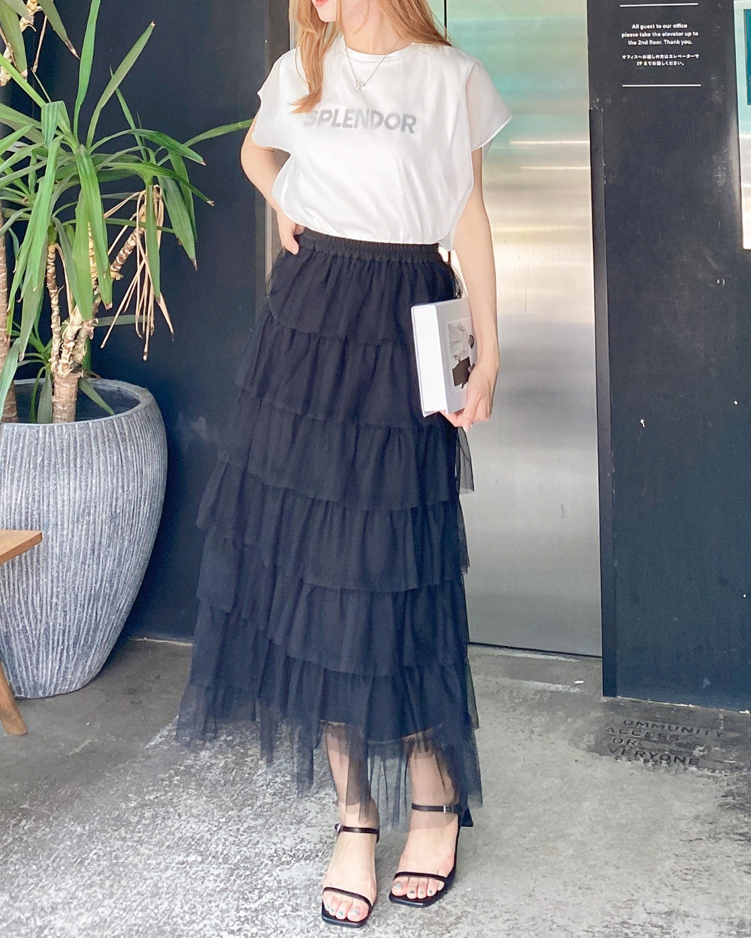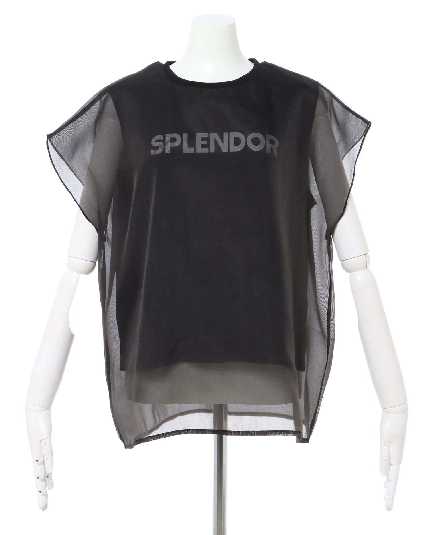 カットソーとやや透け感のあるオーガンジー素材をレイヤードしたトップスは