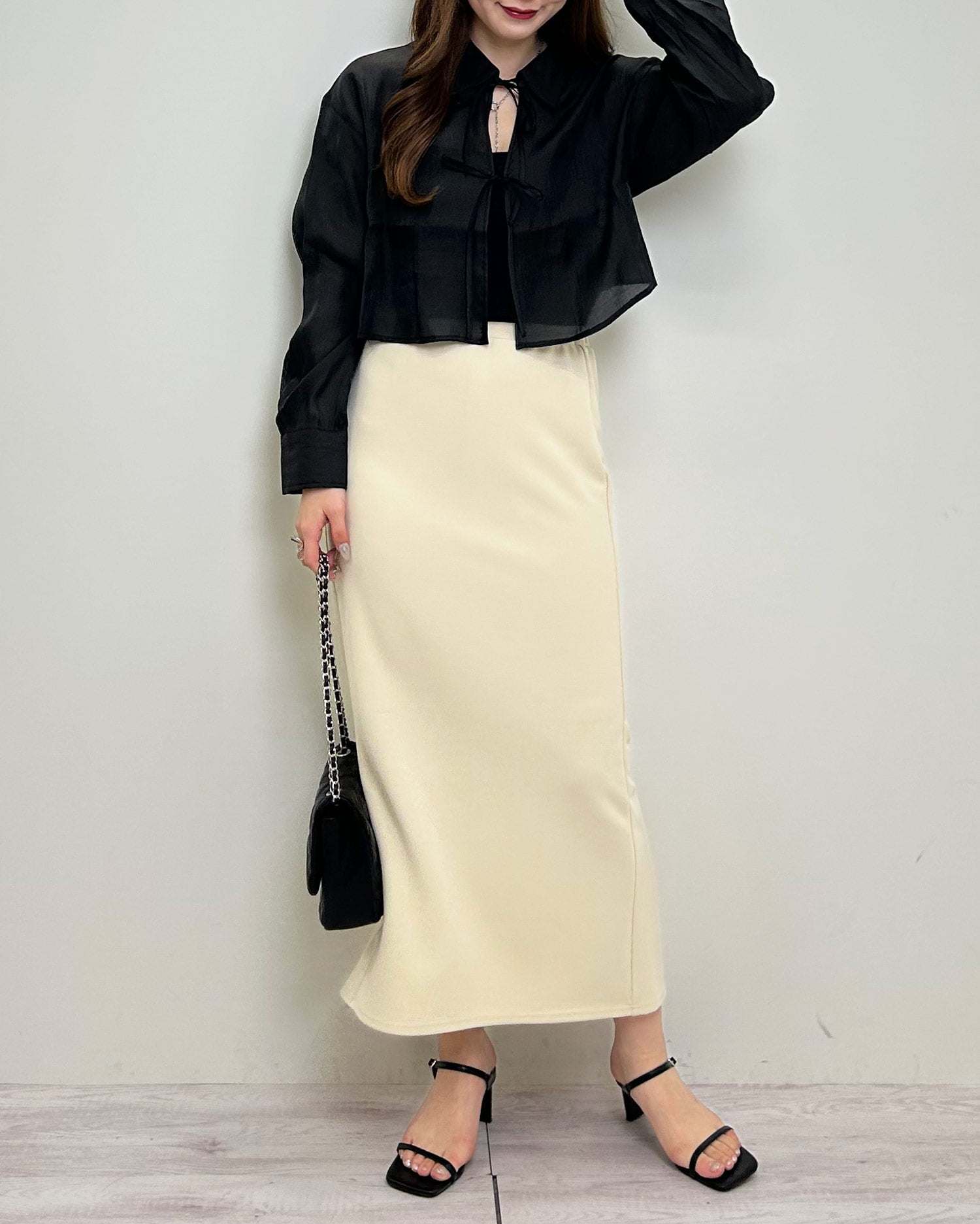 フロントリボンがキュートなアクセントになったシアー素材のシャツ。