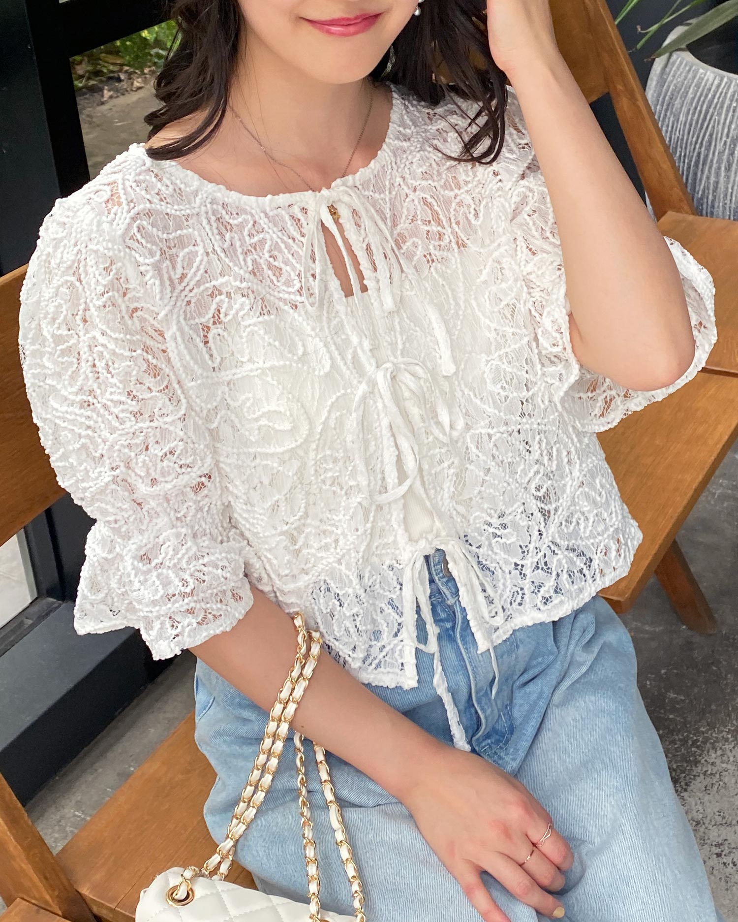 透け感のあるデザインレースを使った、ダブルリボンのブラウス。