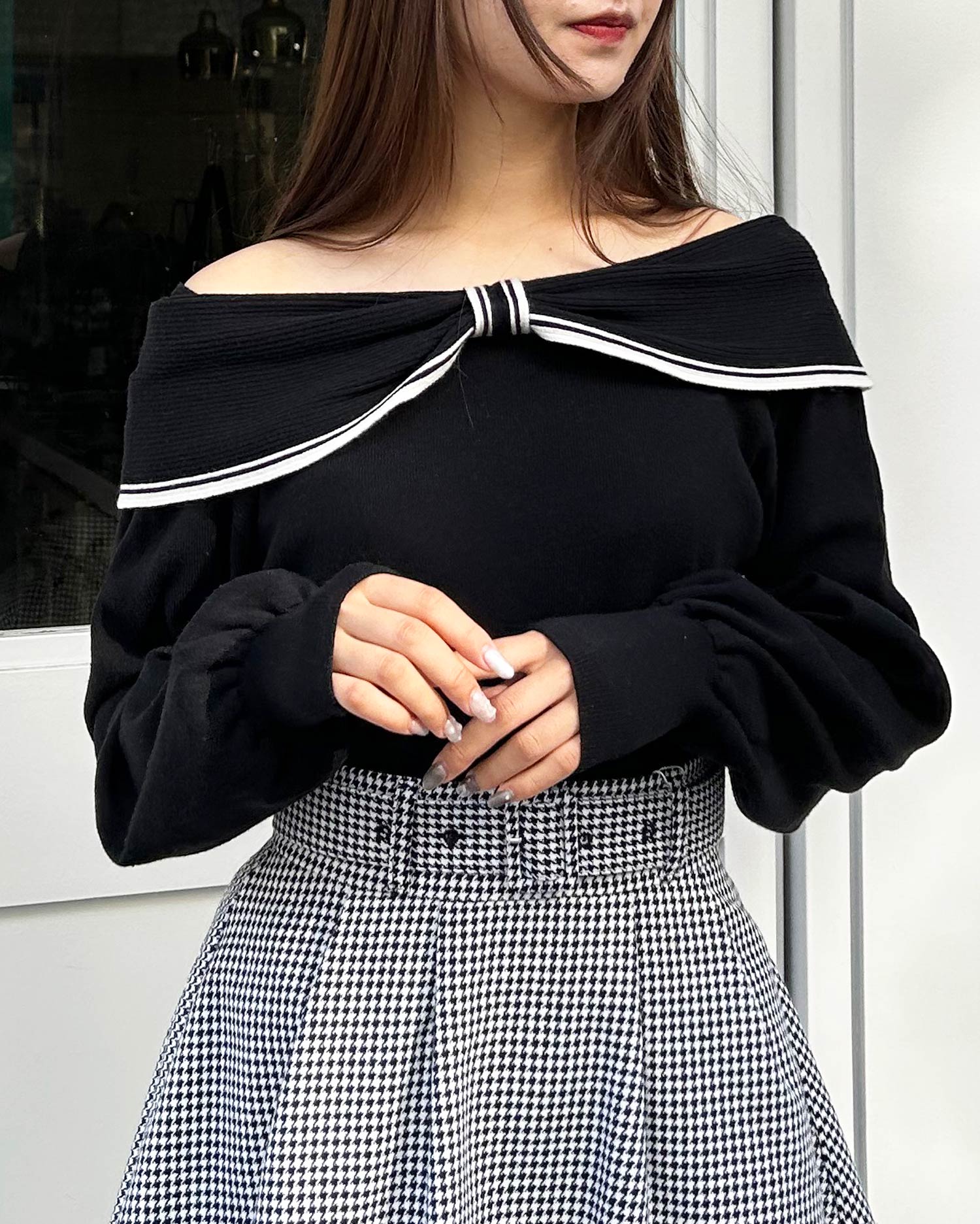 【リボンオフショルダーで抜け感とあざと可愛さをプラス】