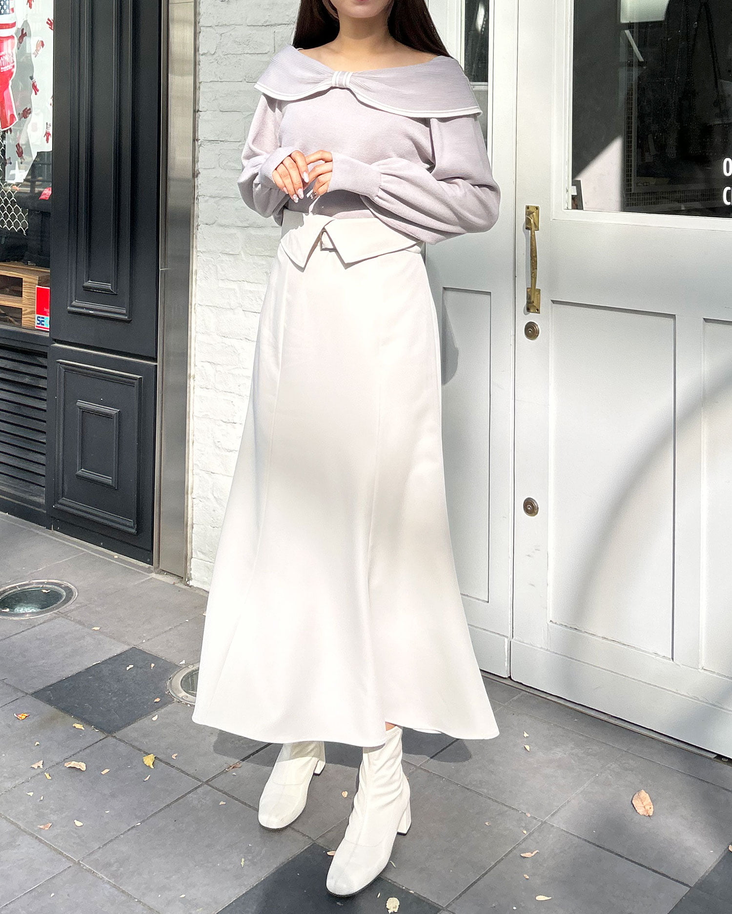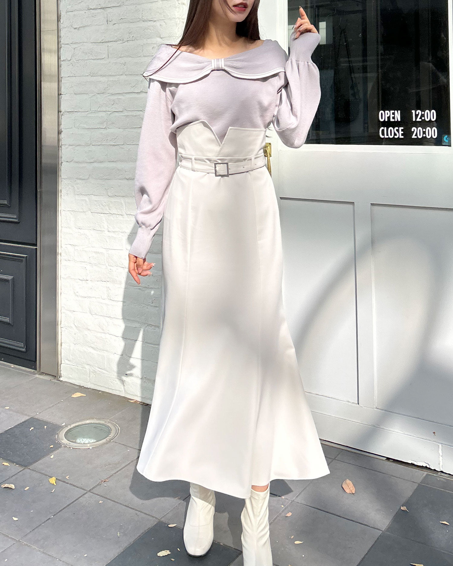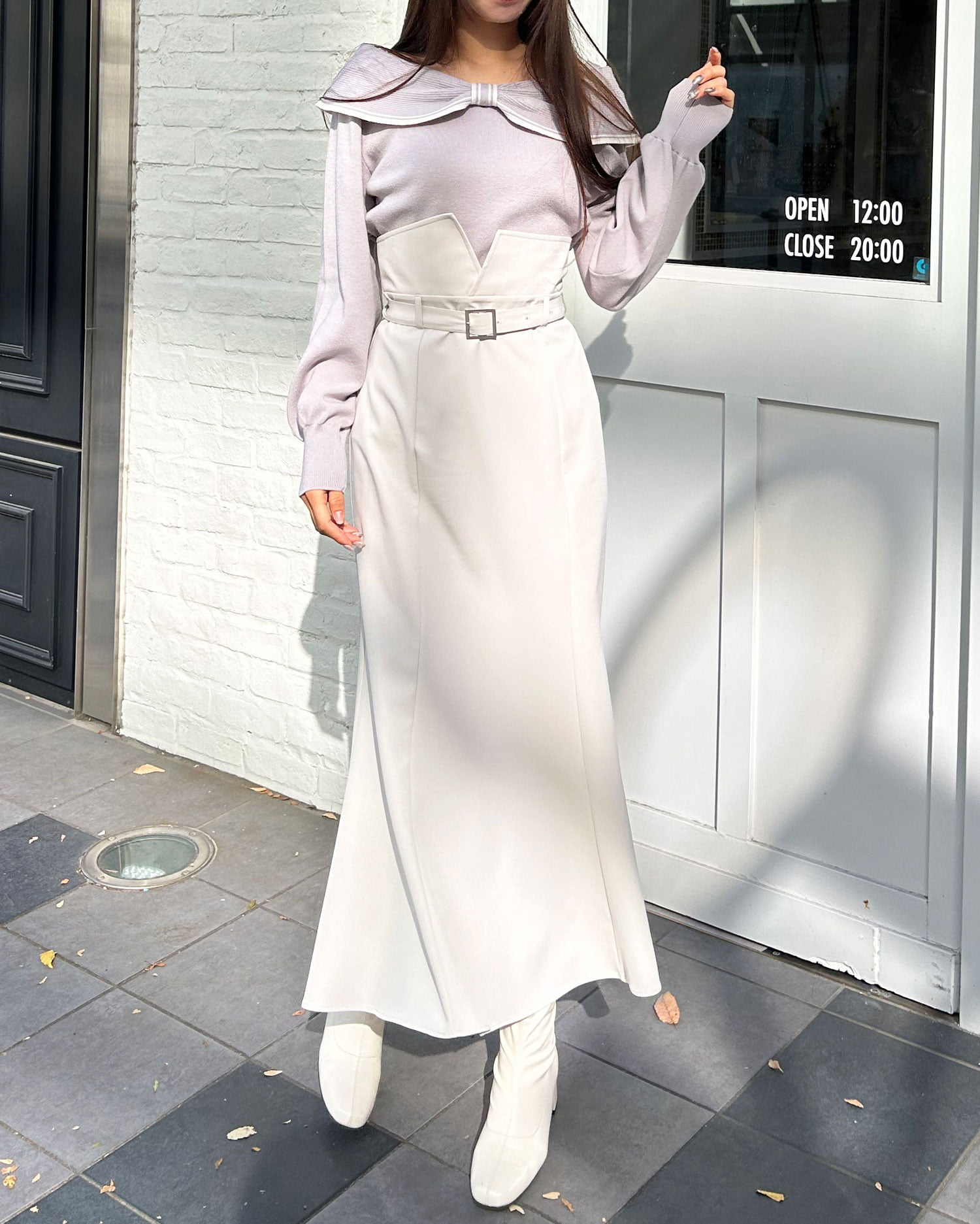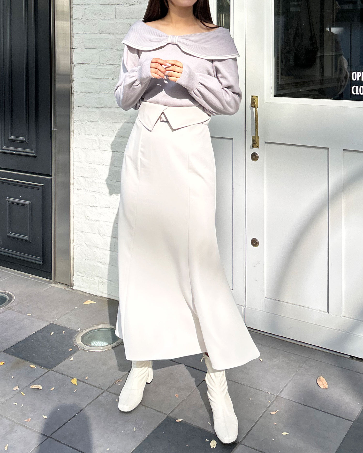 ・タイトなロングスカートで大人の女性らしい印象に。