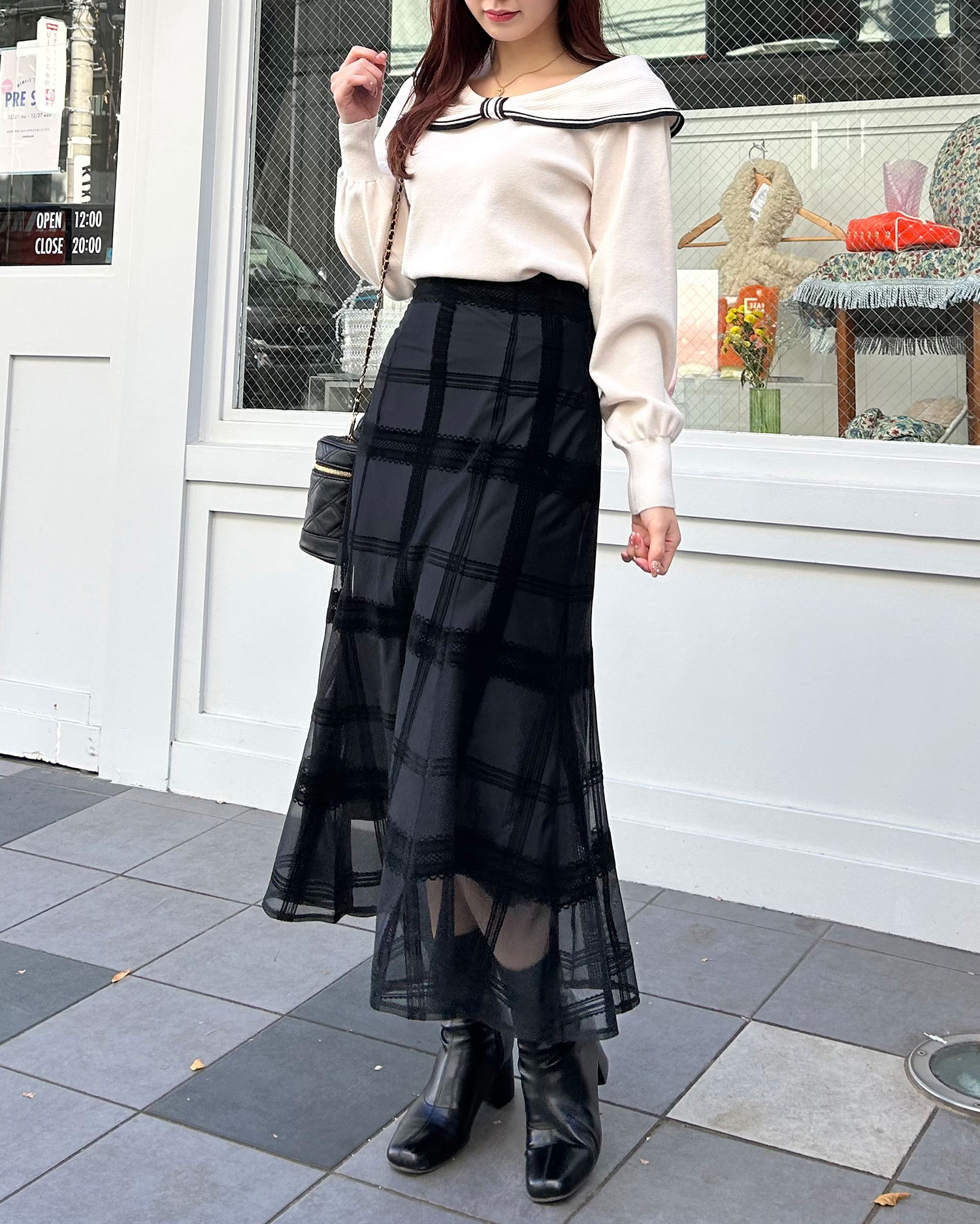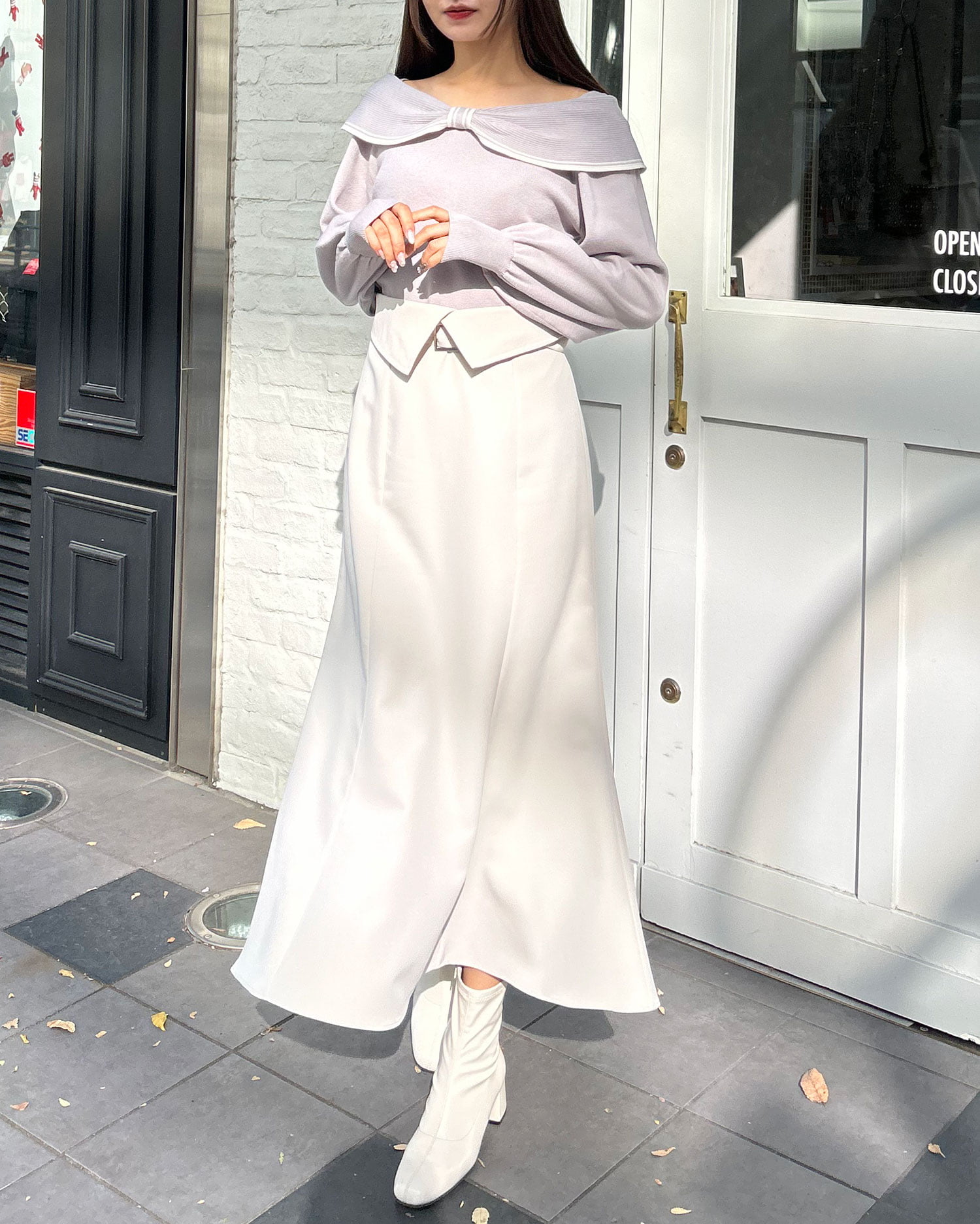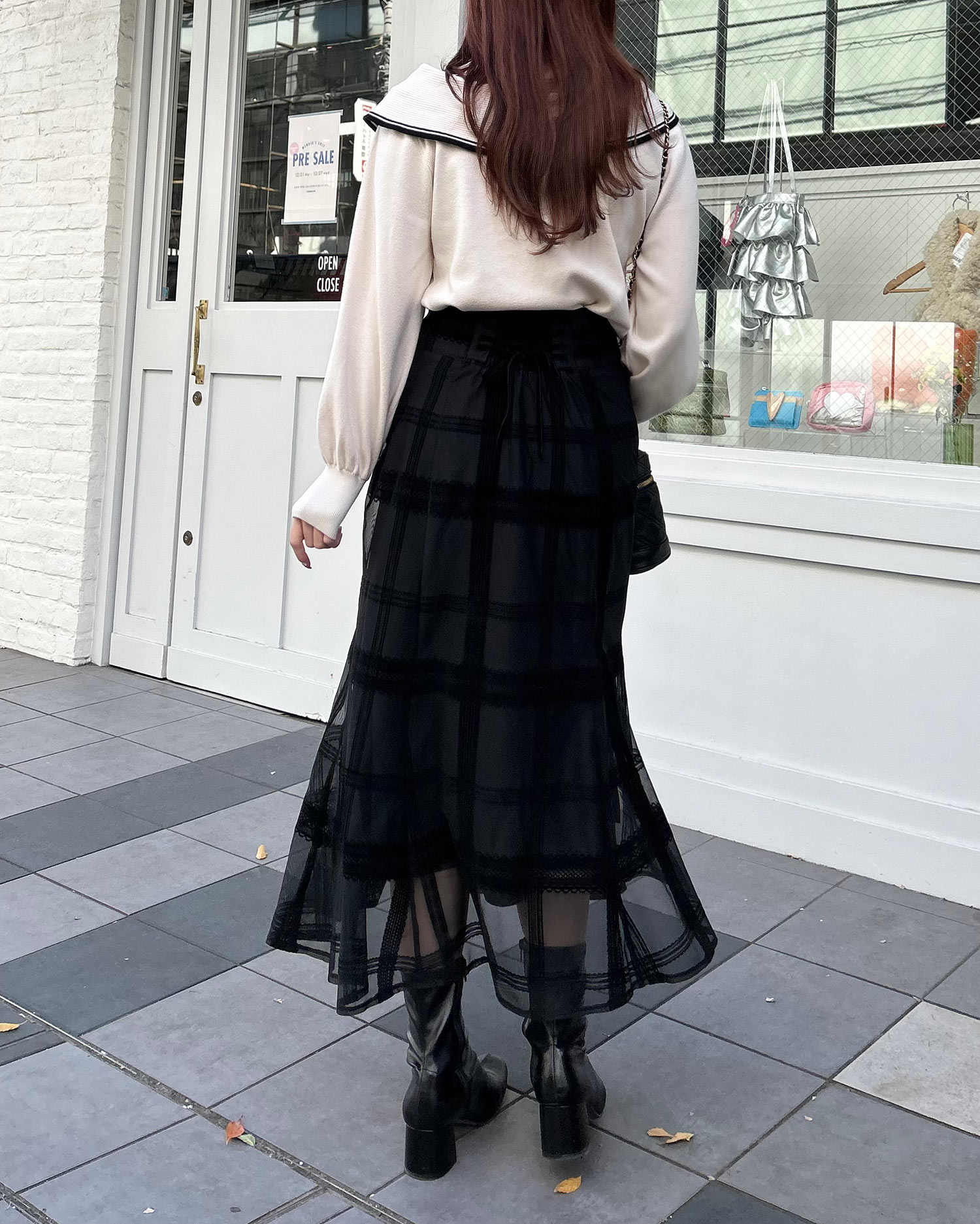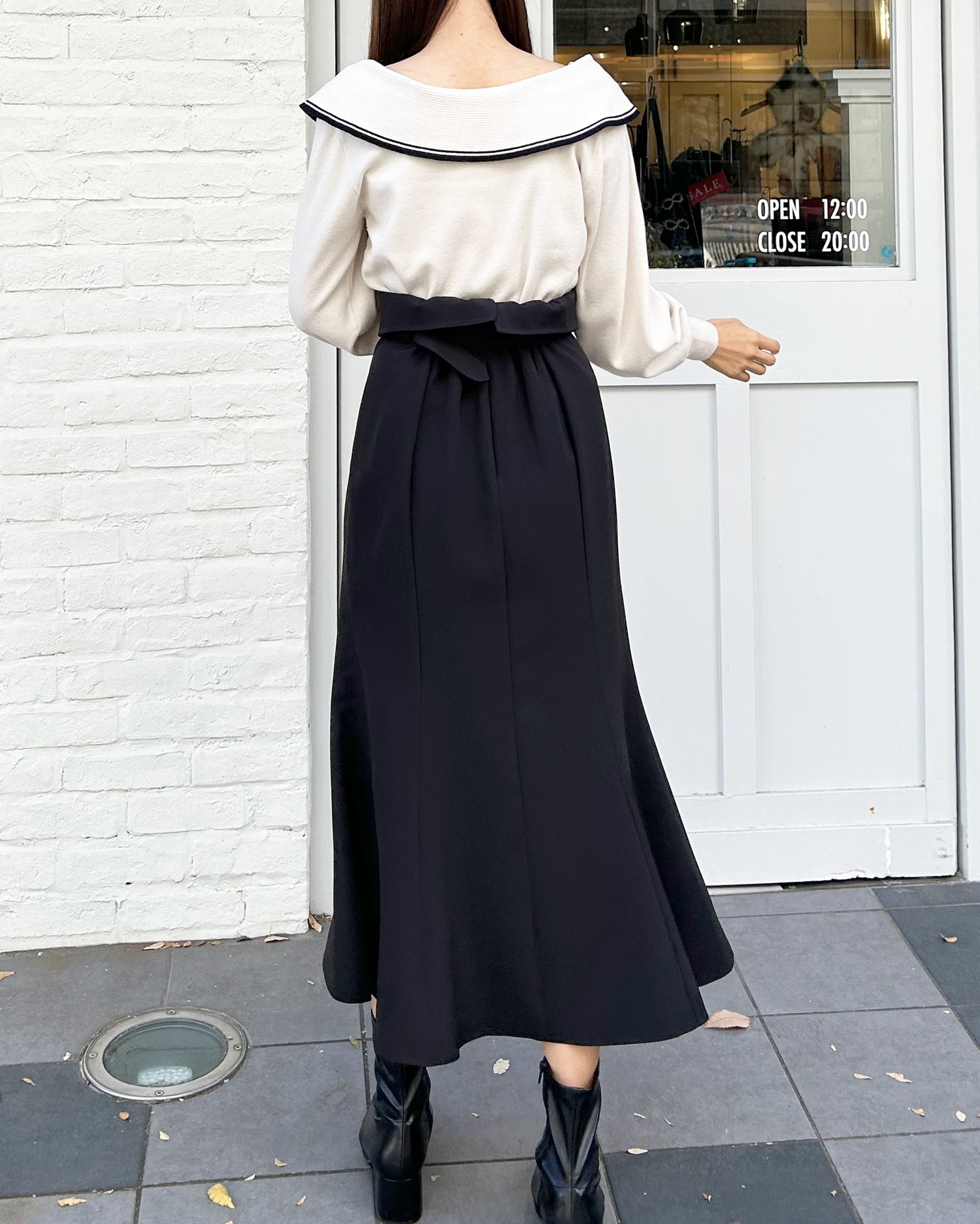 ・タイトなロングスカートで大人の女性らしい印象に。