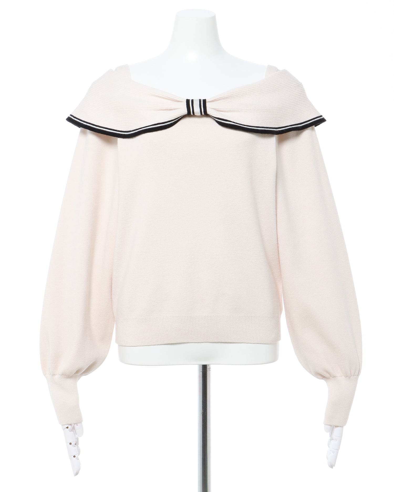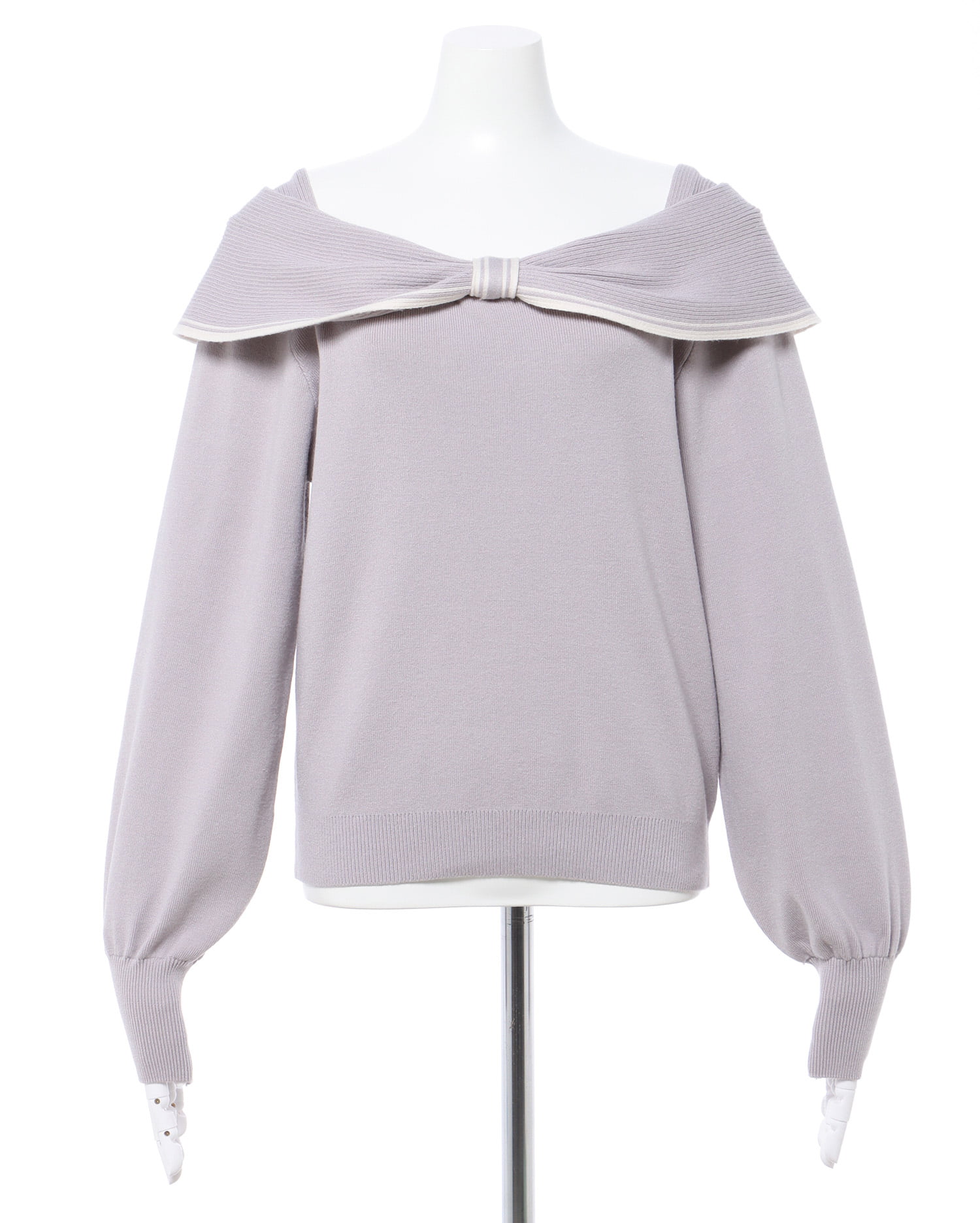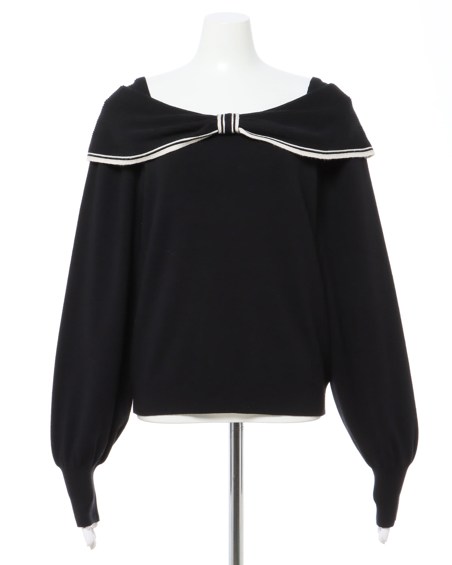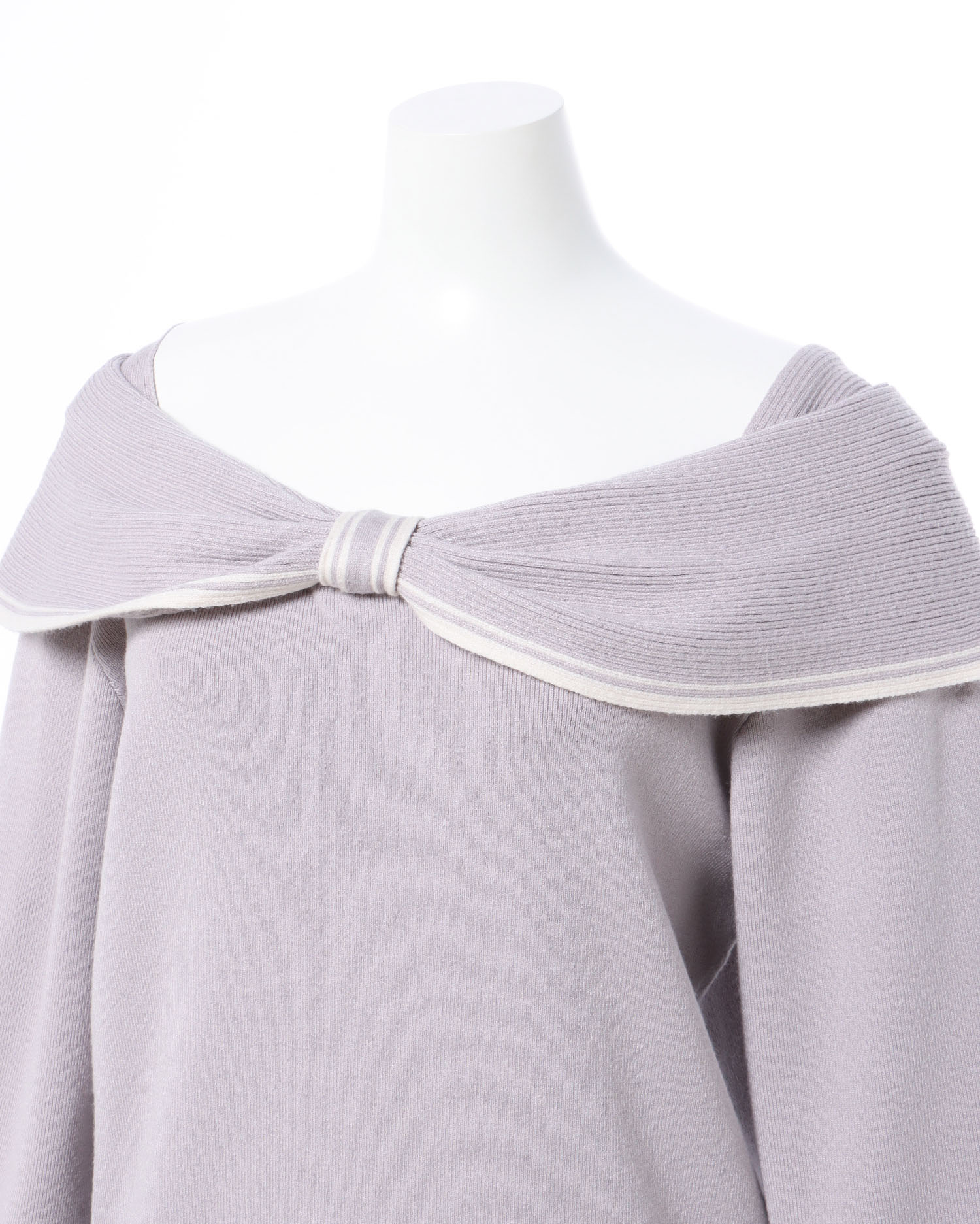大きなリボンのような襟が特徴的なガーリーニットアイテム。
