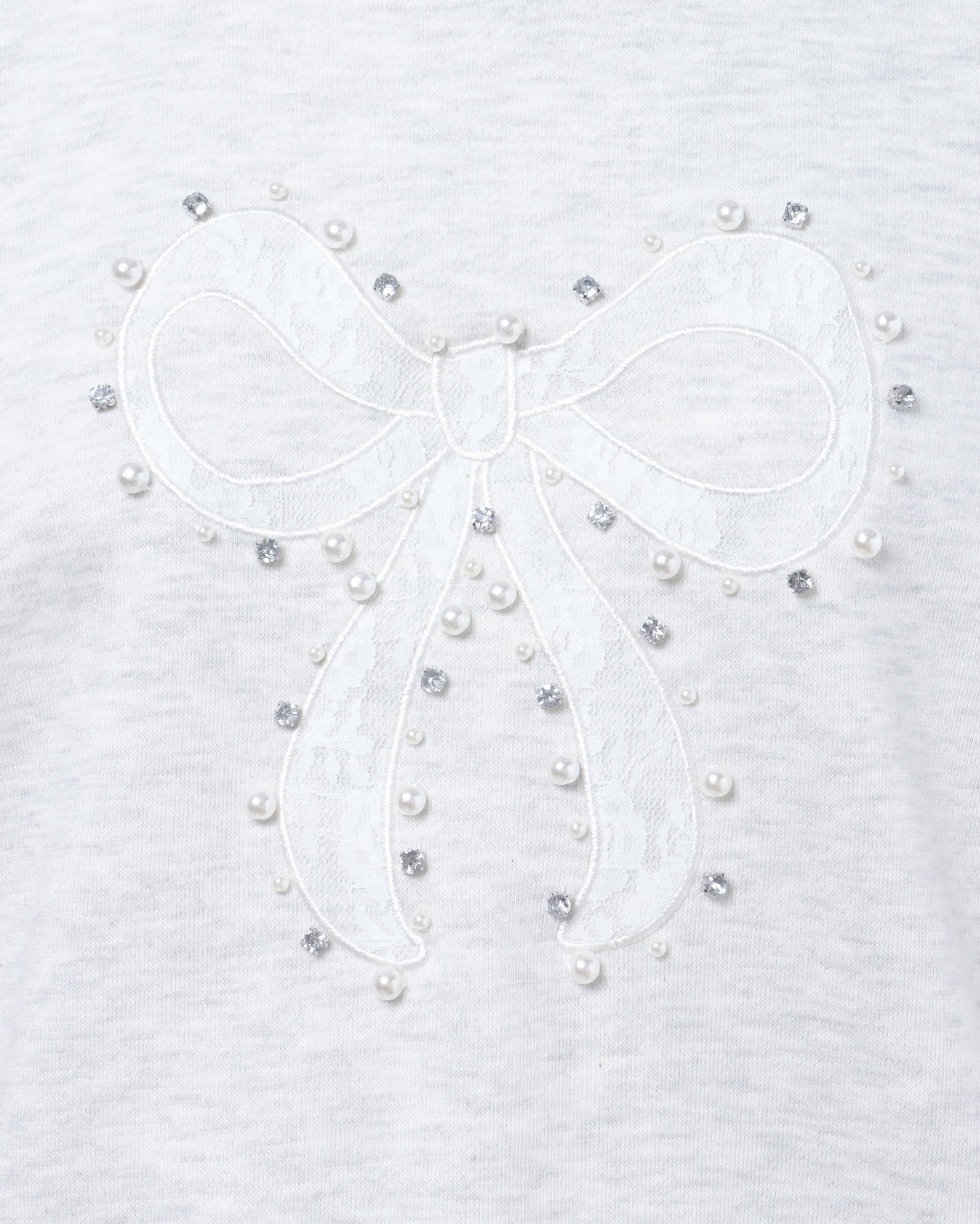 フロントの大きなリボンロゴにパールビジューの装飾が付くことで、
