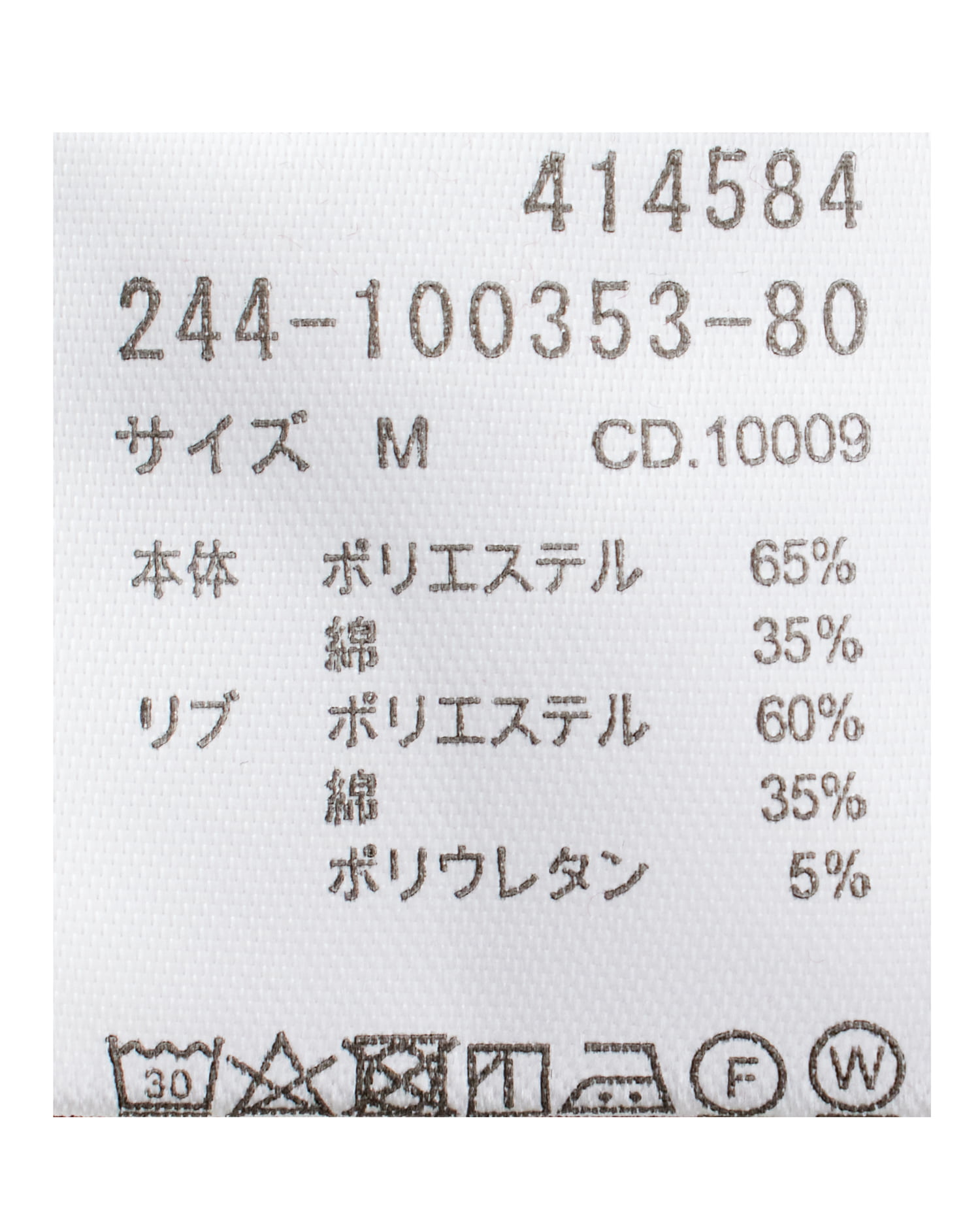 原産国 中国 本体 ポリエステル65% 本体 綿35% リブ ポリエステル60% リブ 綿35% リブ ポリウレタン5%