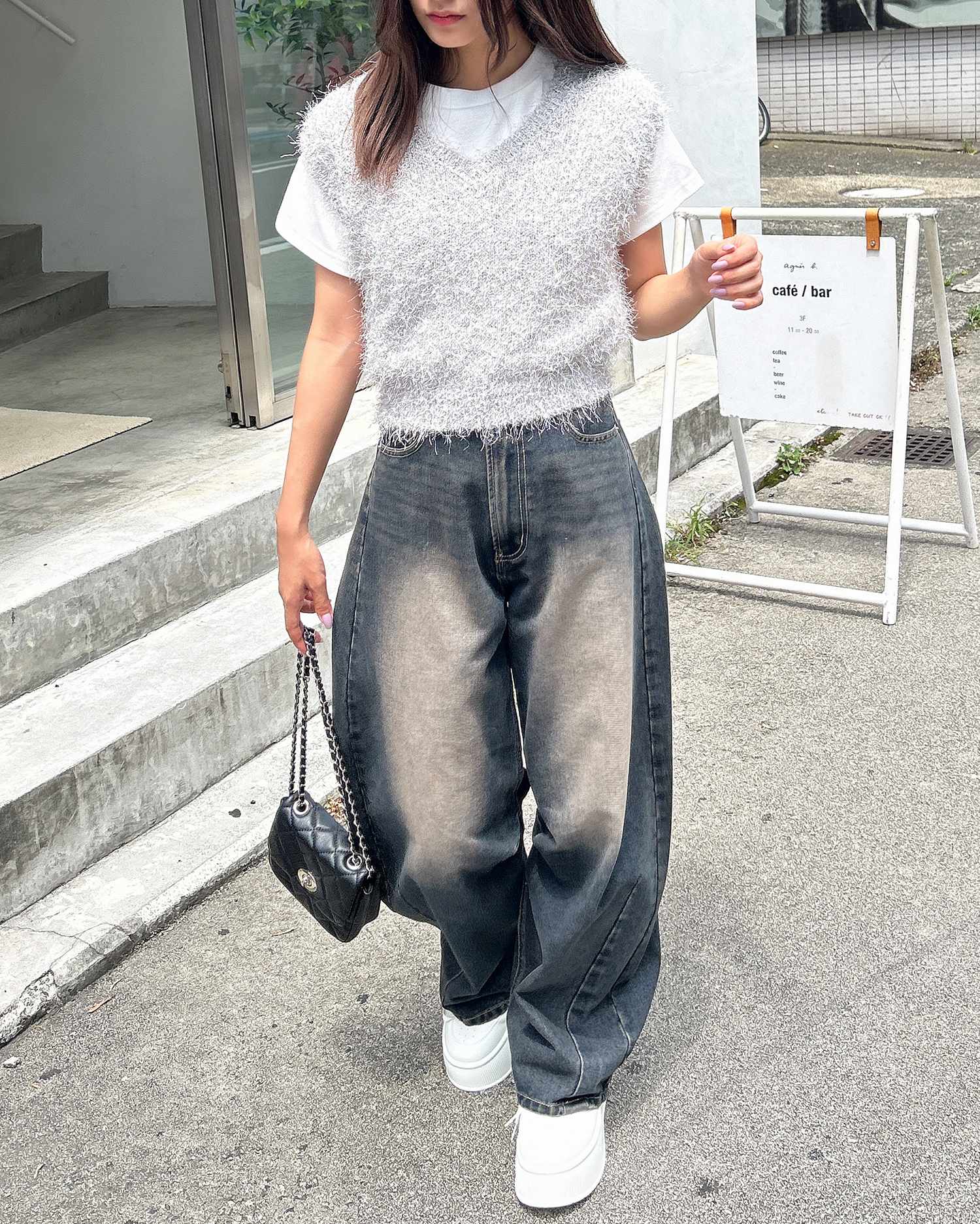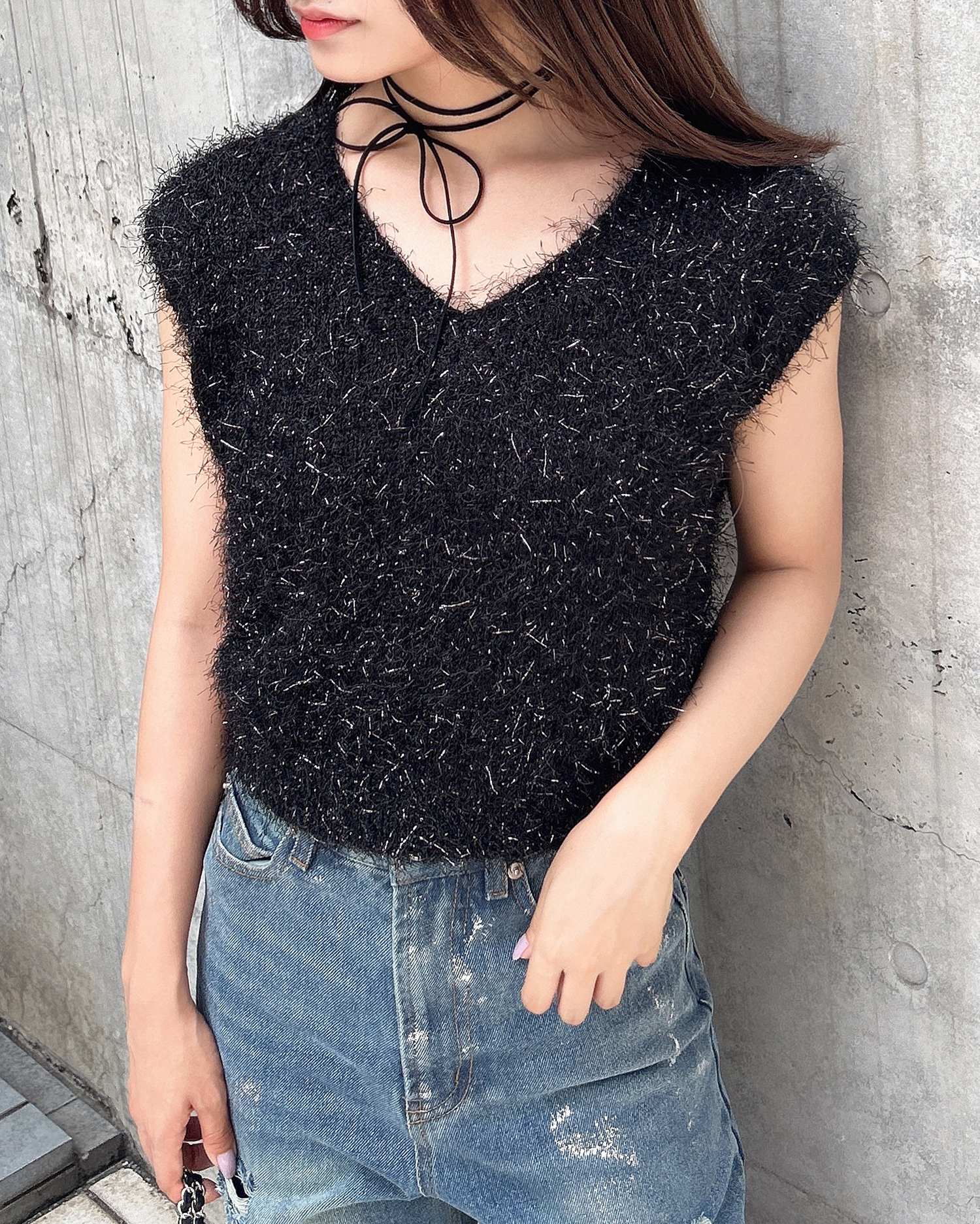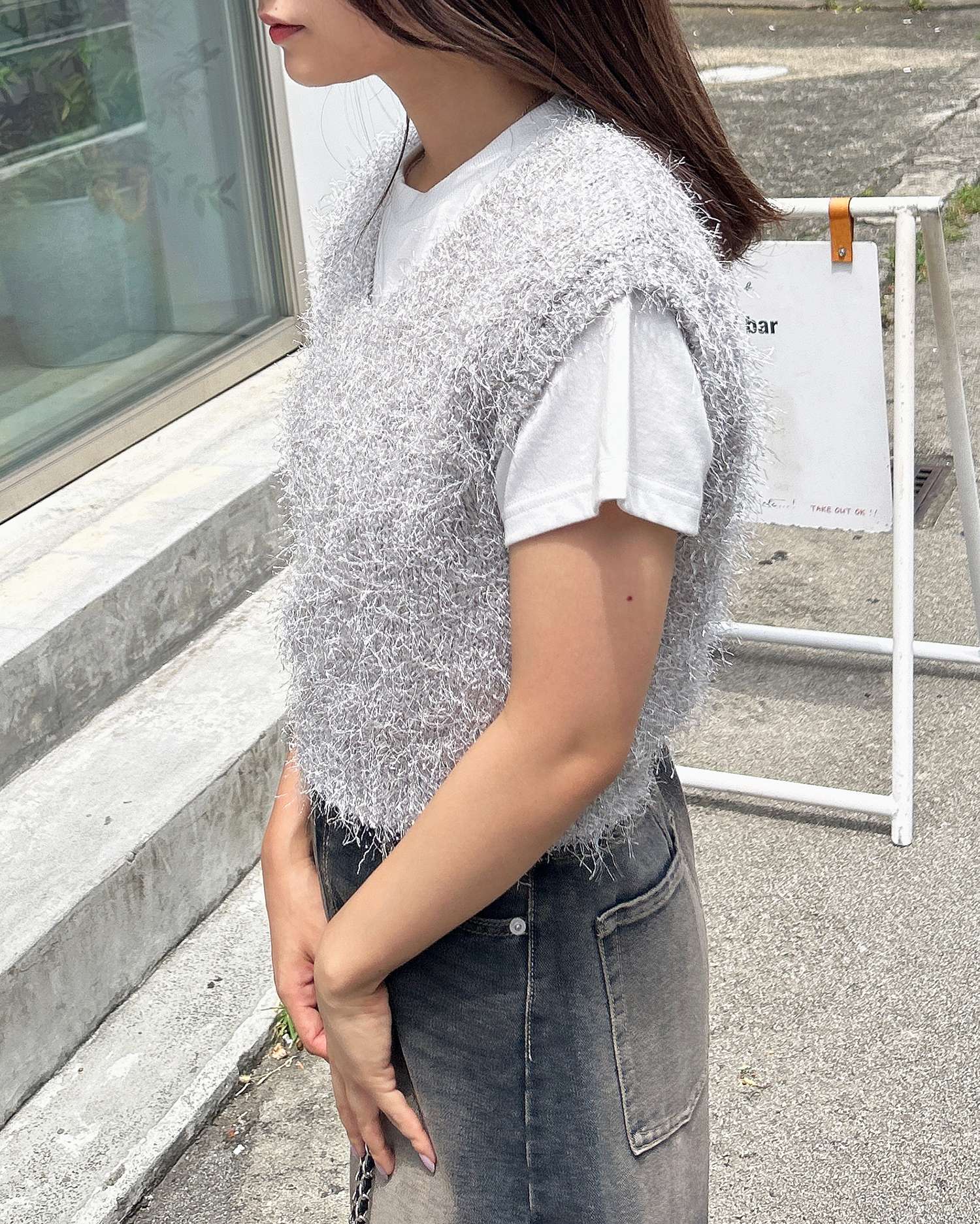 毛足の長いフェザーニットで仕立てたニットベスト。