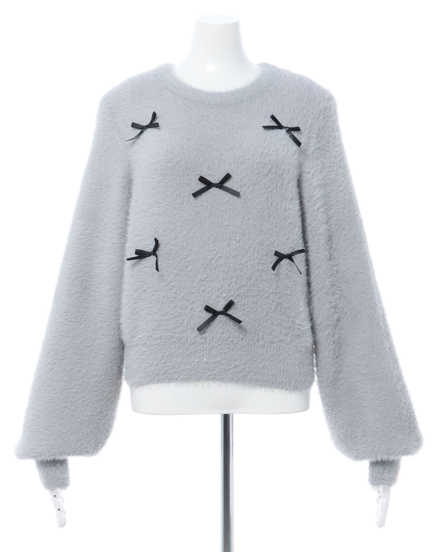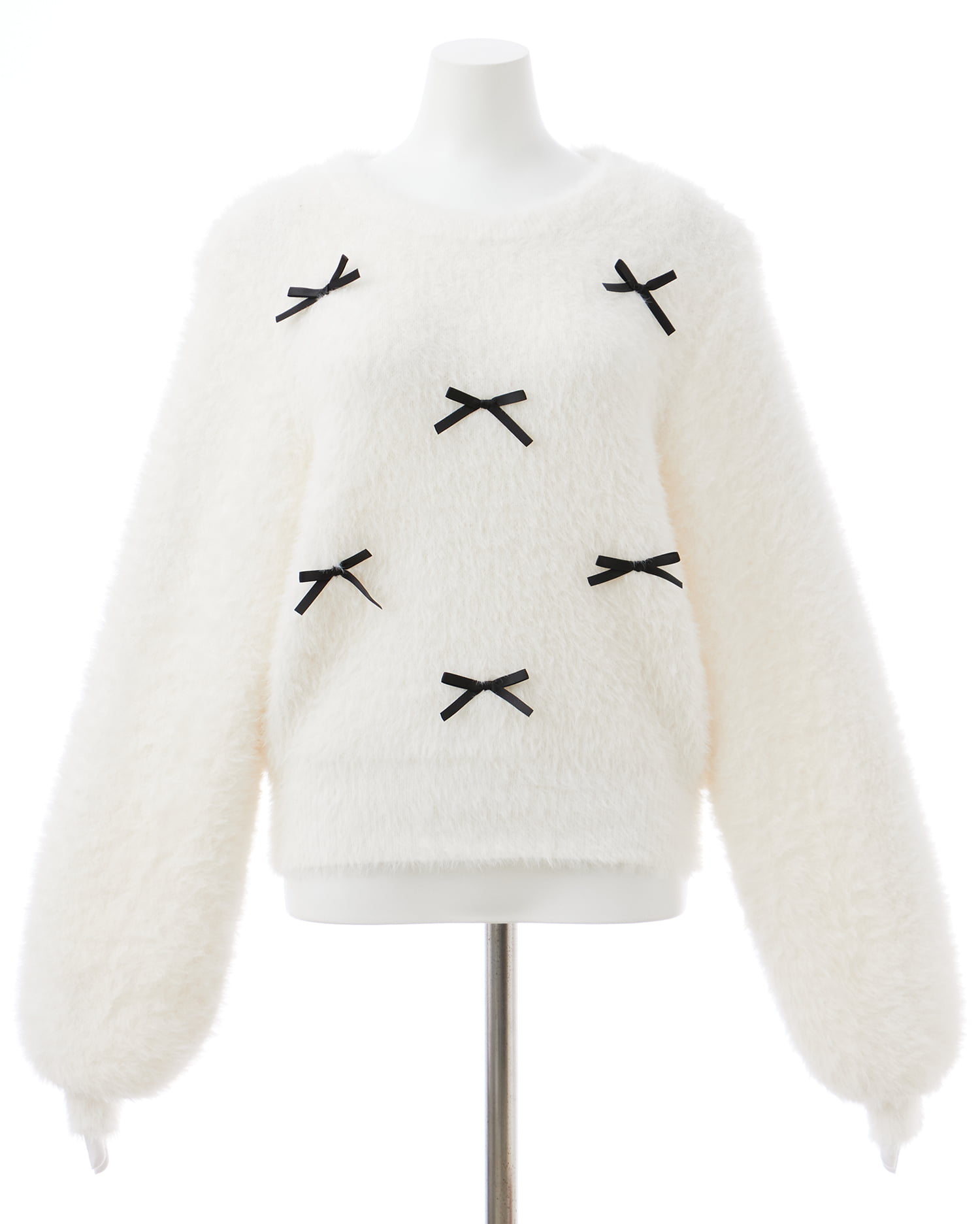フロントに細いリボンを散りばめてキュートに仕上げたニットトップス。