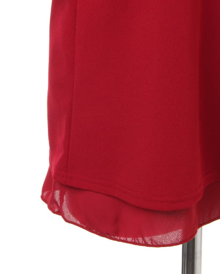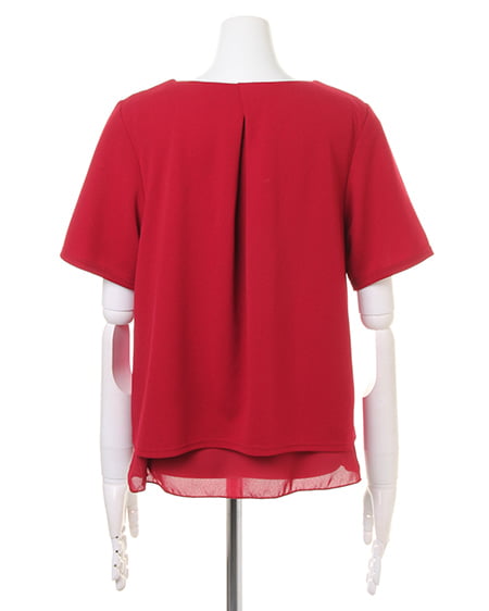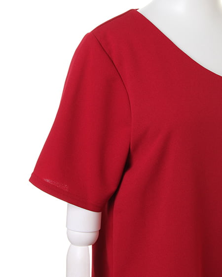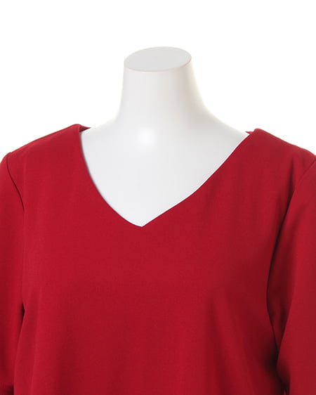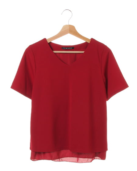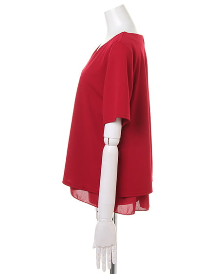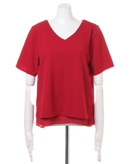 シンプルなデザインで、オンオフ問わずに着回せるトップスはVネックですっきりと。2枚仕立ての身頃は、裾部分をレイヤードしたような仕上がりになっています。生地は伸縮性があり、ゆるめのシルエットとの組み合わせでリラックスした着心地に。ボトムを選ばず合わせられるので、何枚も欲しくなってしまいそうなおすすめの1枚です。