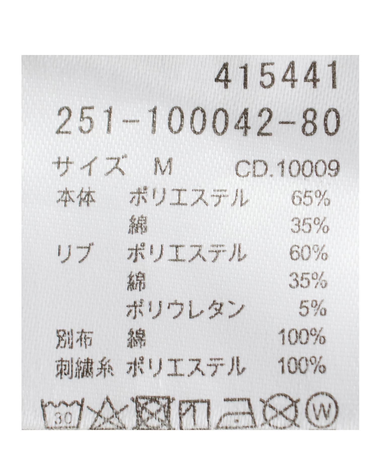 原産国 中国 本体 ポリエステル65% 本体 綿35% リブ ポリエステル60% リブ 綿35% リブ ポリウレタン5% 別布 綿100% 刺繍糸 ポリエステル100%
