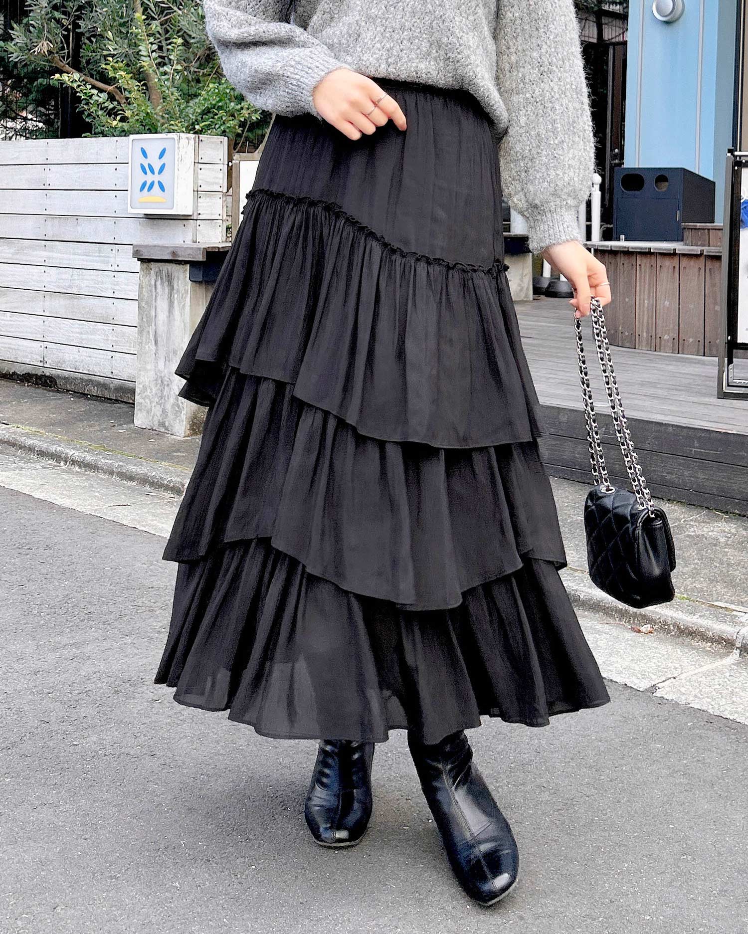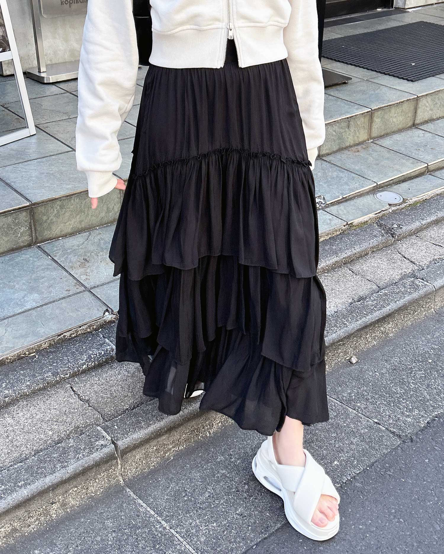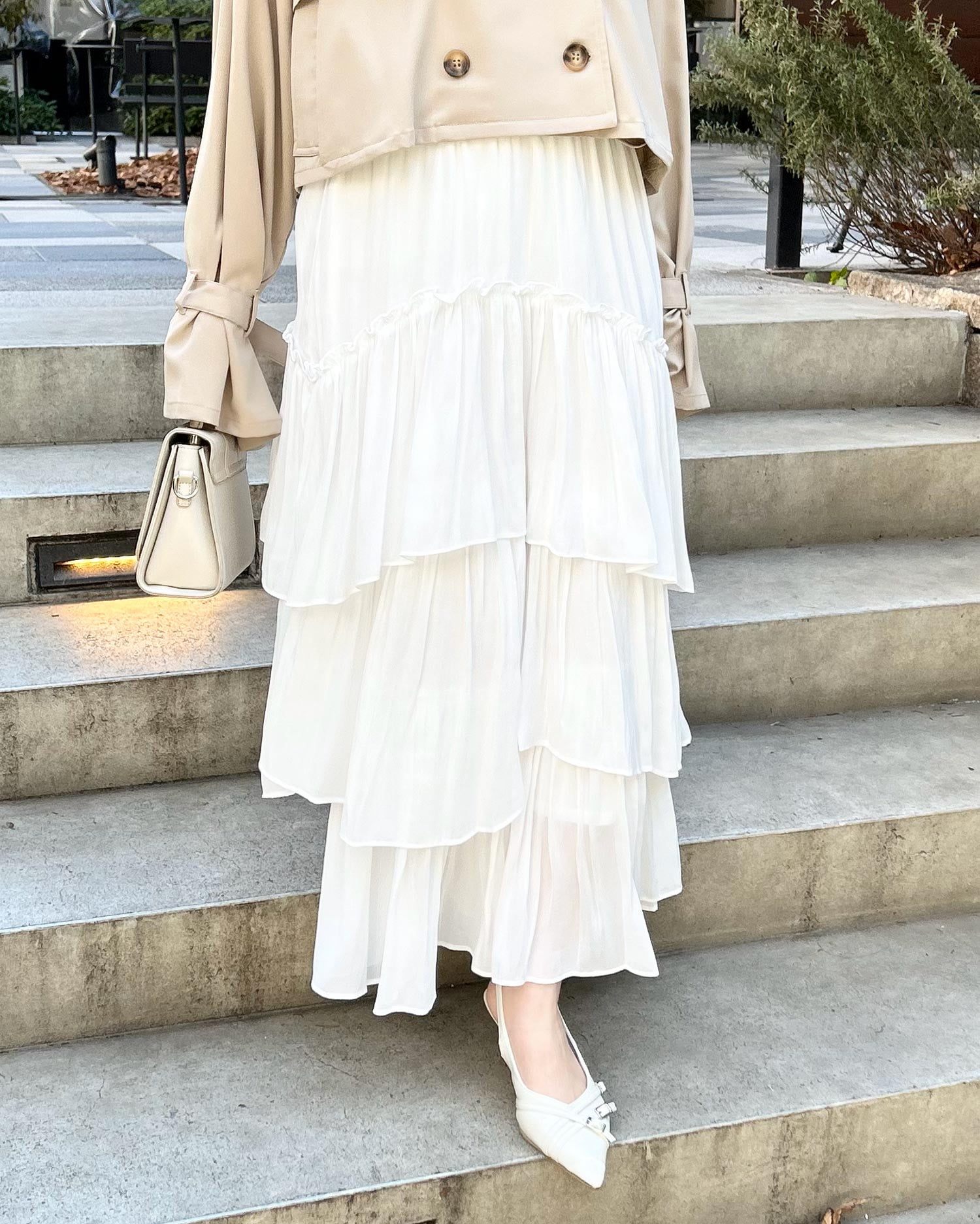 【ランダムに配置されたギャザーが目を惹くティアードスカート】