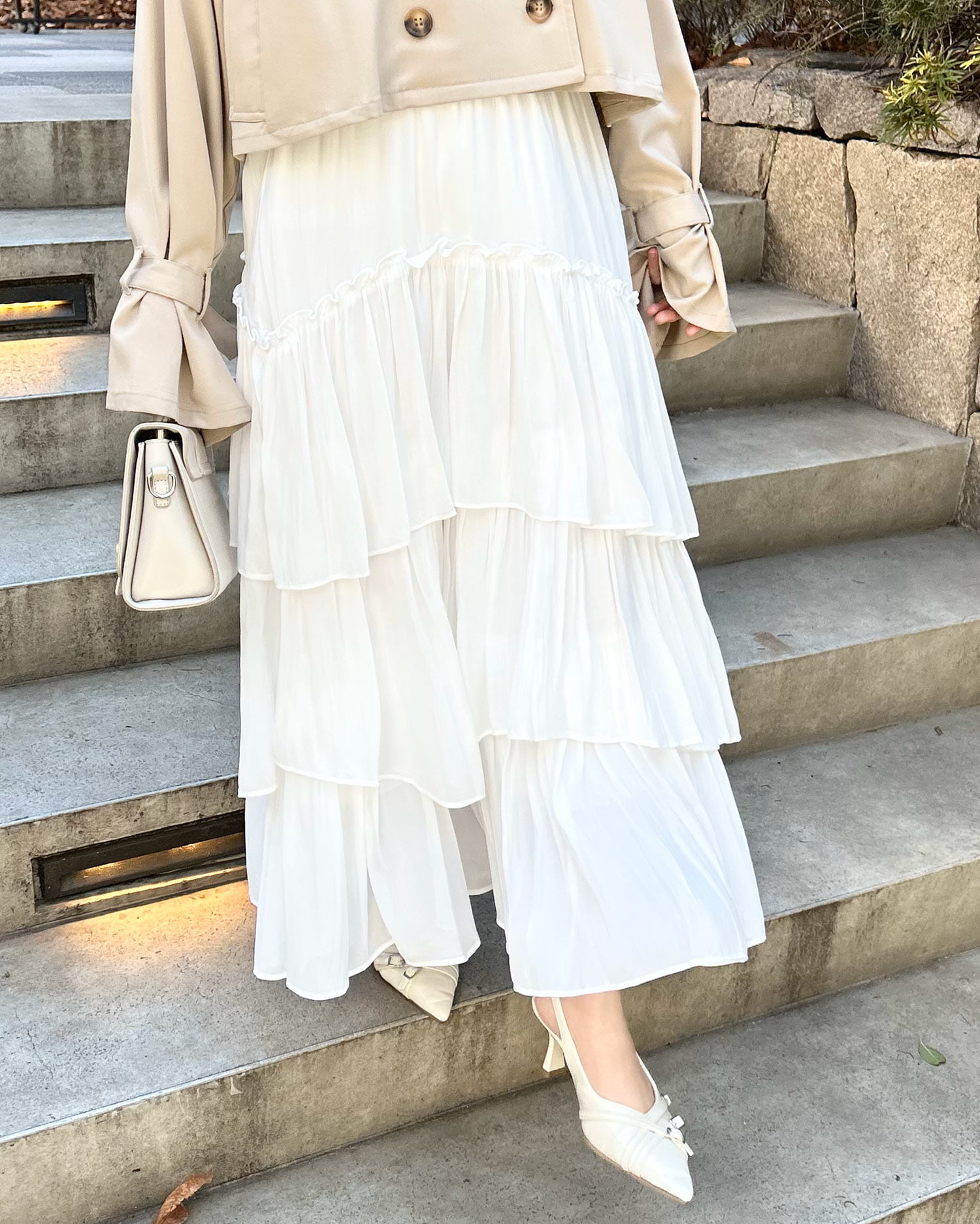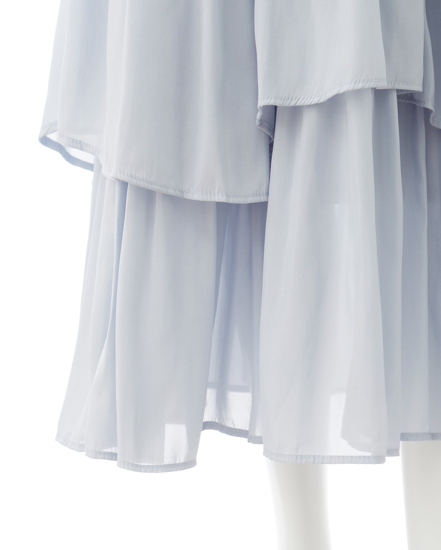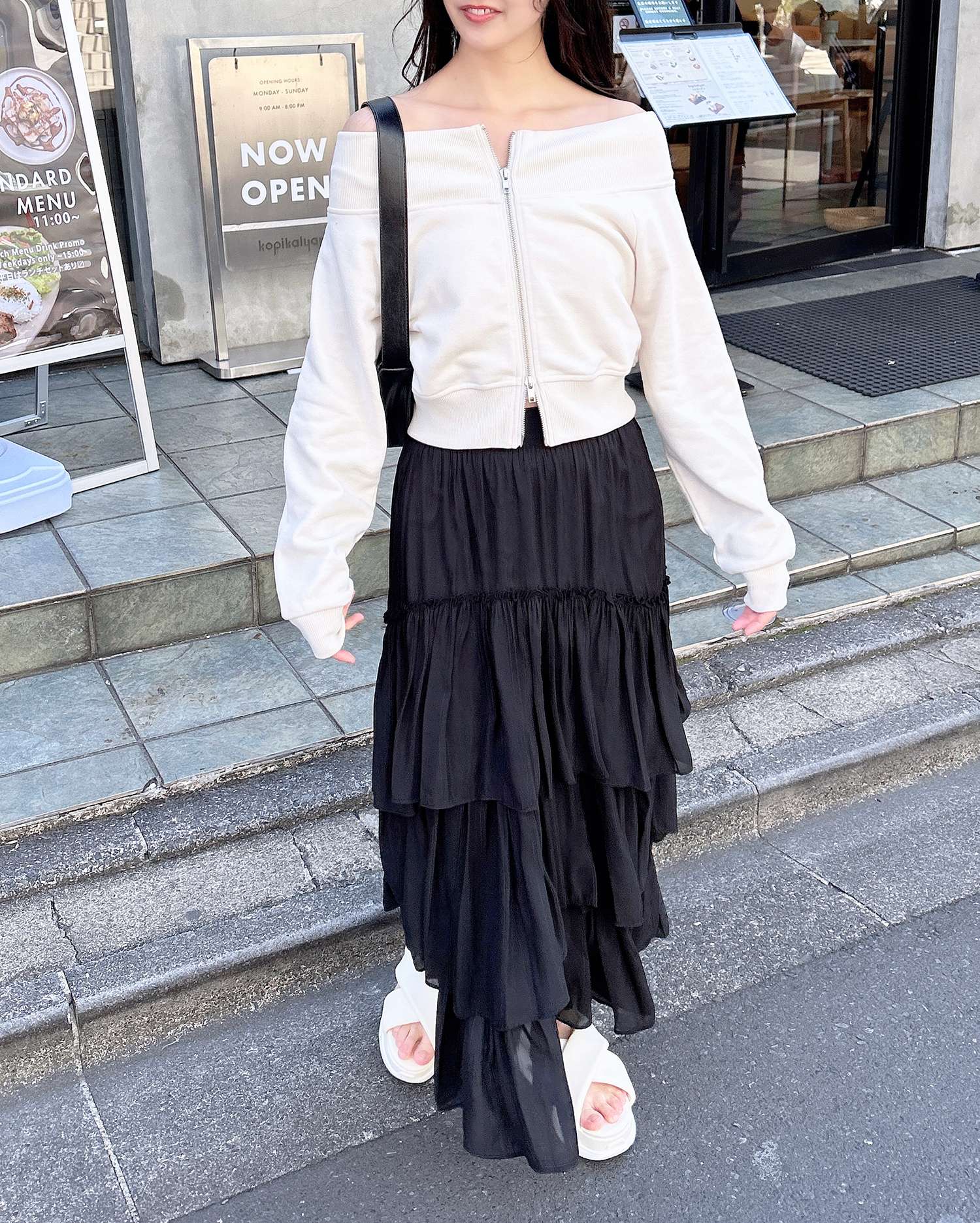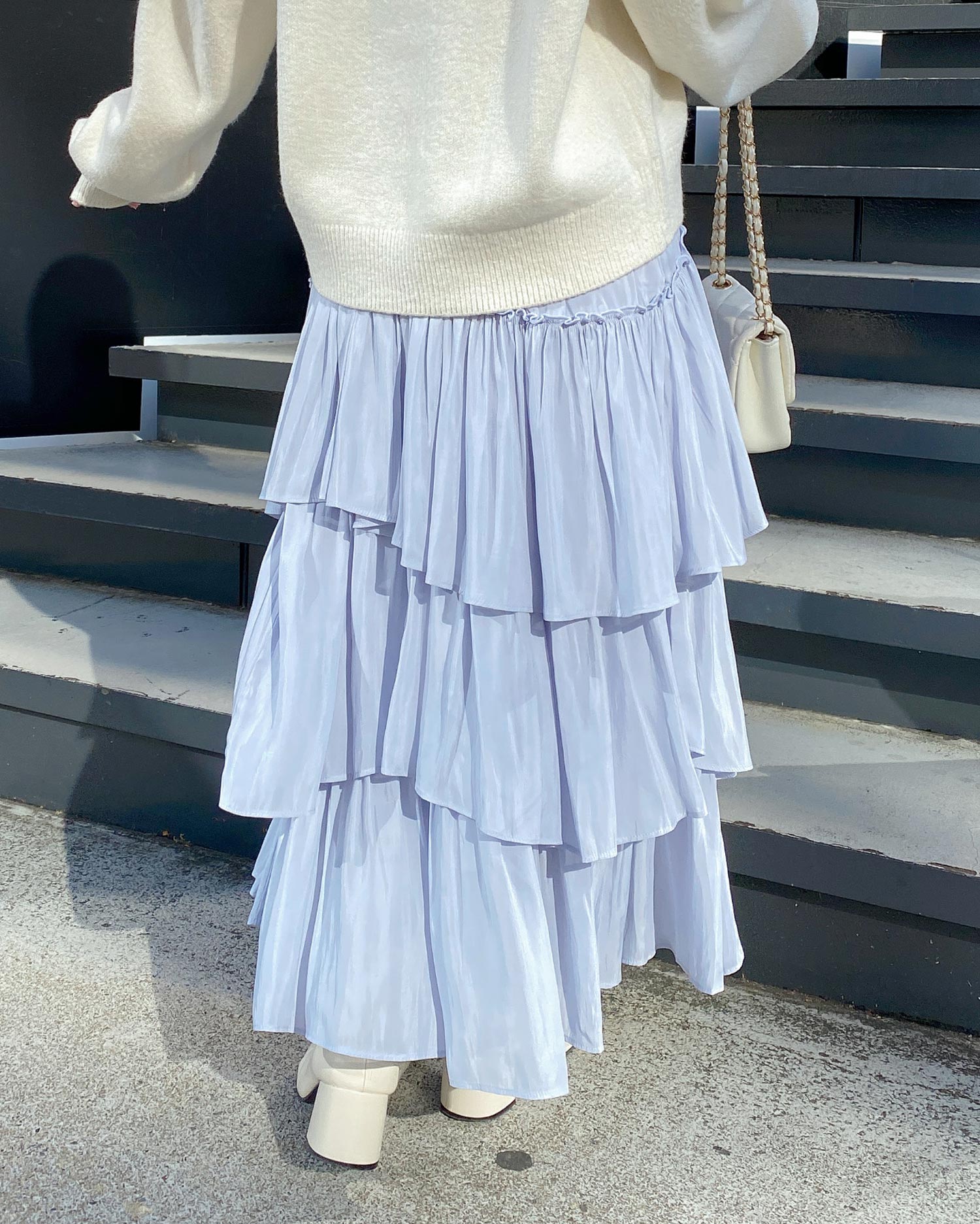 【ランダムに配置されたギャザーが目を惹くティアードスカート】