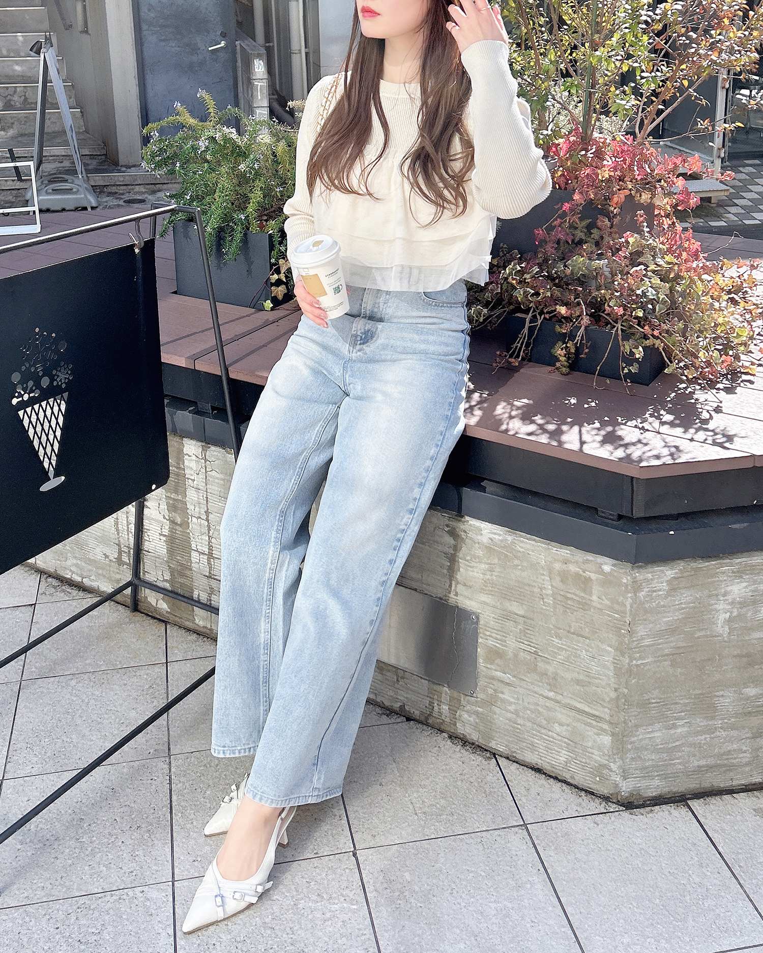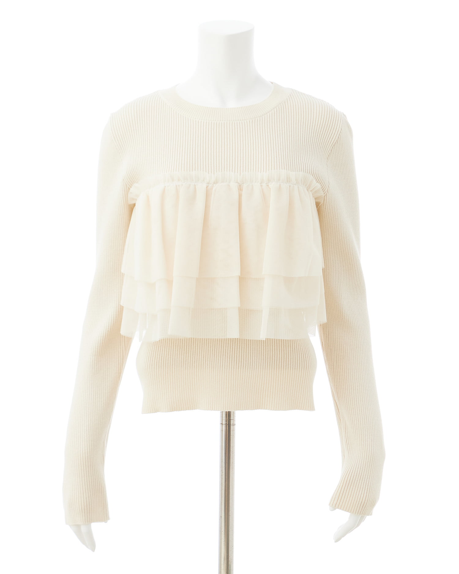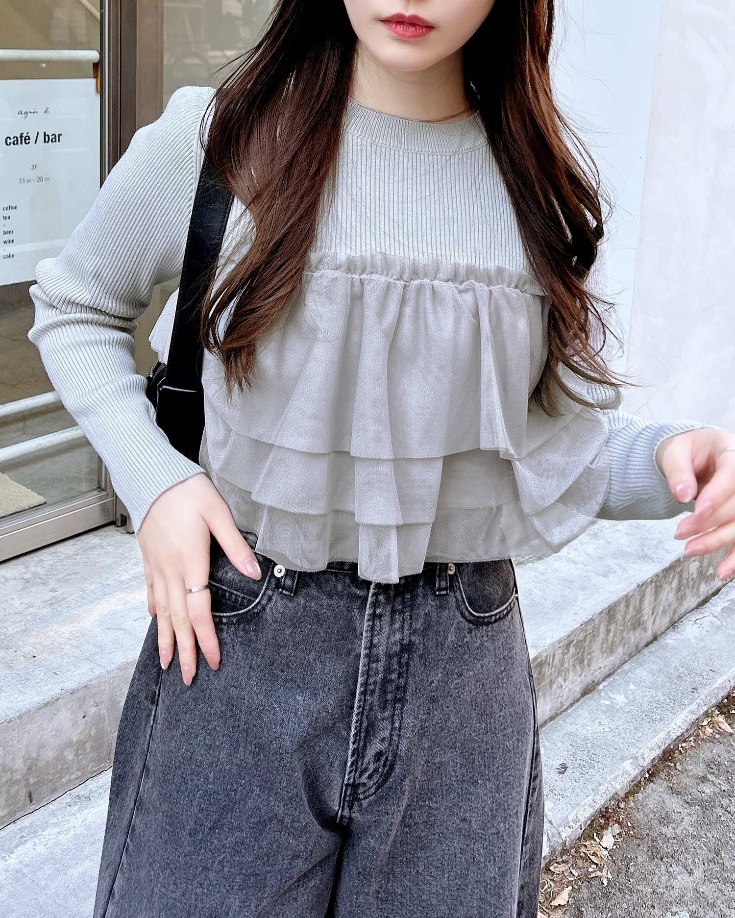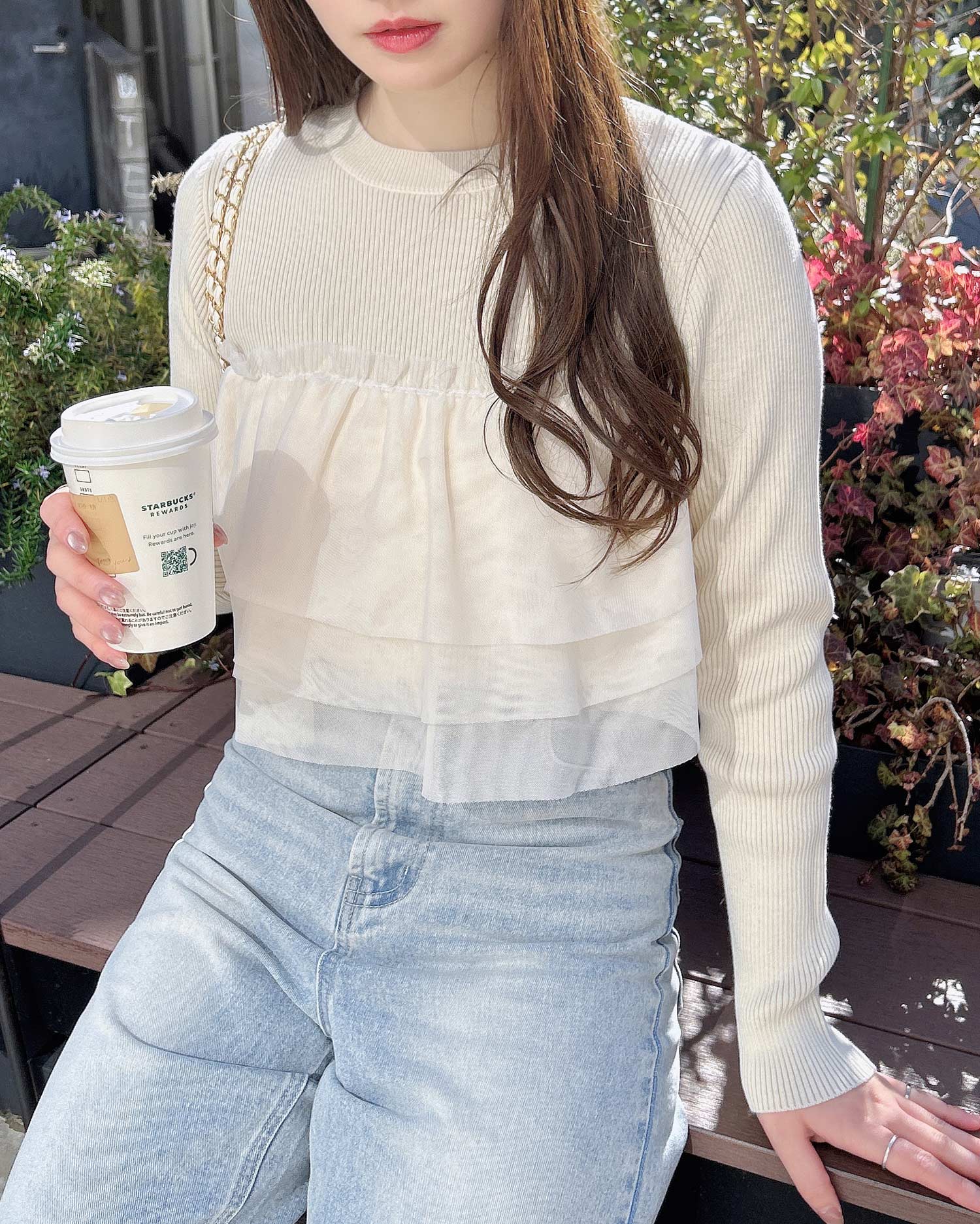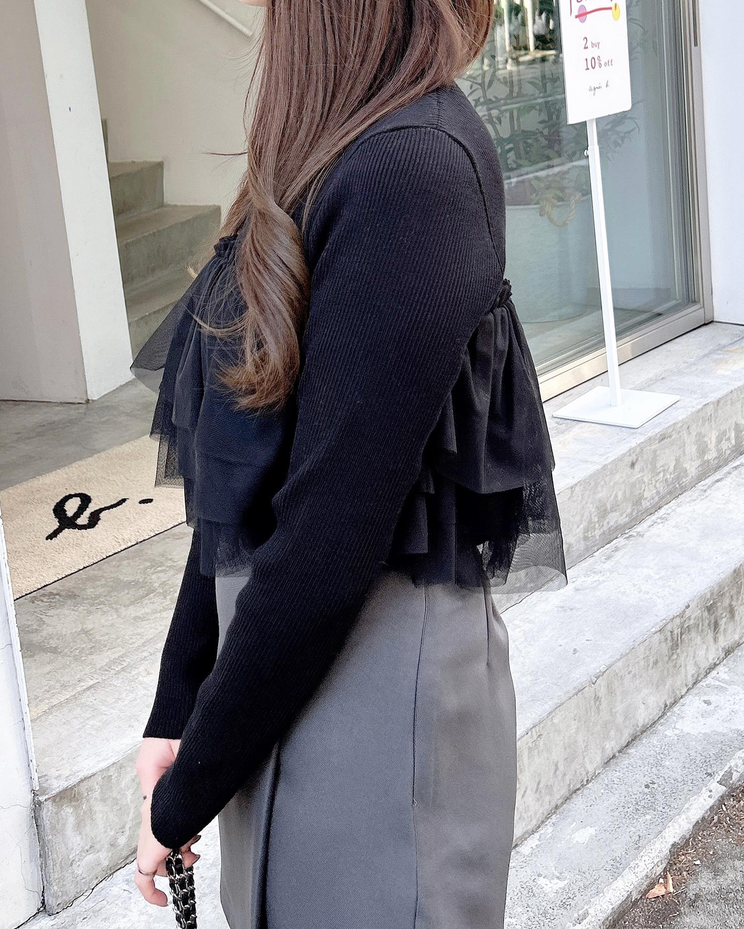 シンプルなリブニットにチュールフリルで表情をプラス。
