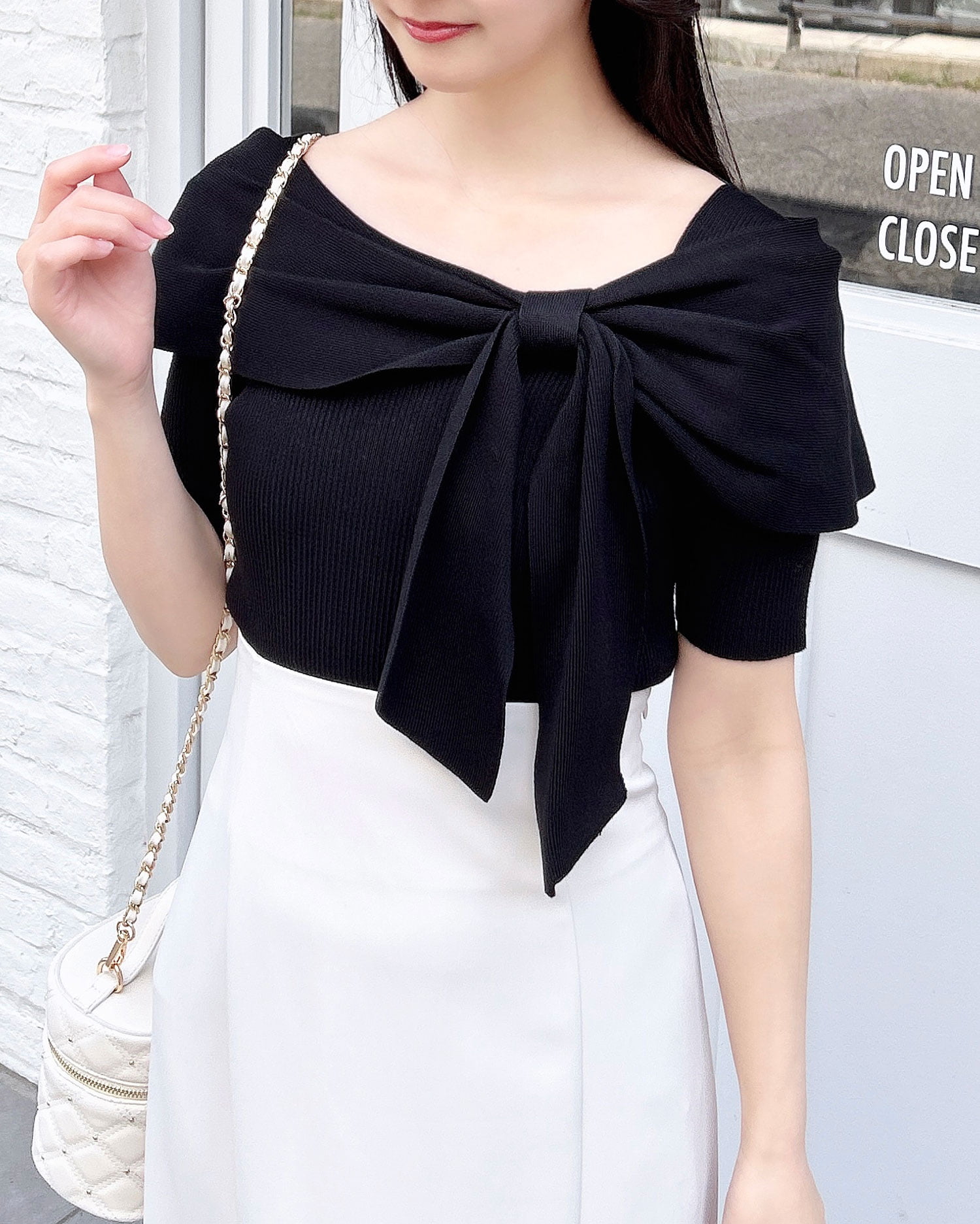 大きなリボンがコーディネイトにフェミニンなアクセントをプラスしてくれます。
