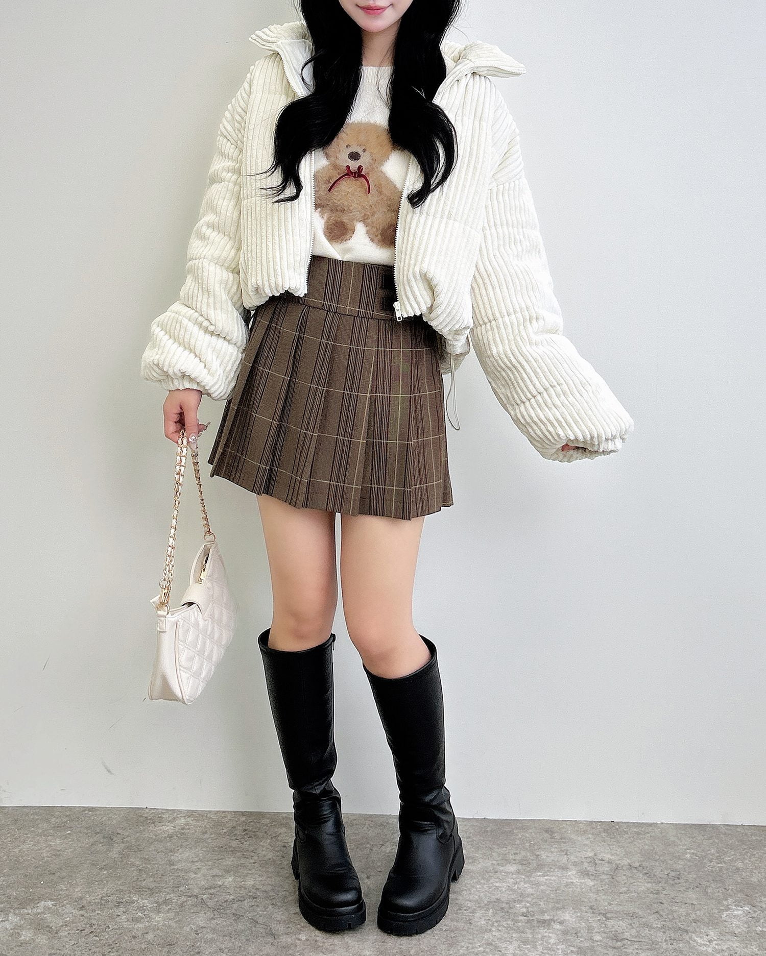 ロングブーツを合わせたガーリースタイルがおすすめです。