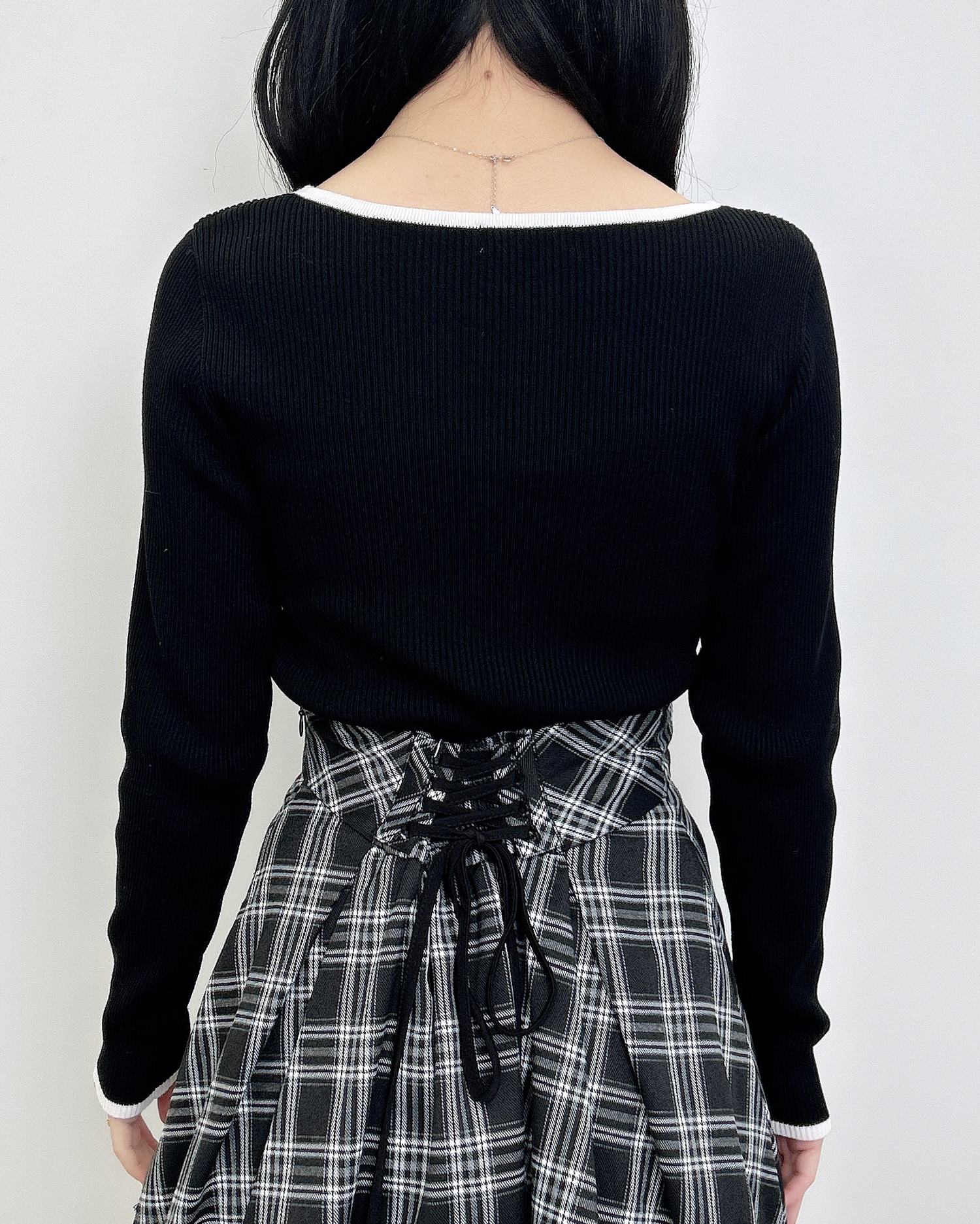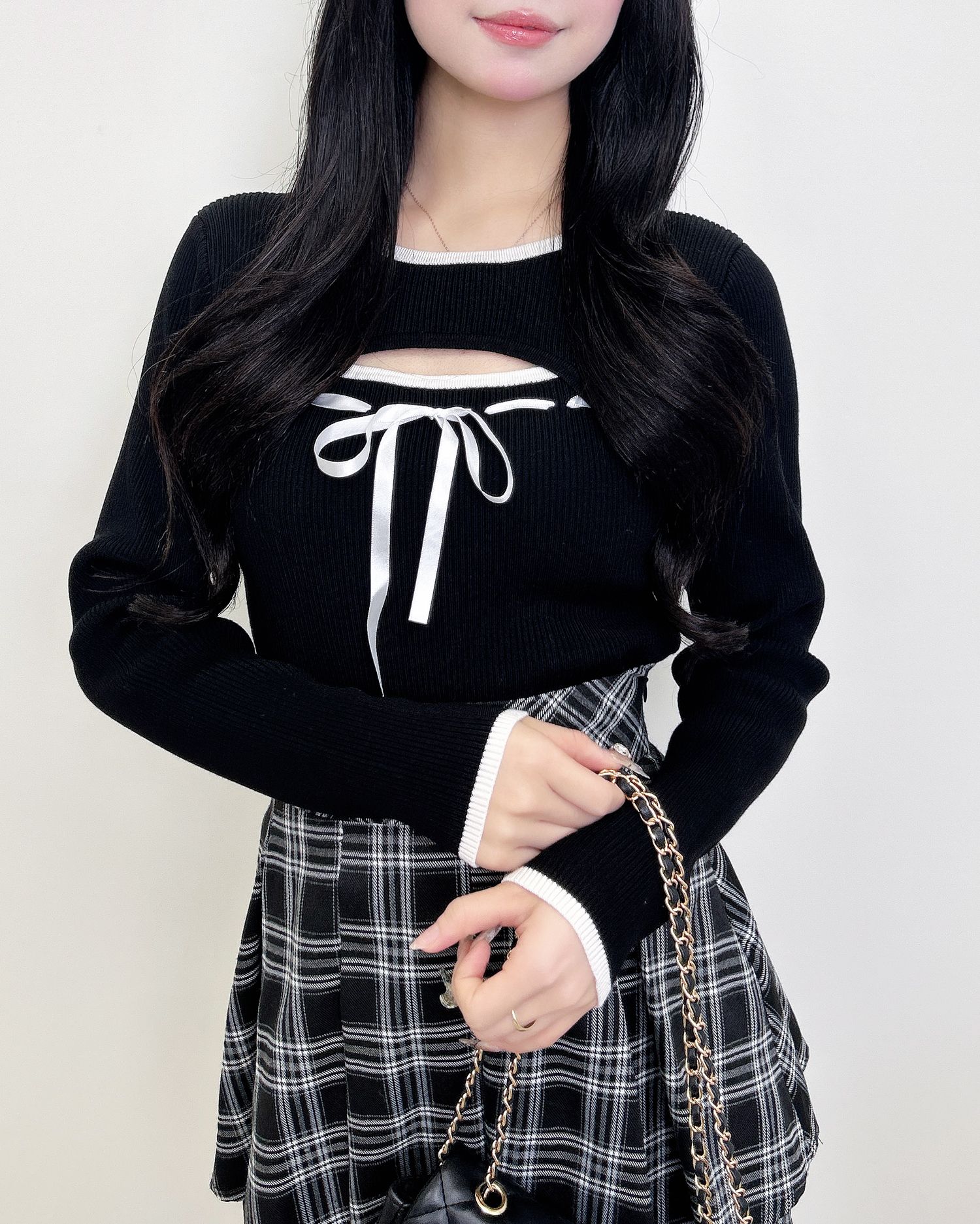 リブトップスやニットとの合わせでガーリーなコーデに。
