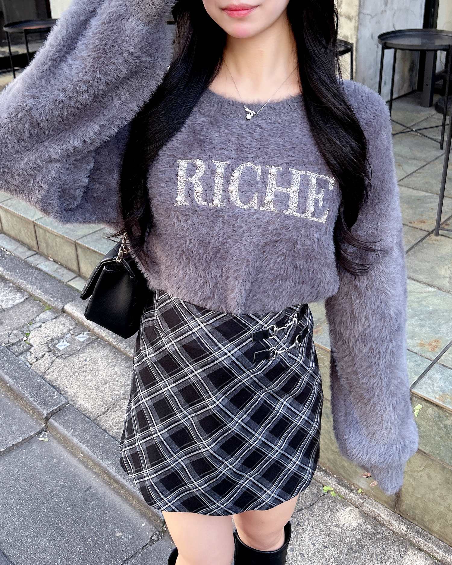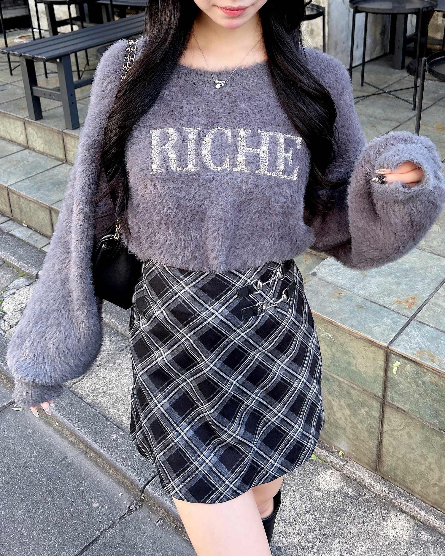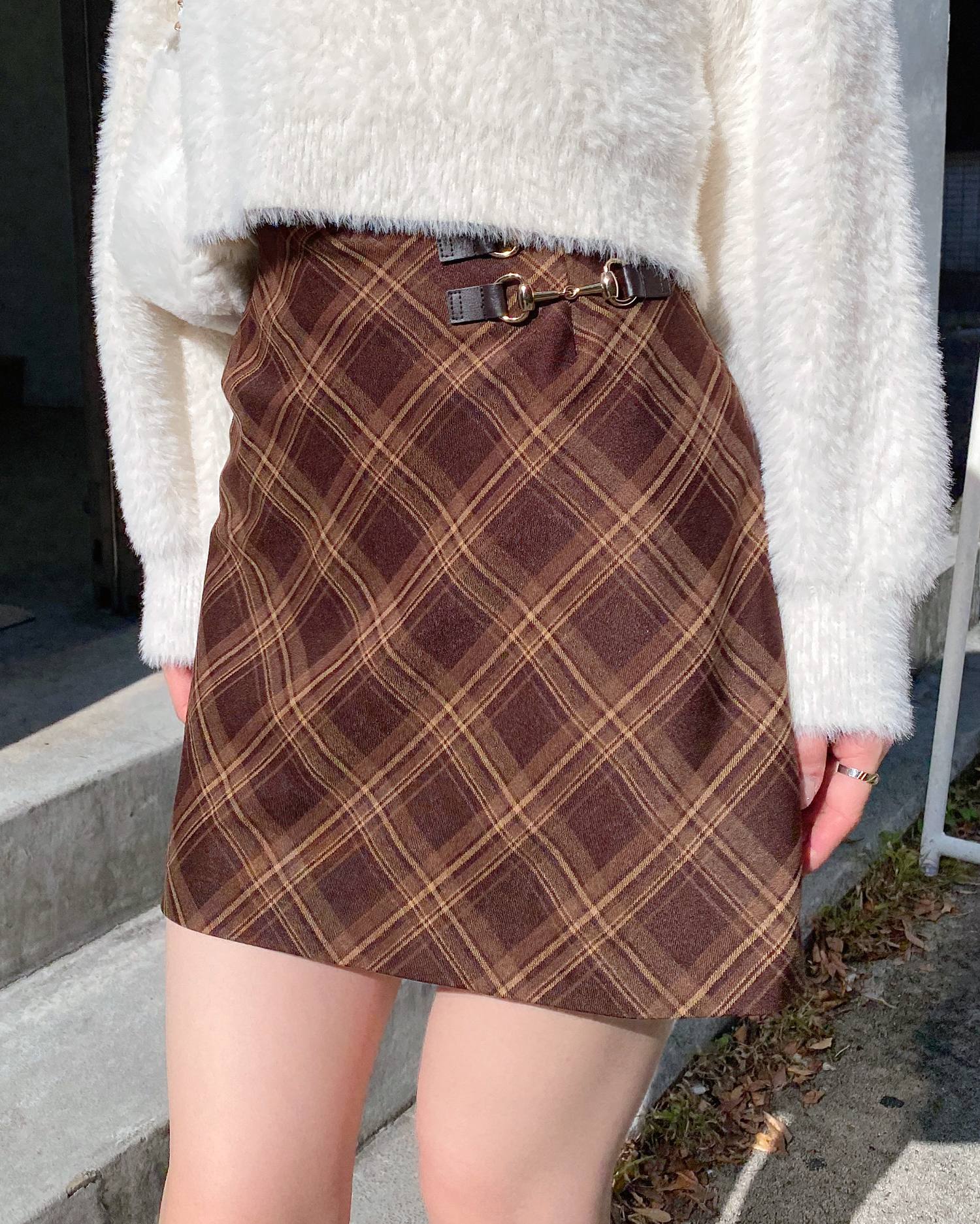 トップスをシンプルなものにするとチェックがより印象的に♪