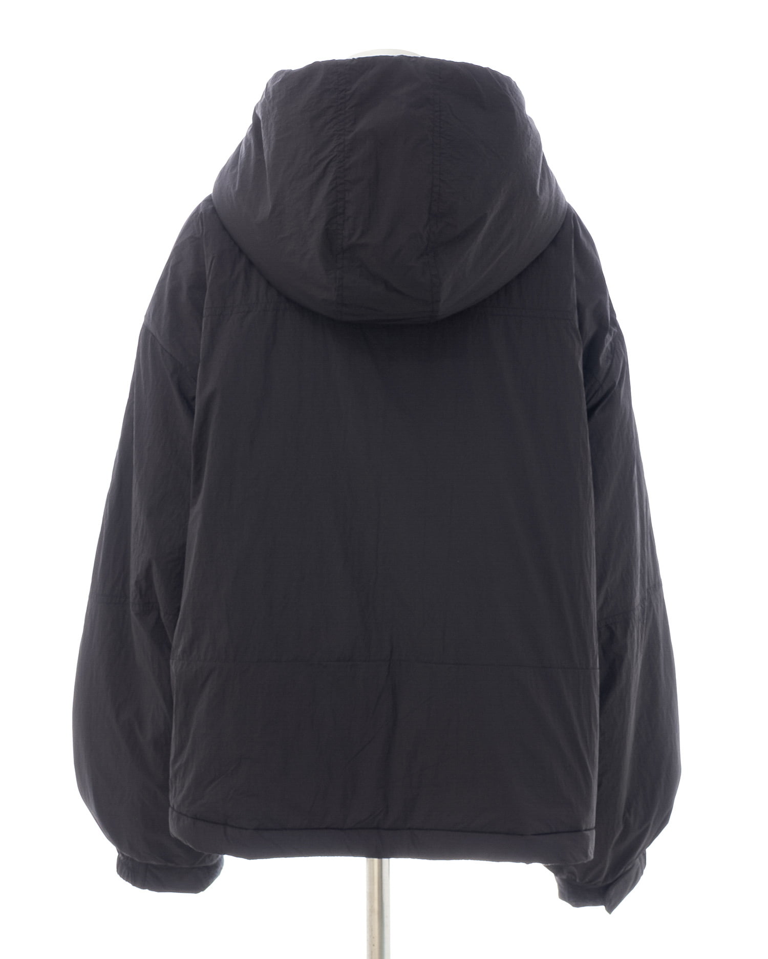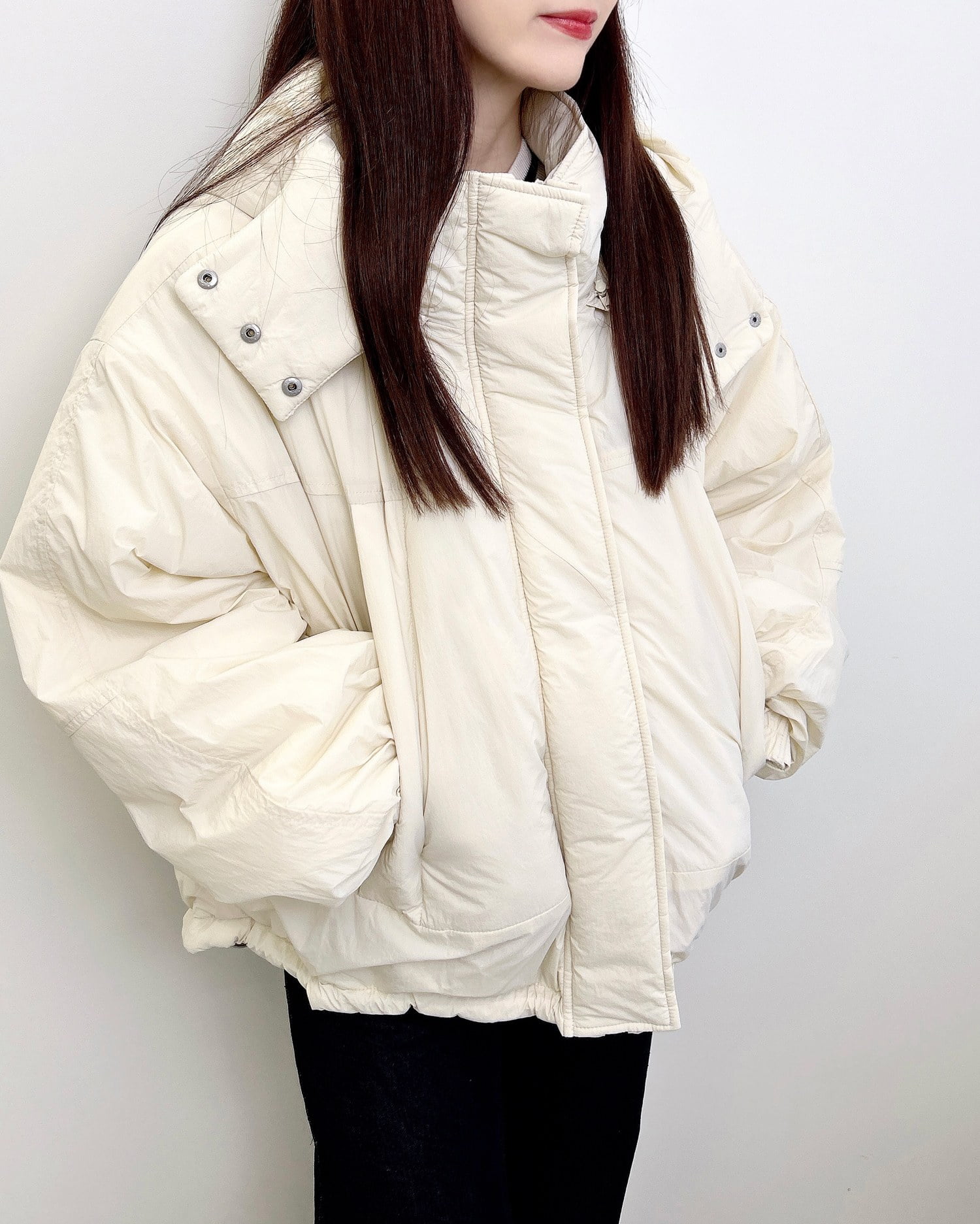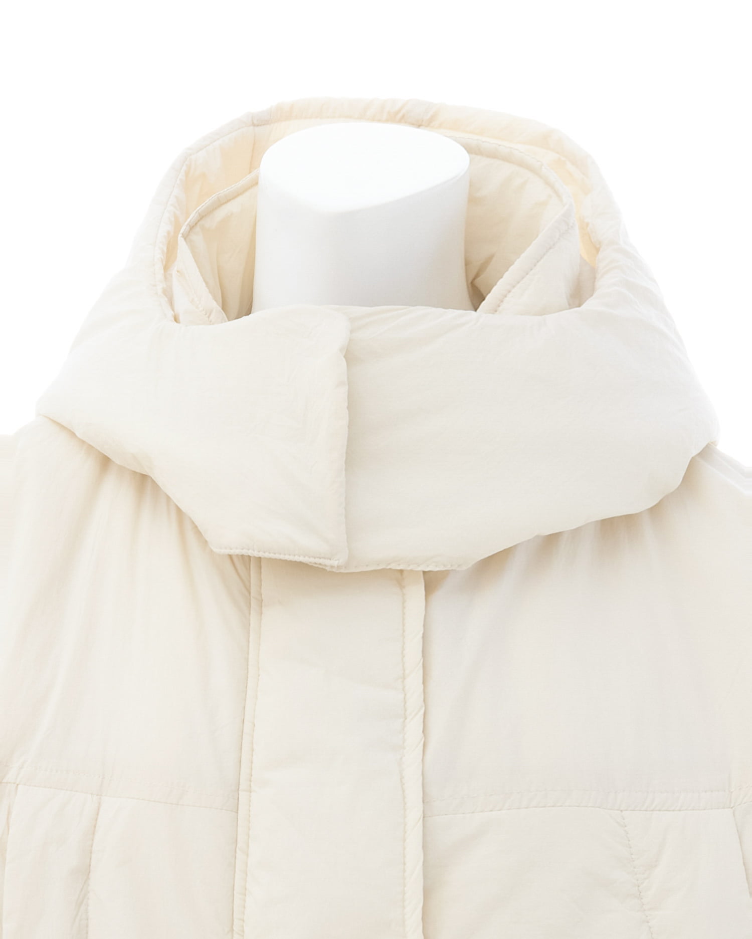 フード部分のスナップボタンを留めれば首元まで覆うスタンド風ネックに。