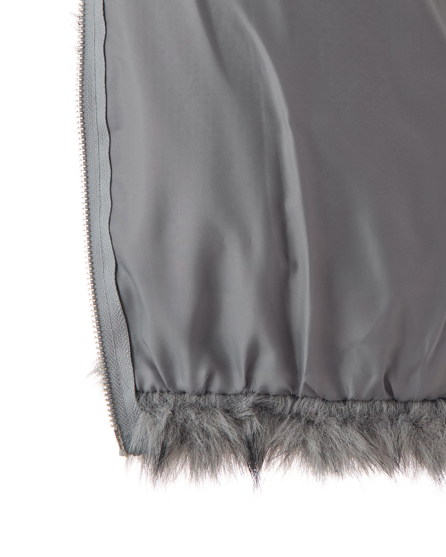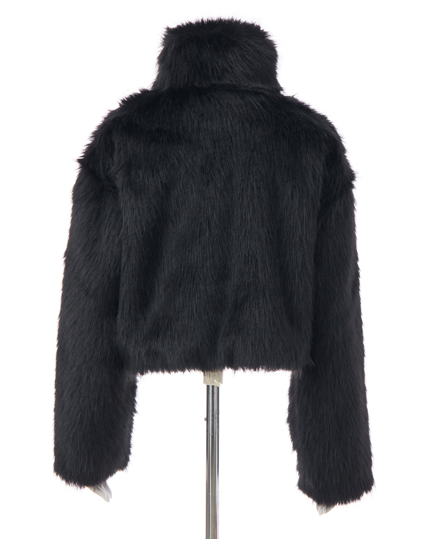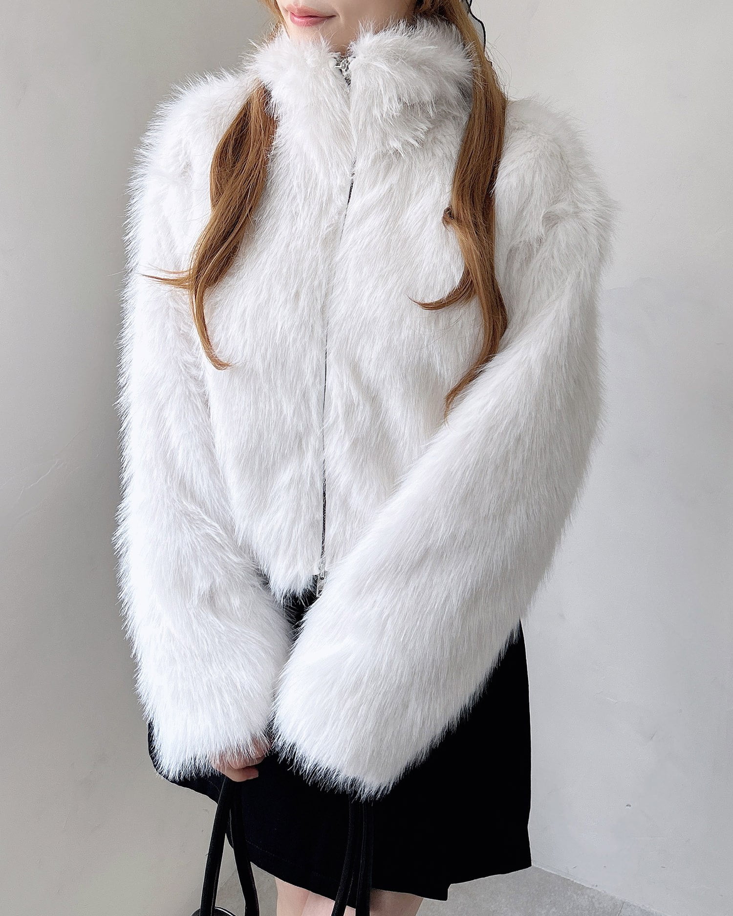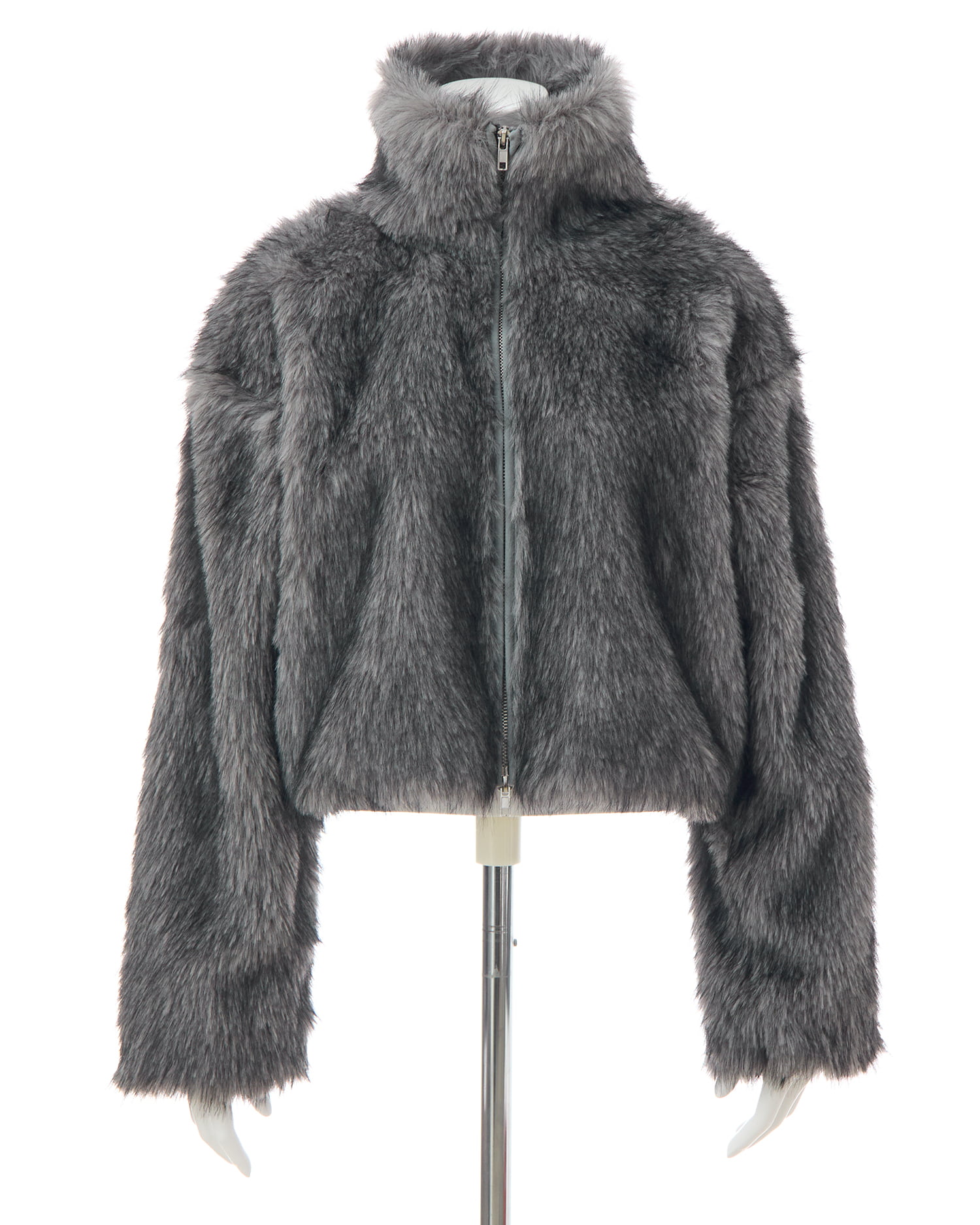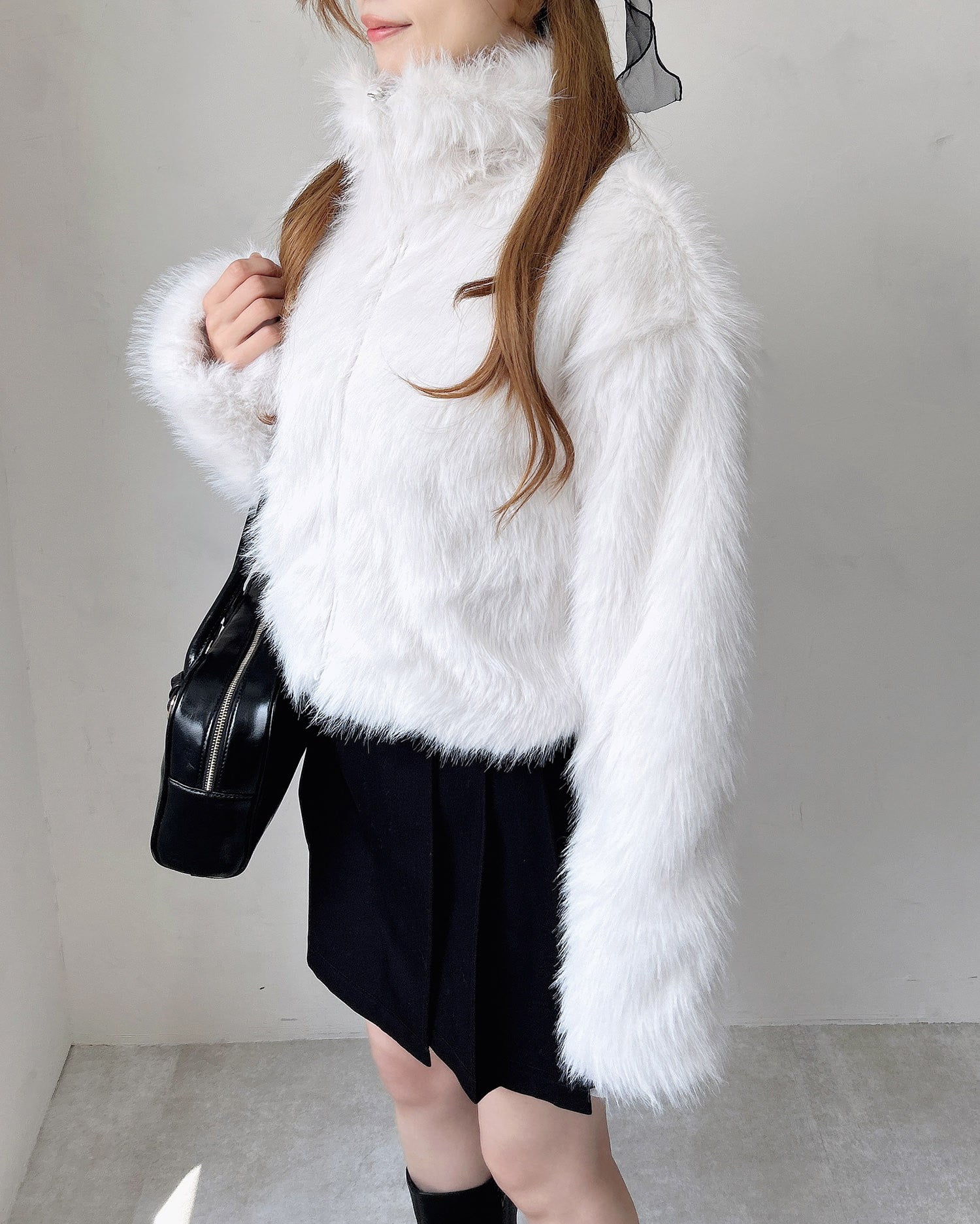 毛足の長いエコファーがゴージャスな印象のブルゾンコート。