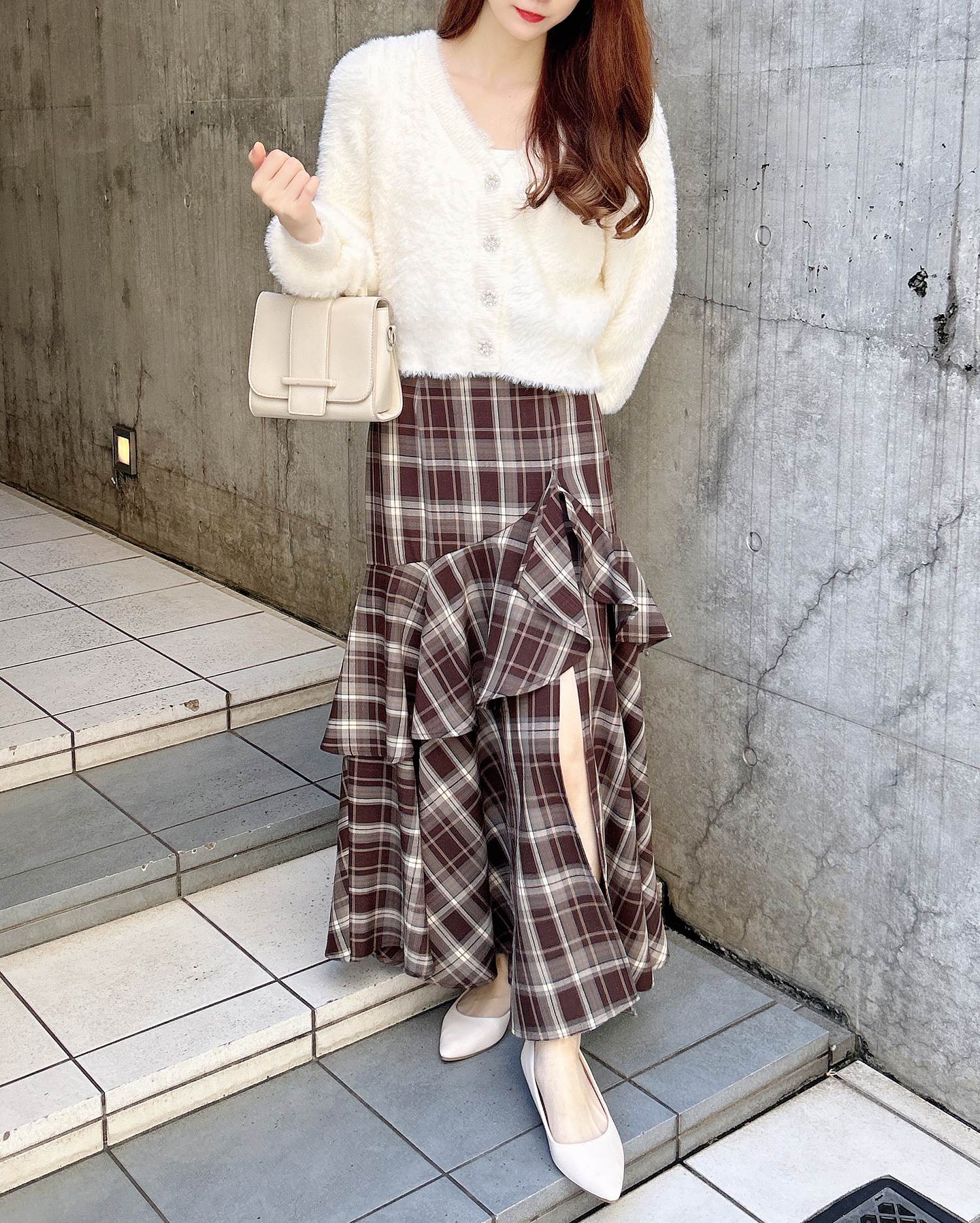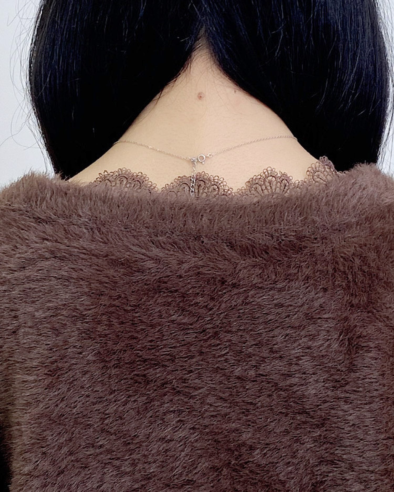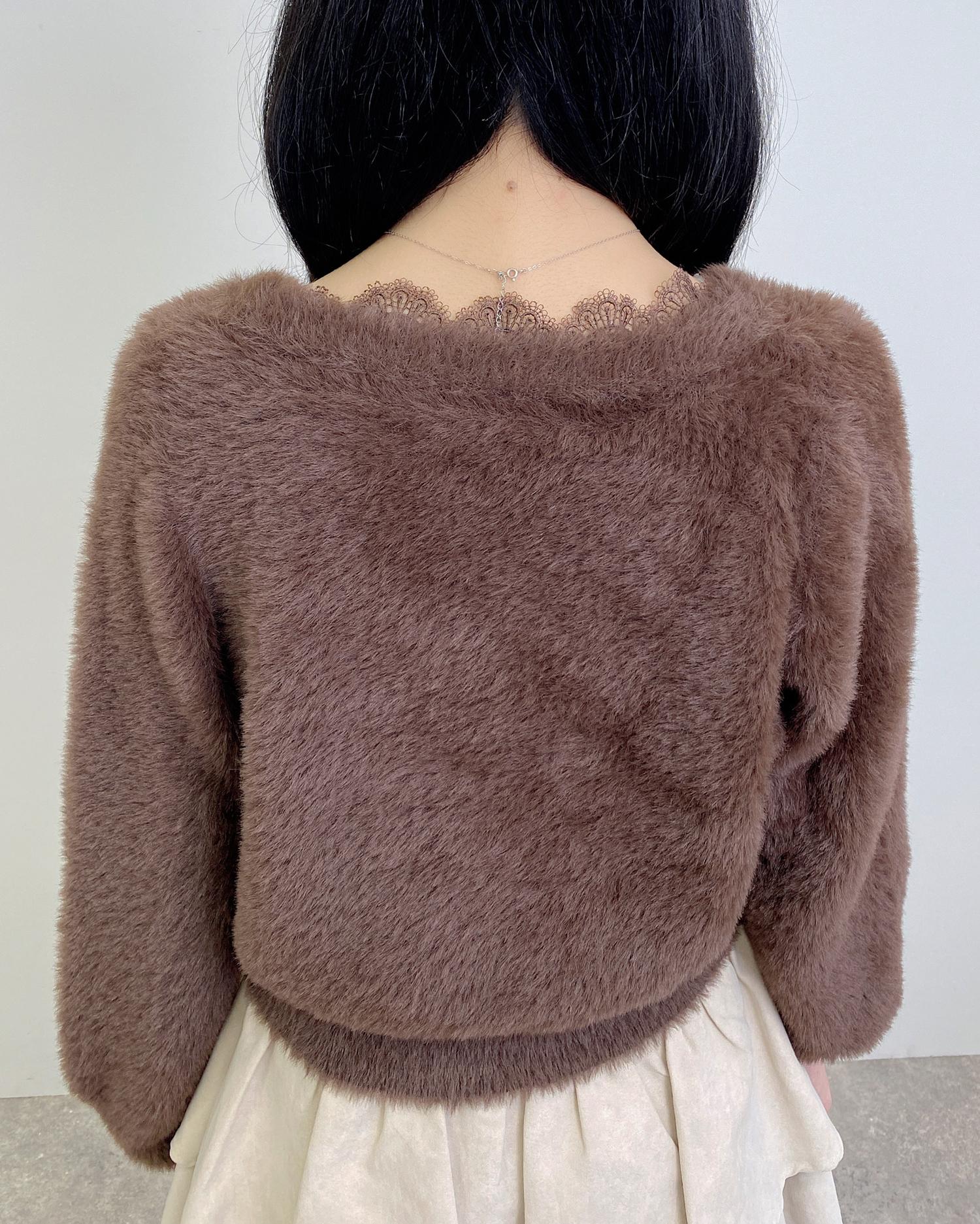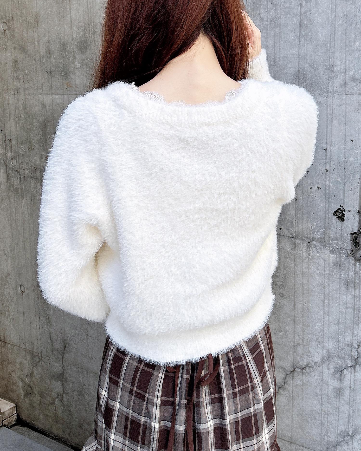 【広めに開いたVネックに繊細なレースをあしらったデザイン性のあるカーディガン】