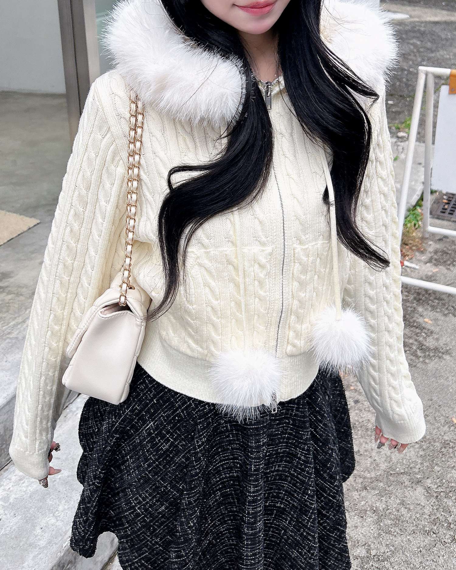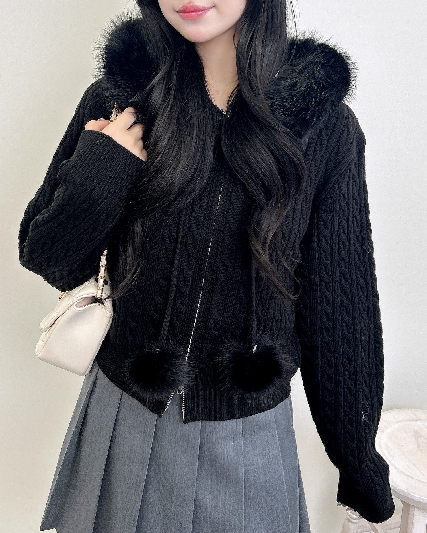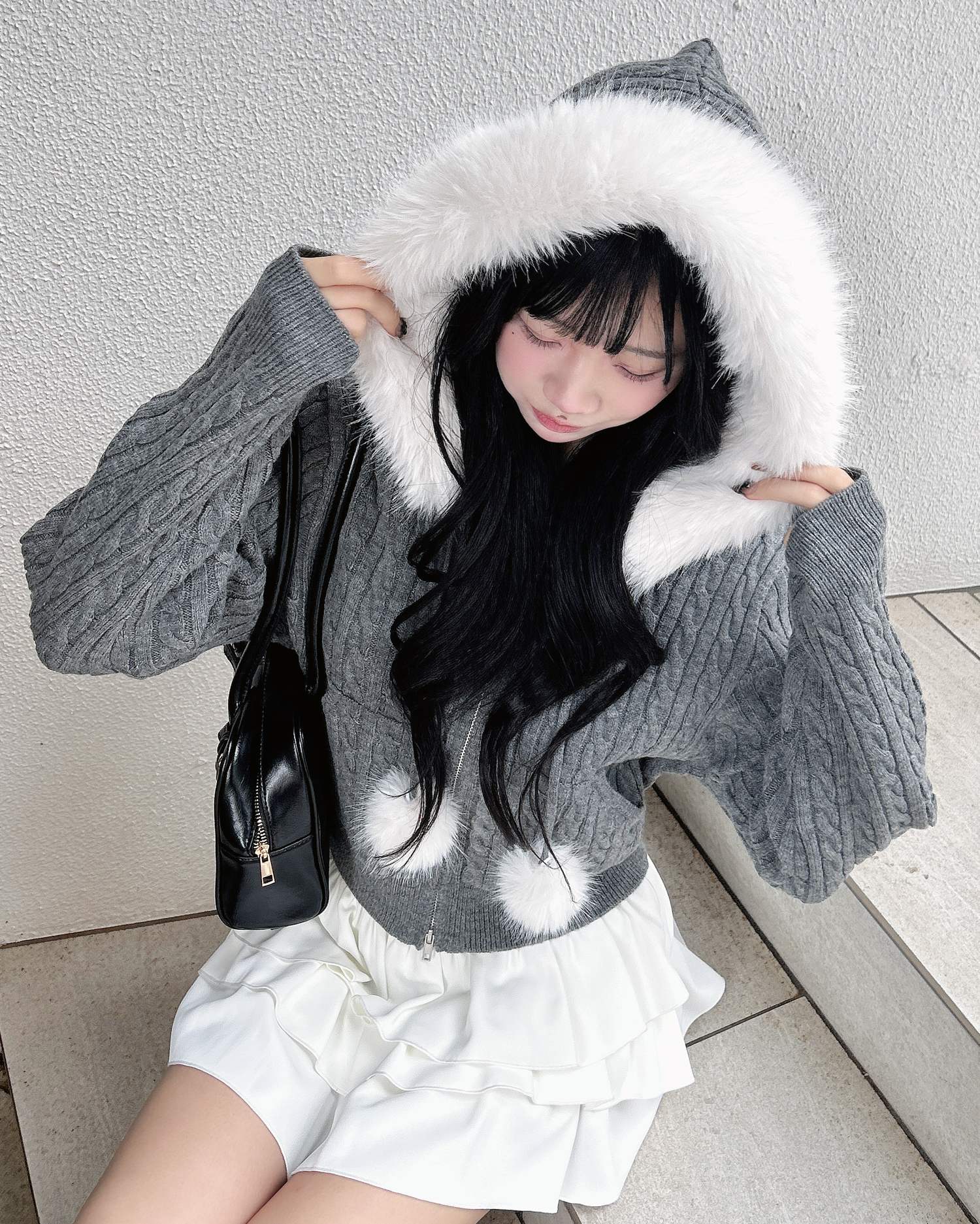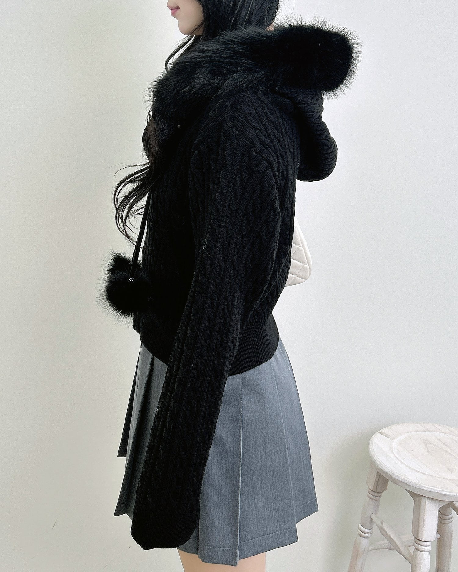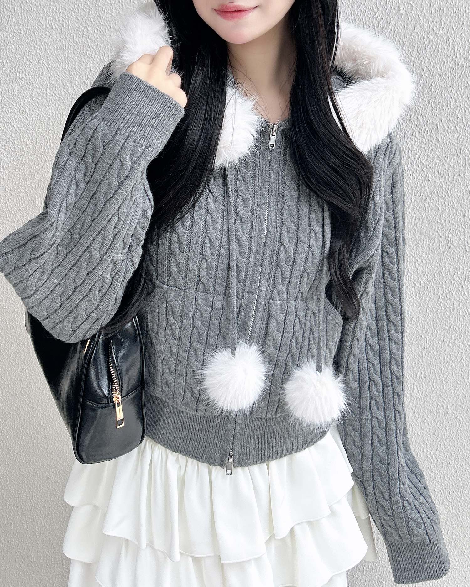 【トレンドのフェイクファーフード×ポンポン付!冬の贅沢ニットパーカー♡】