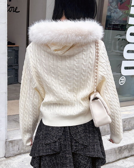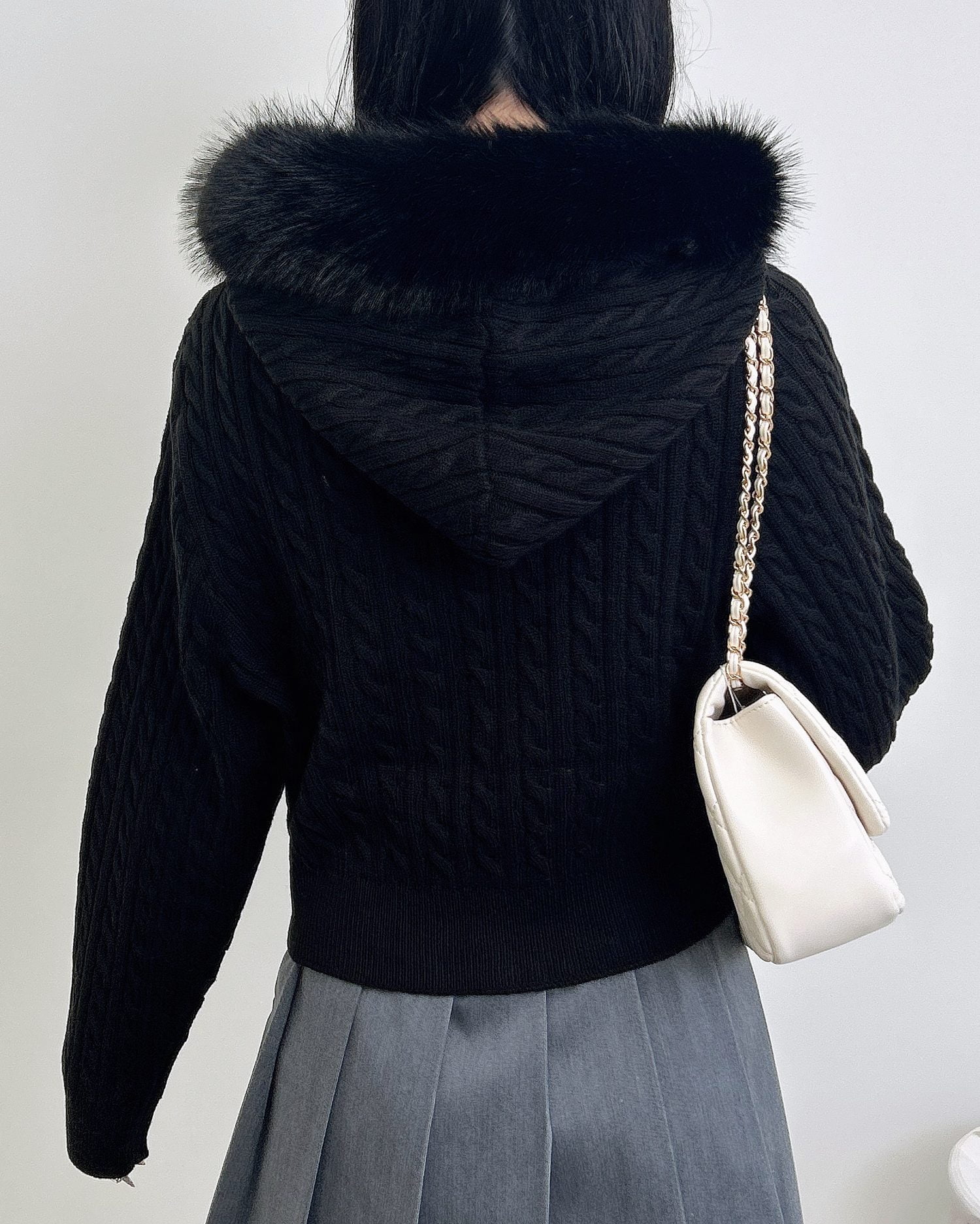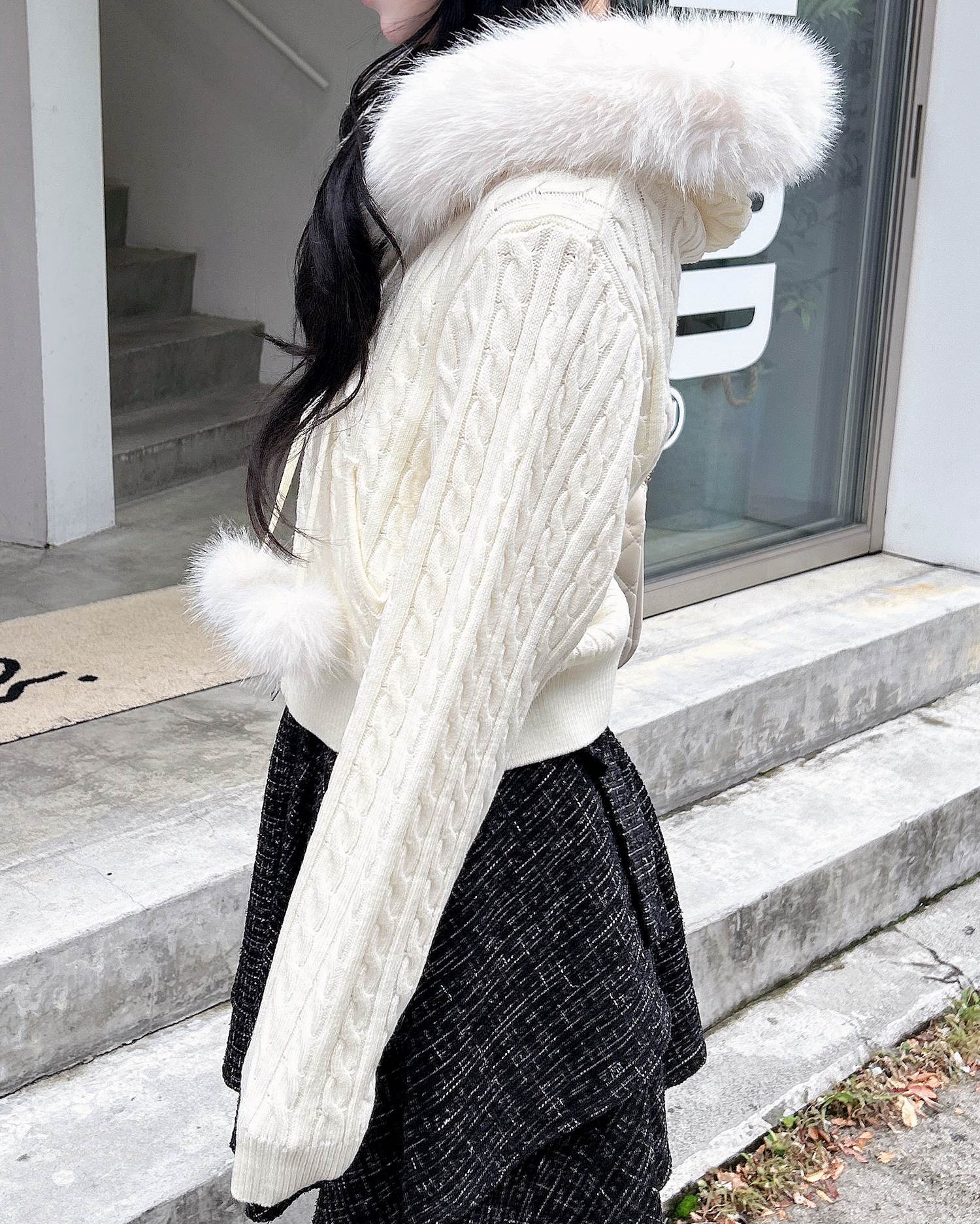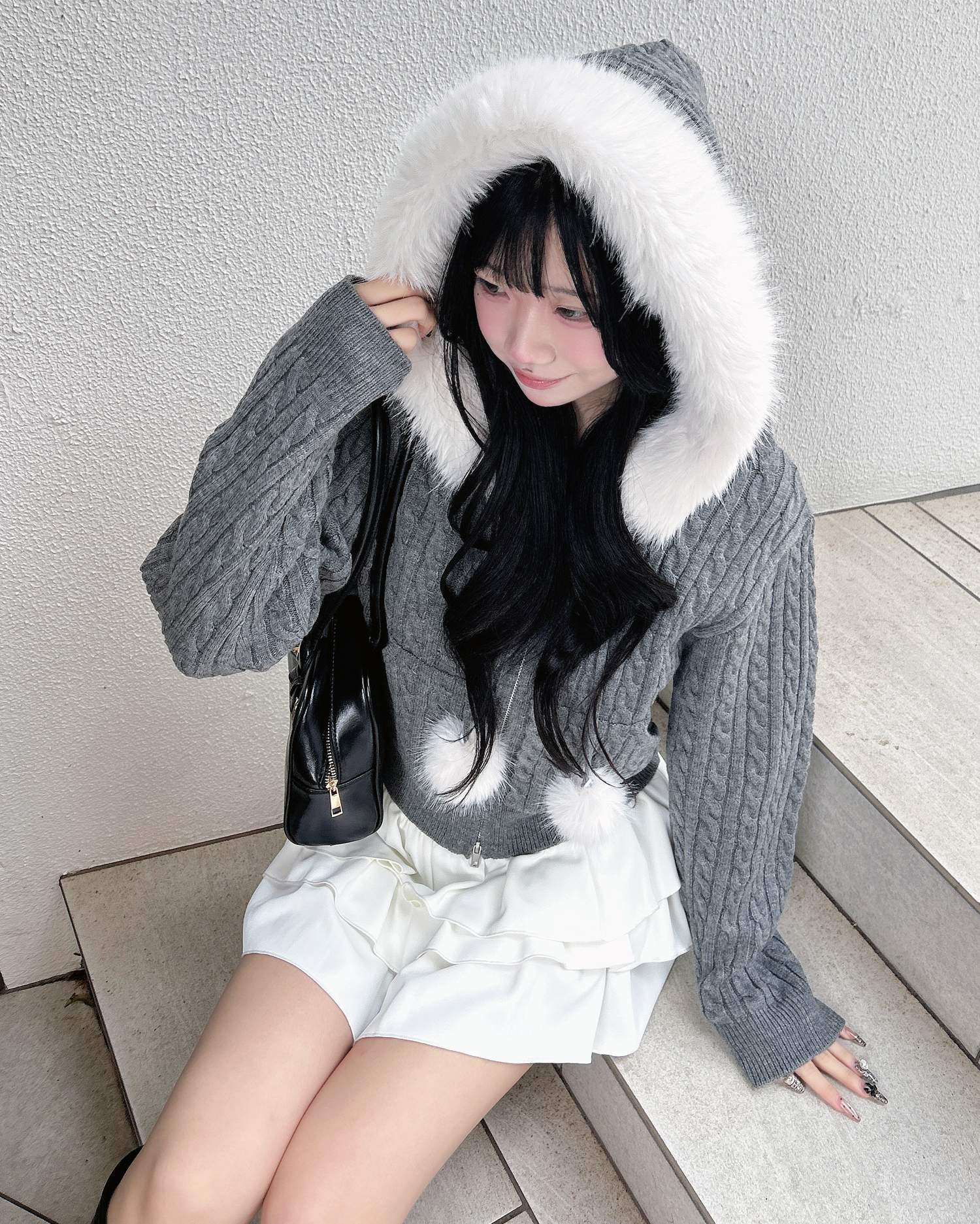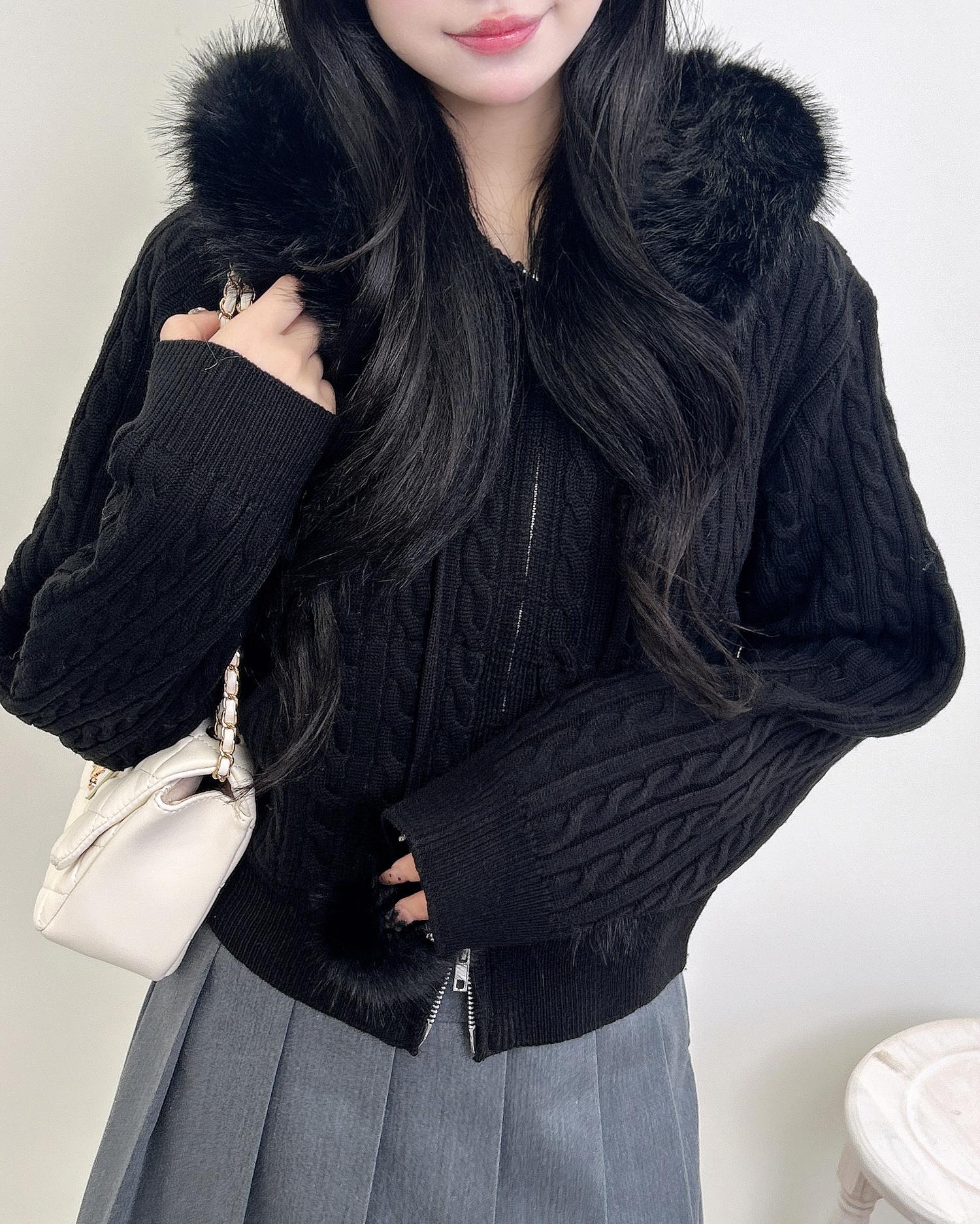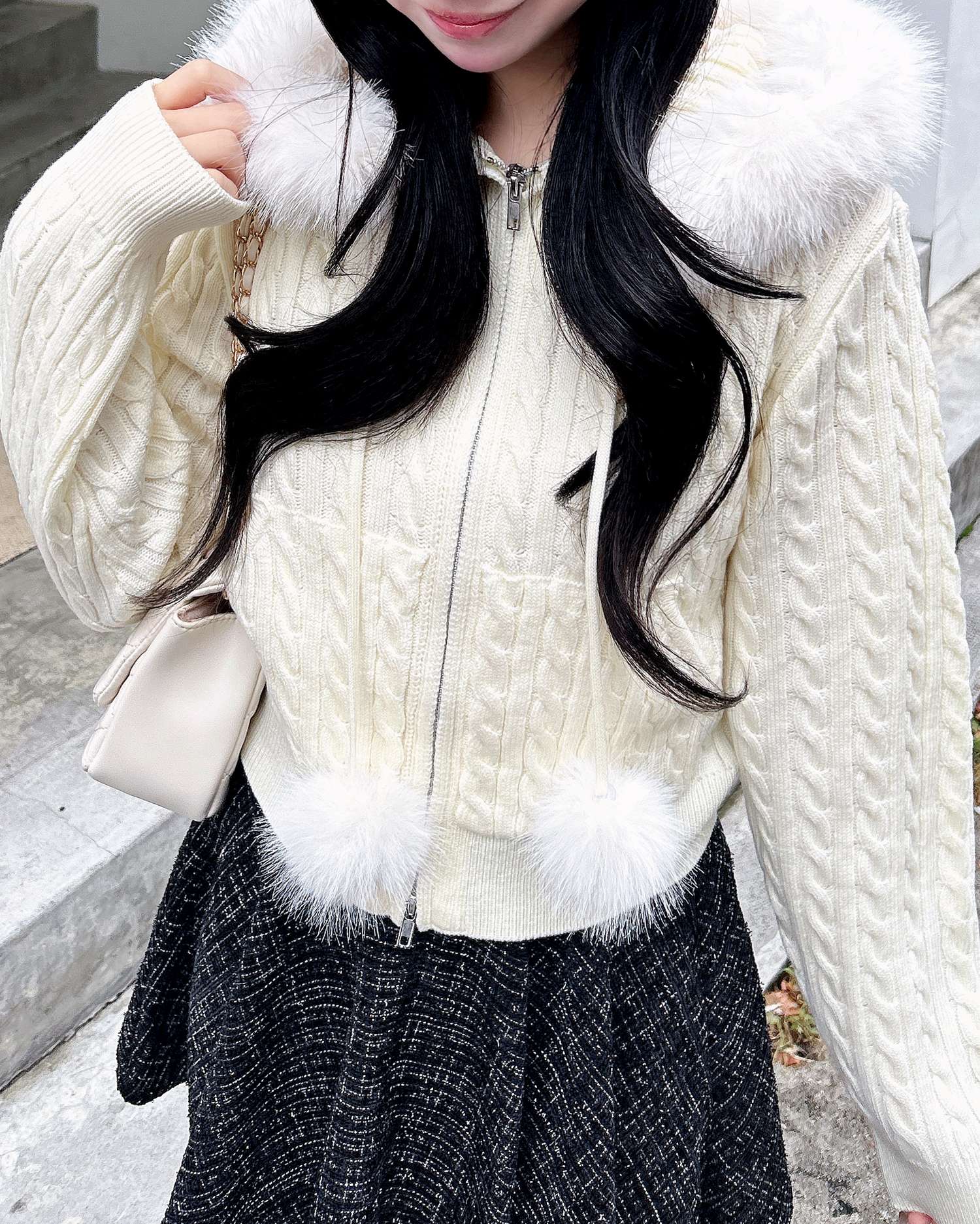 【トレンドのフェイクファーフード×ポンポン付!冬の贅沢ニットパーカー♡】