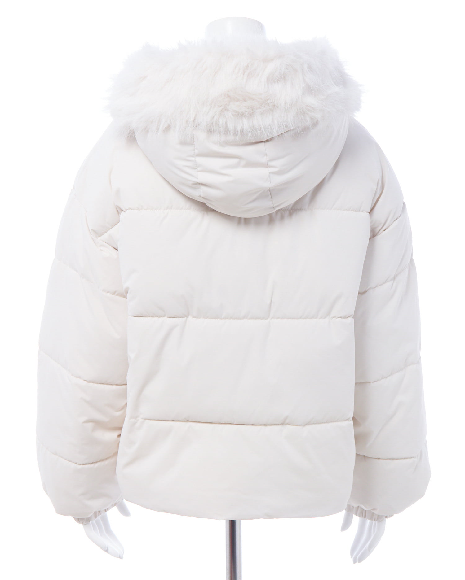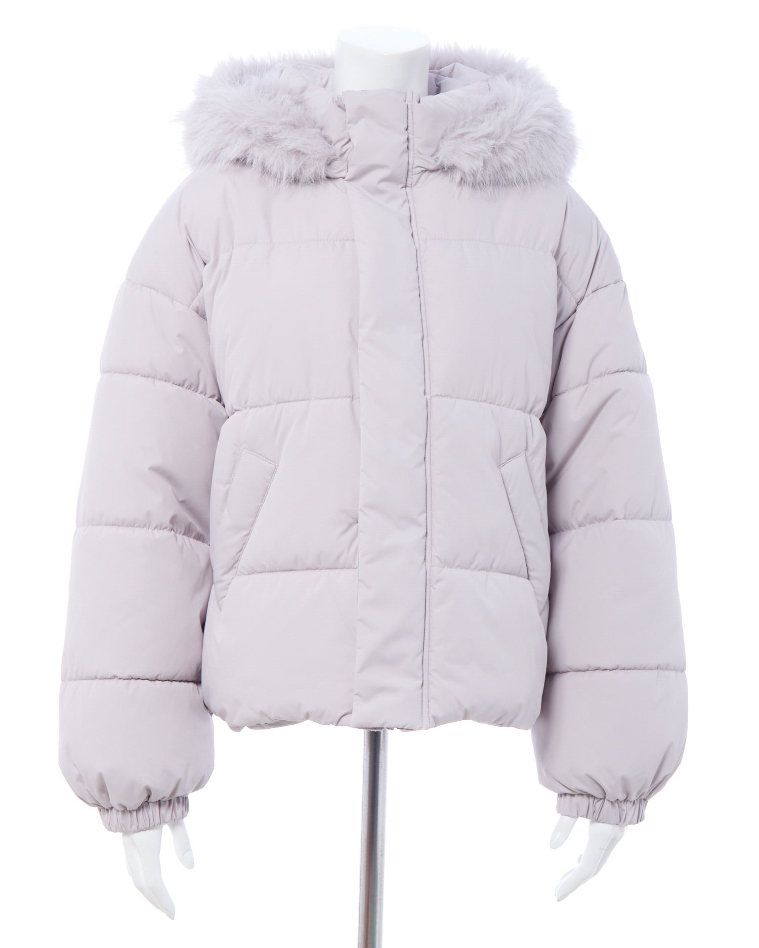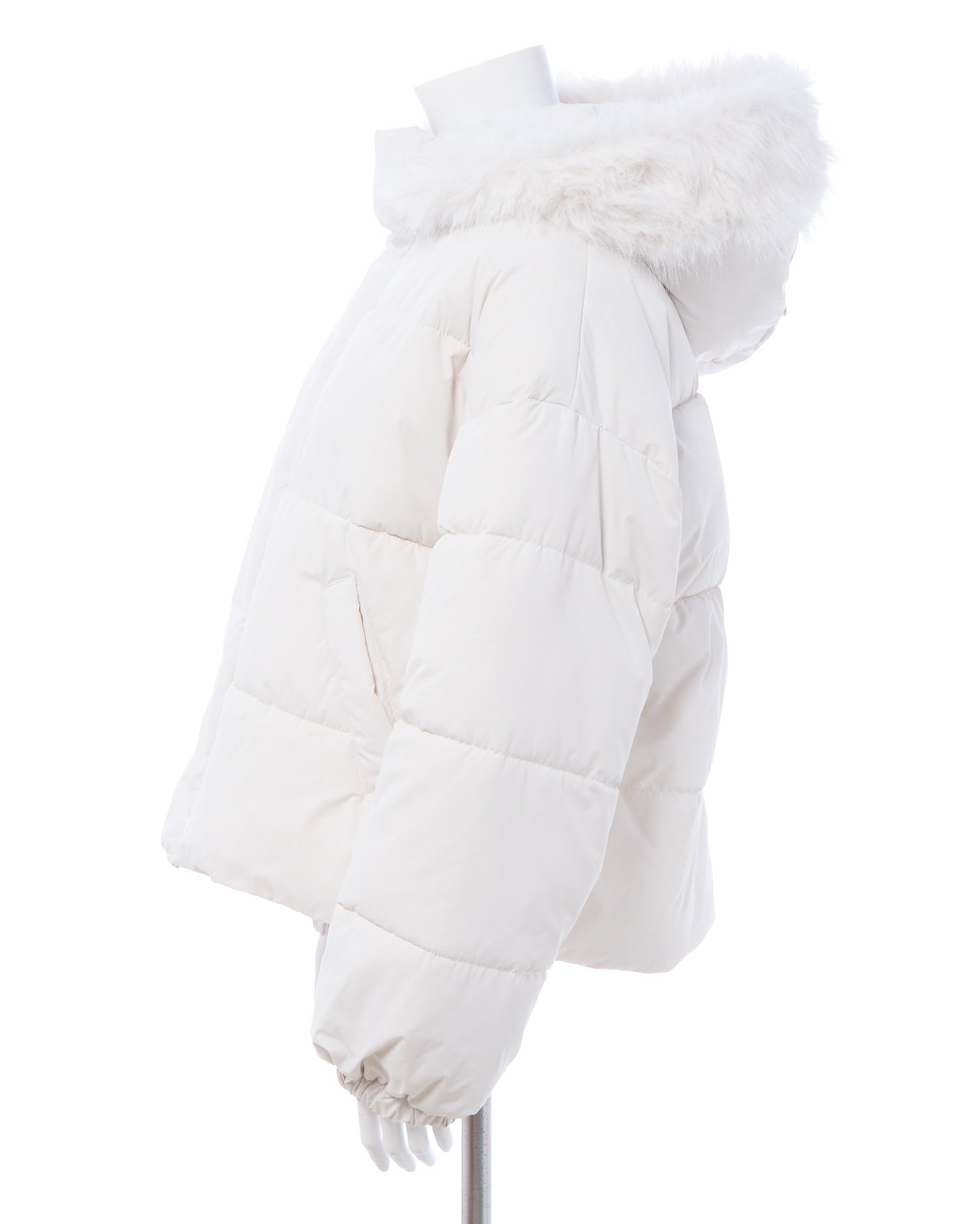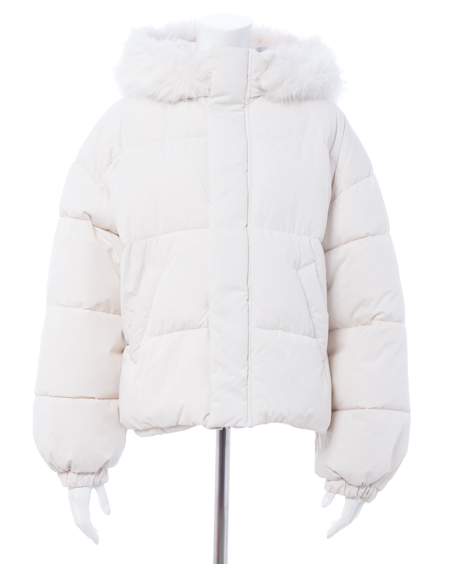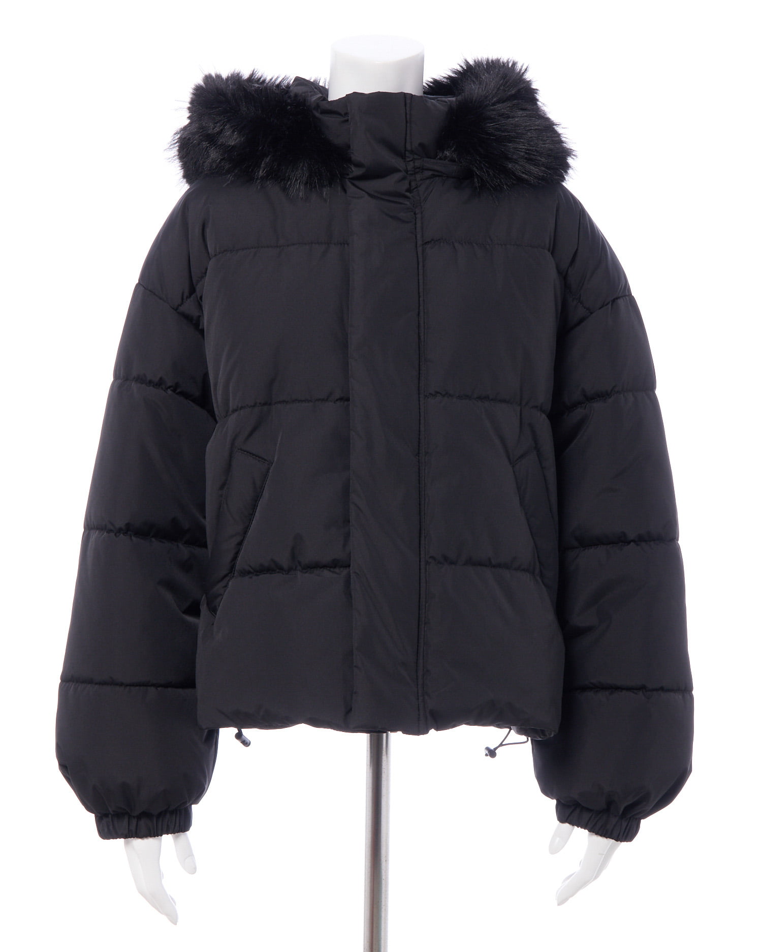 大きめフードにふわふわのエコファーがついた、ボリューミーな中綿ダウンジャケットです。