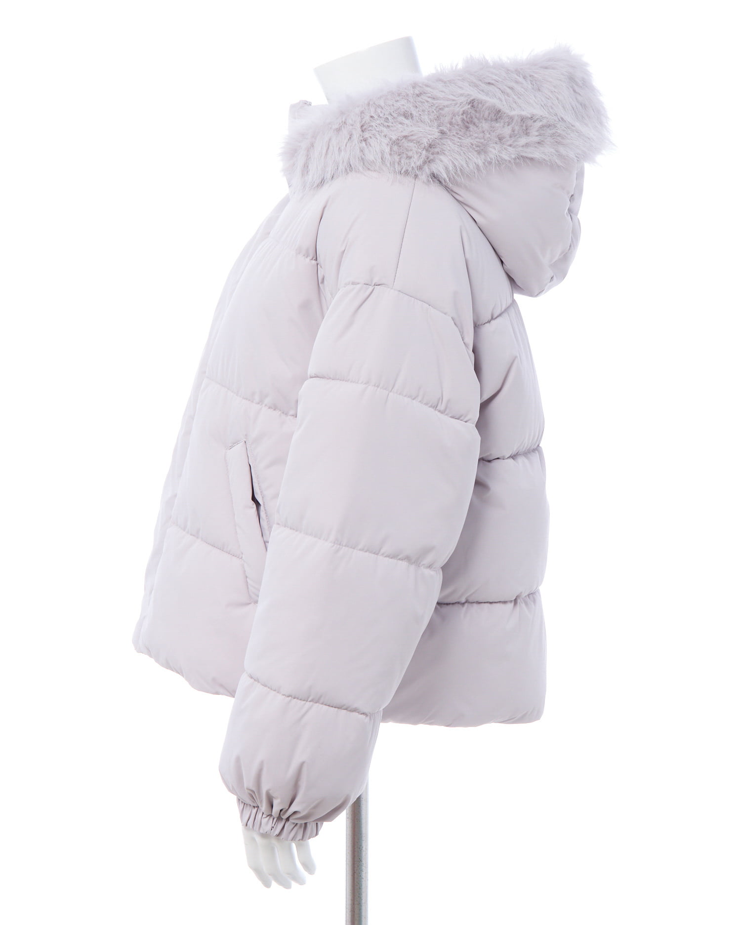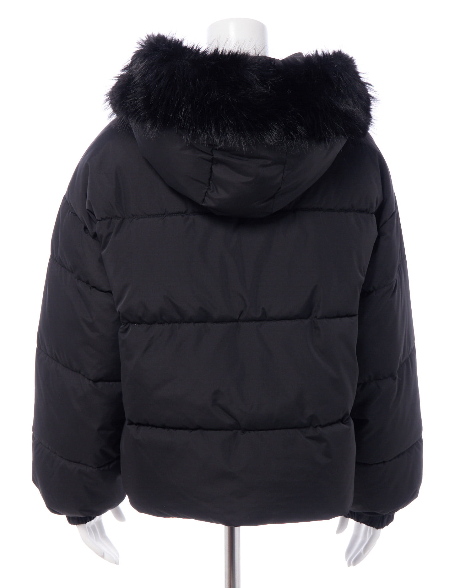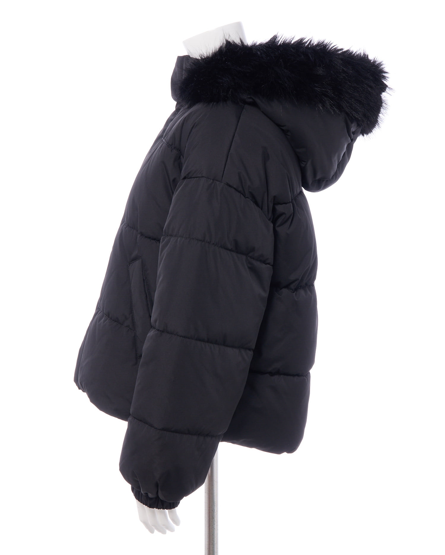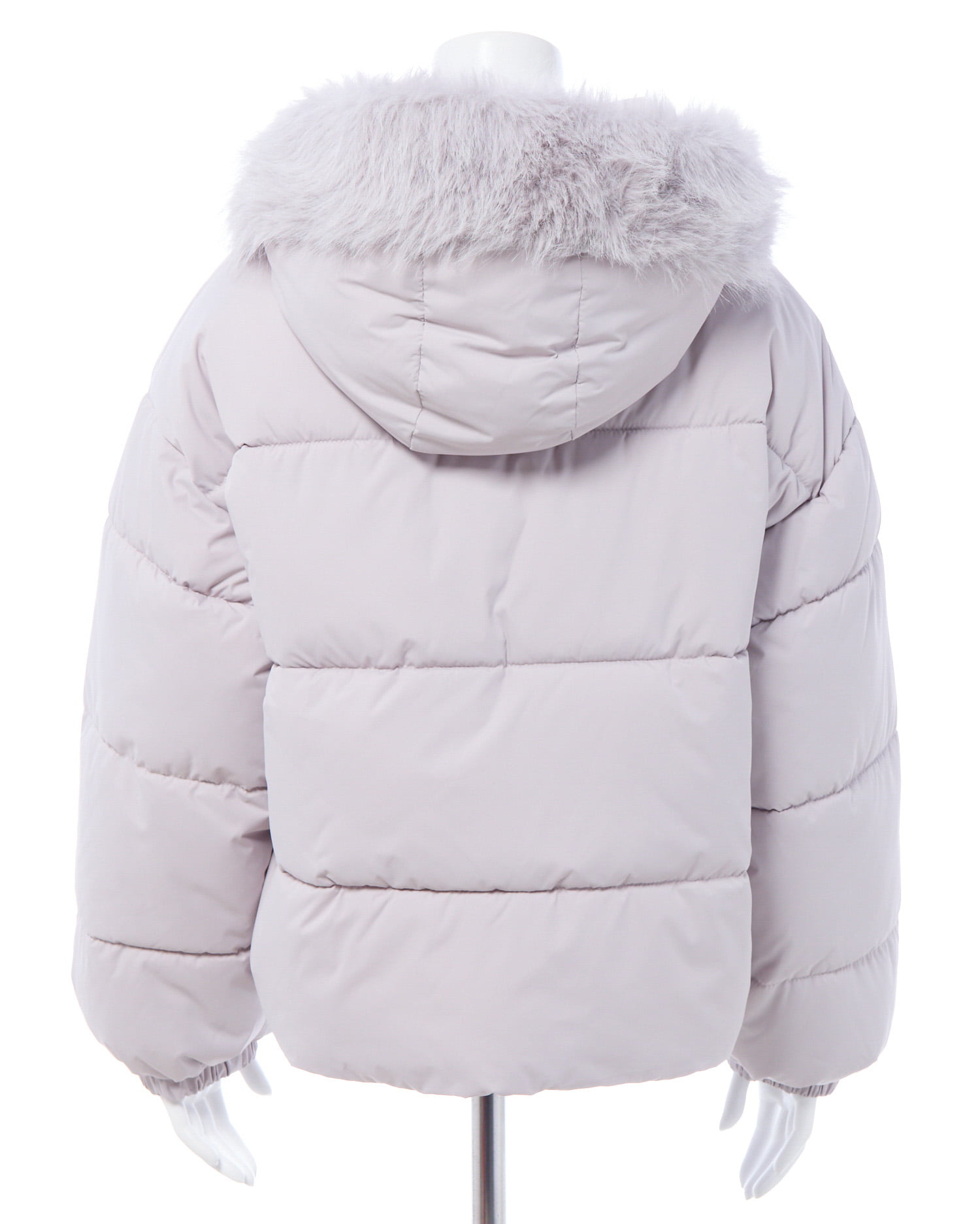 大きめフードにふわふわのエコファーがついた、ボリューミーな中綿ダウンジャケットです。
