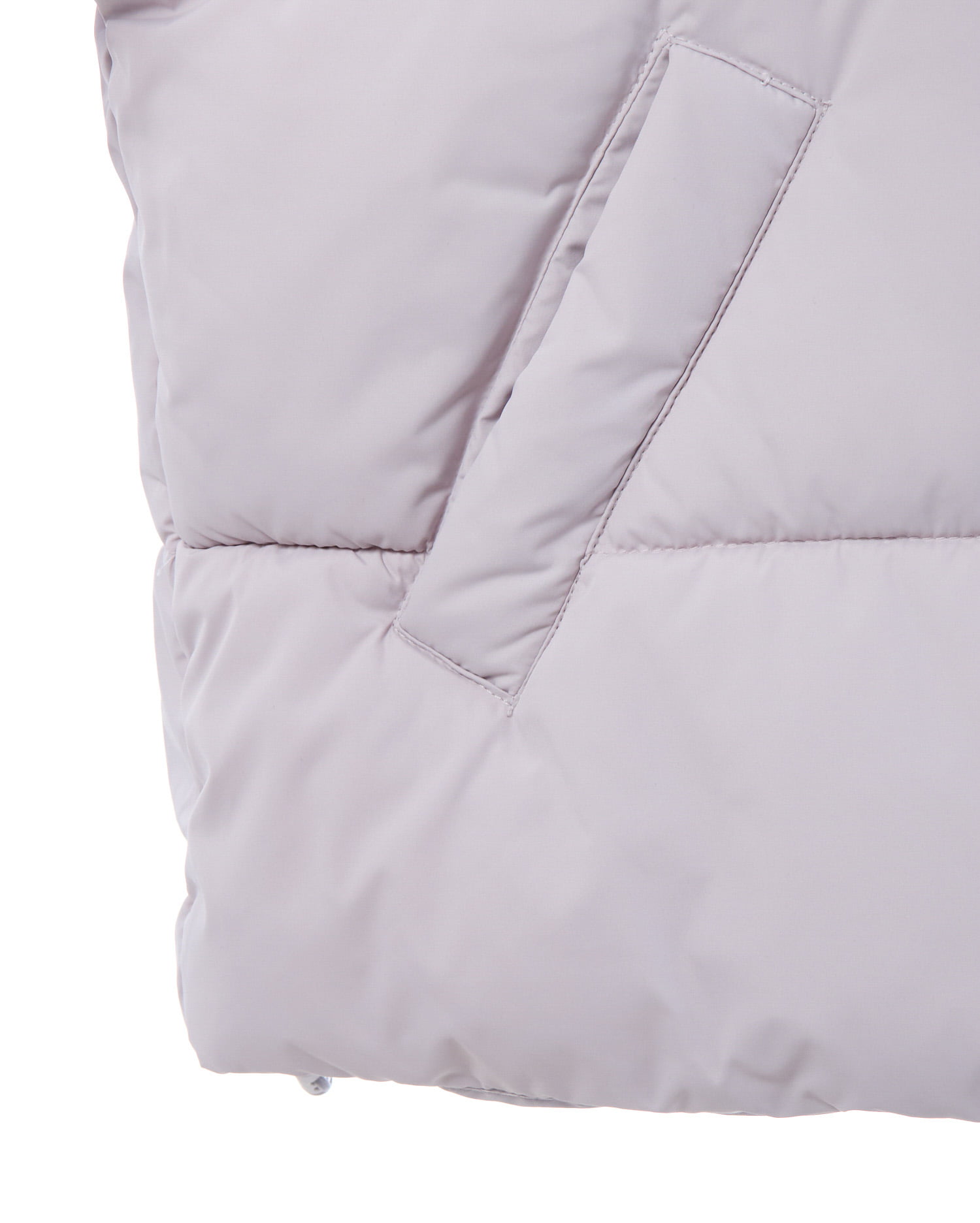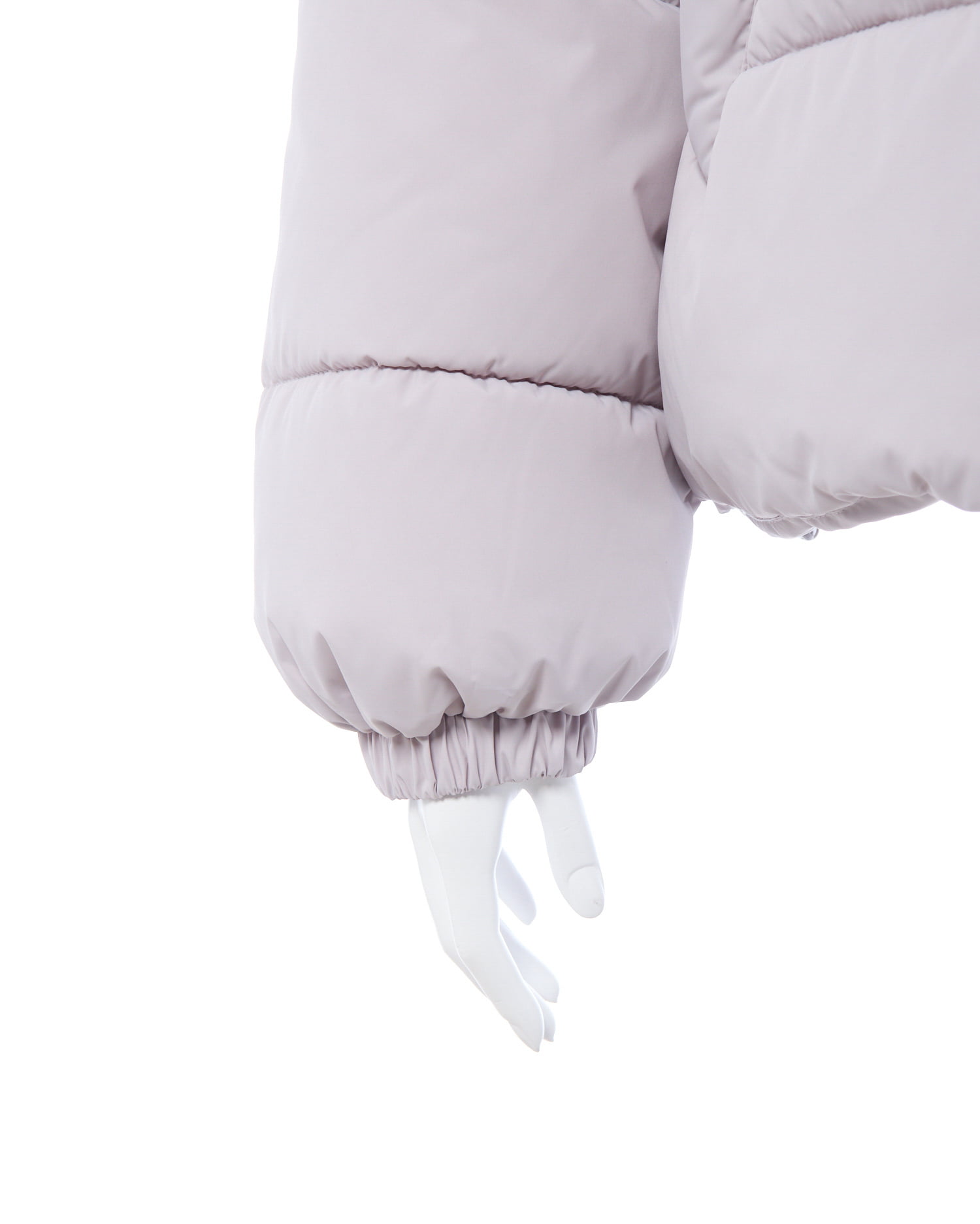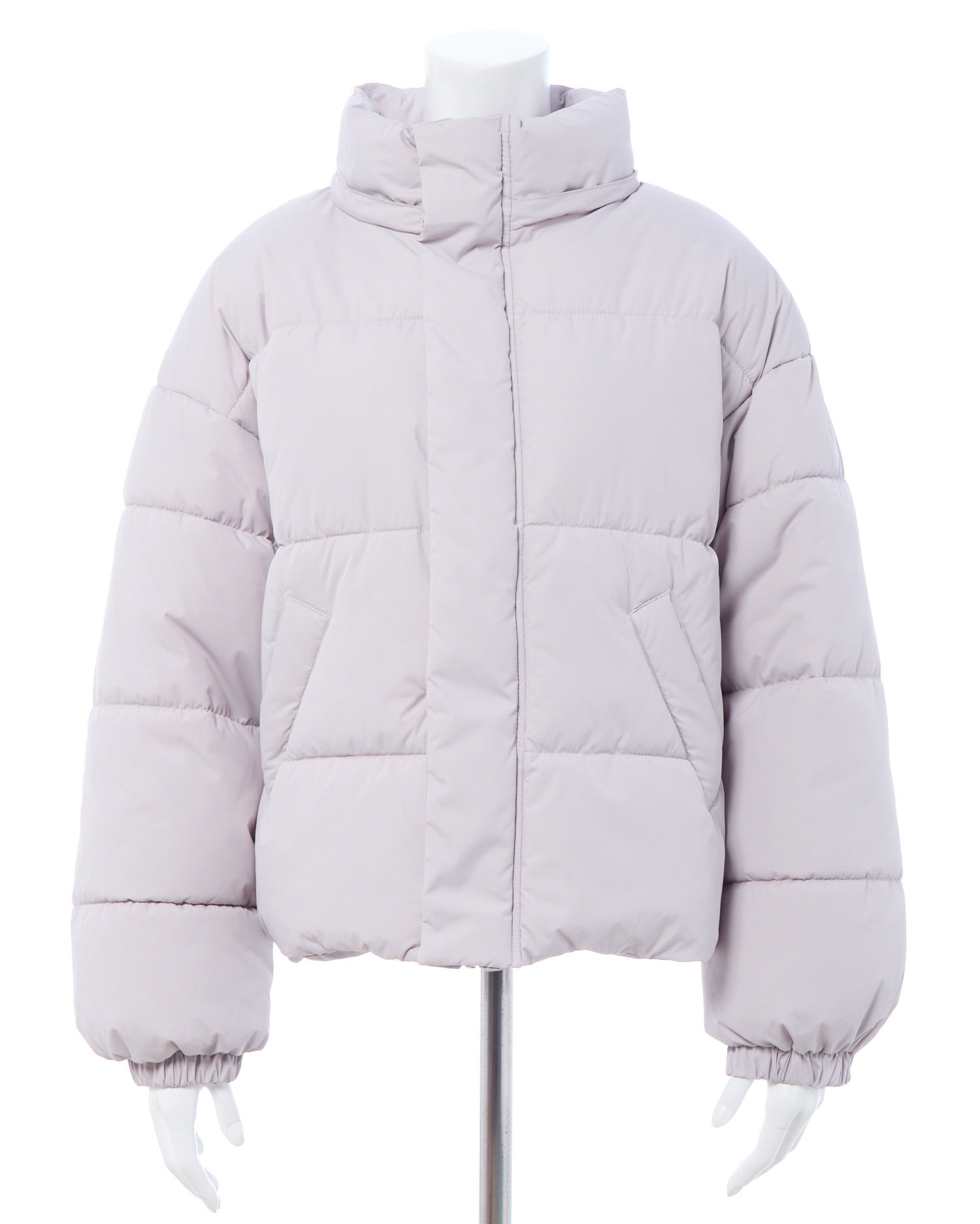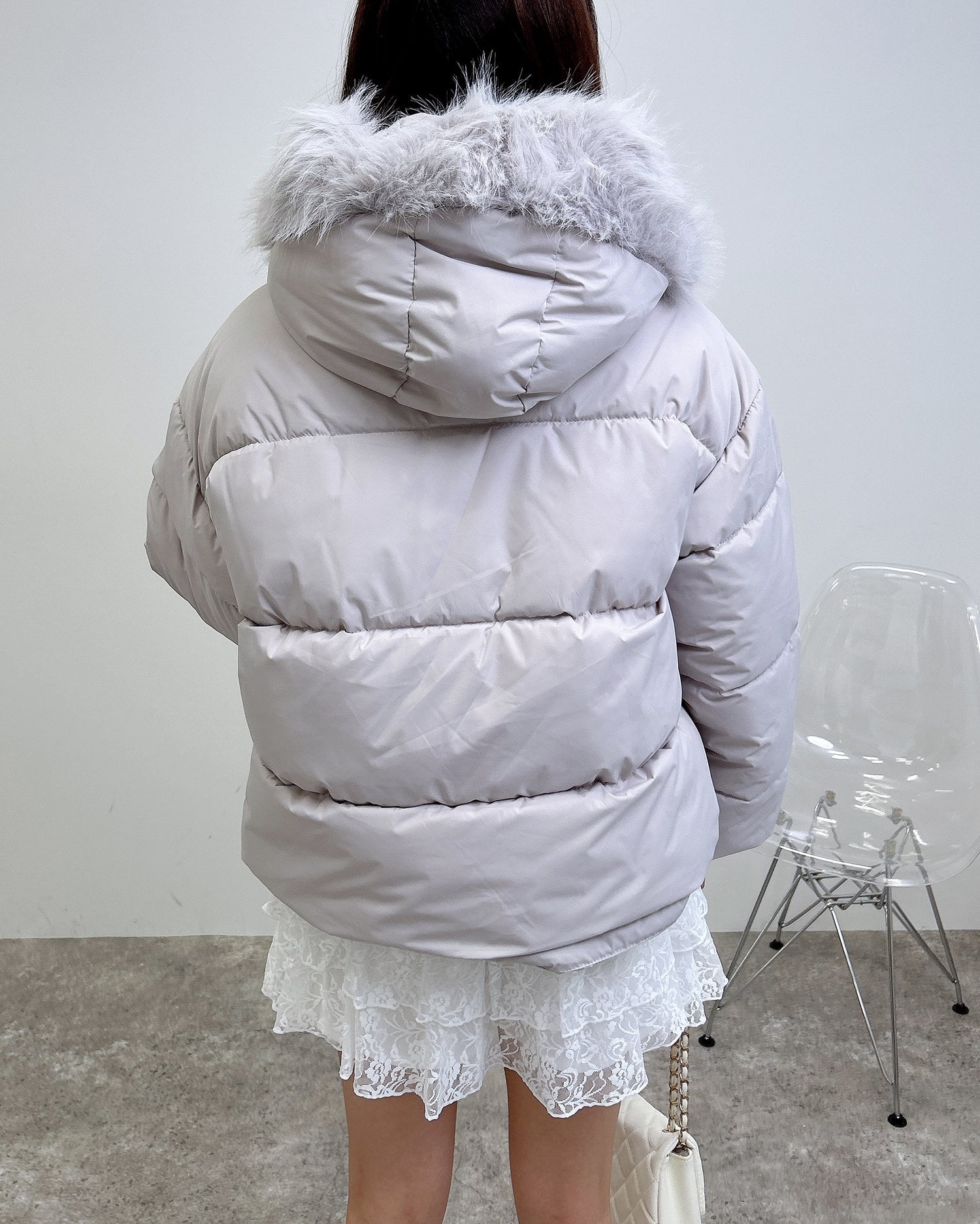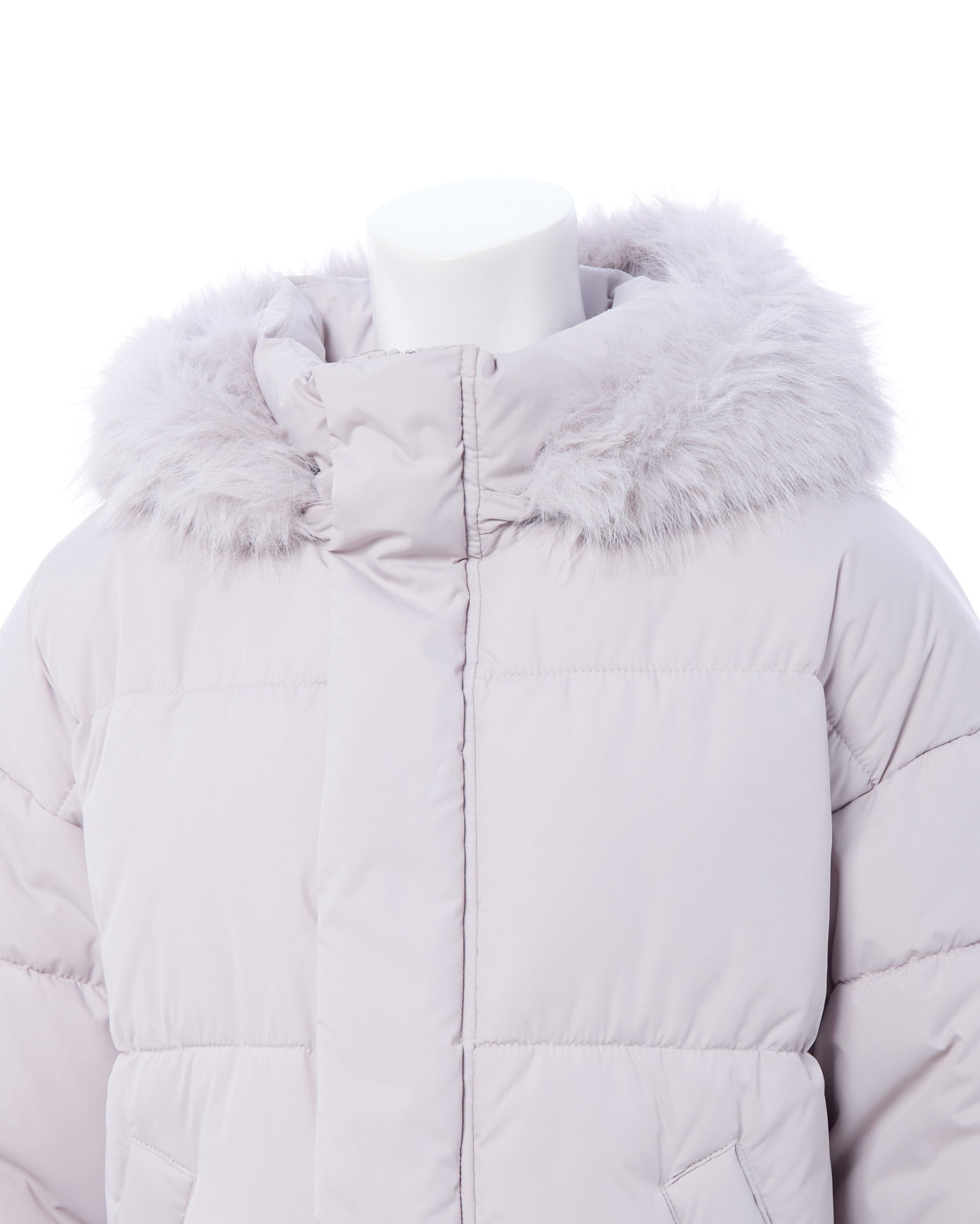 大きめフードにふわふわのエコファーがついた、ボリューミーな中綿ダウンジャケットです。