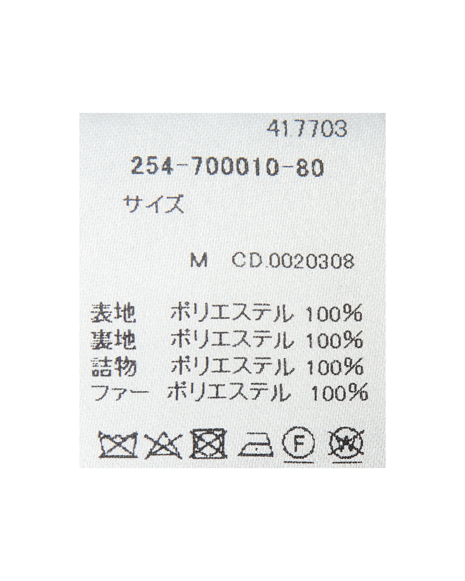 原産国 中国 表地 ポリエステル100% 裏地 ポリエステル100% 詰め物 ポリエステル100% ファー ポリエステル100%
